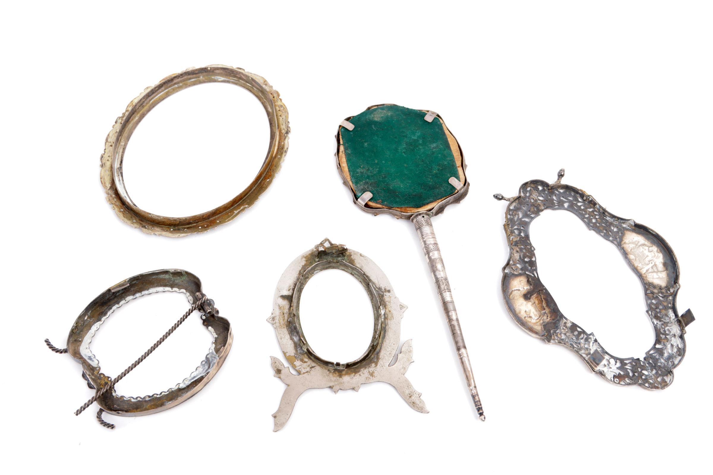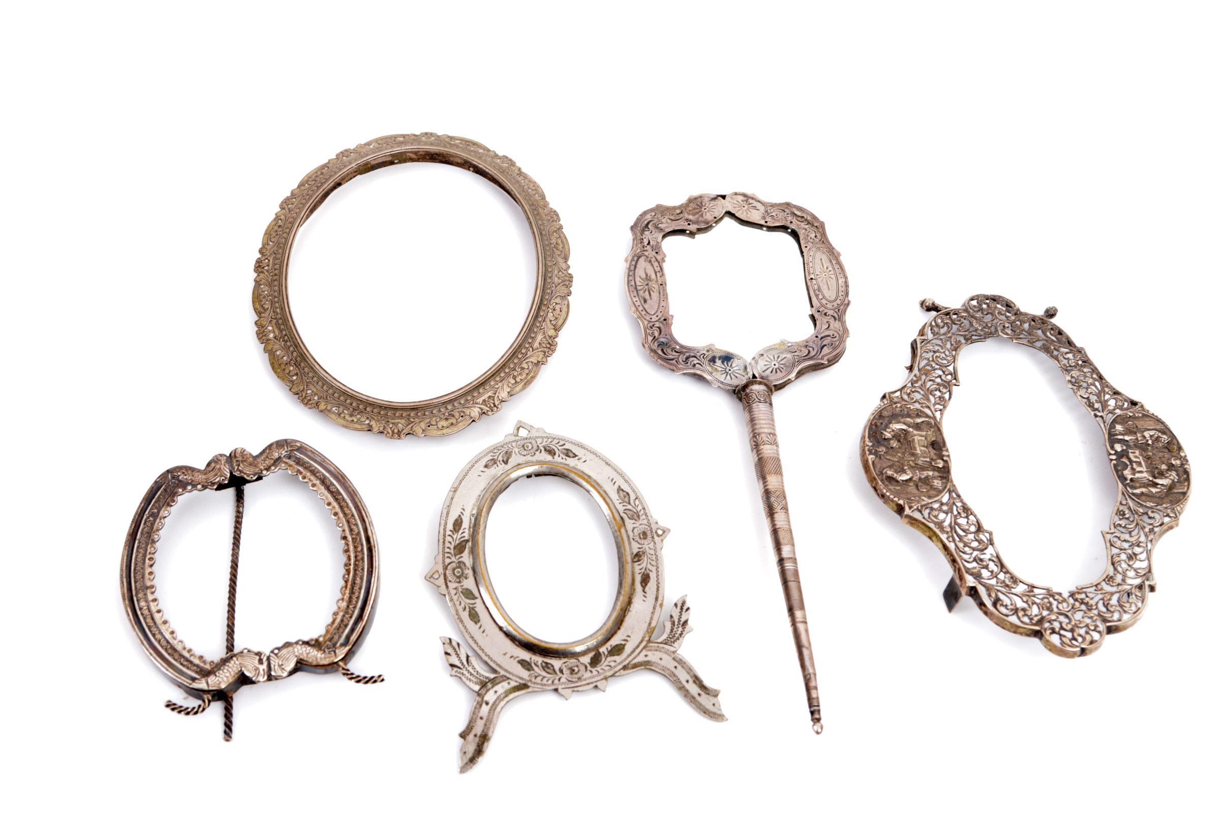 4 Antieke fotolijsten w.o. zilver en een spiegel vervaardigd van een beursbeugel