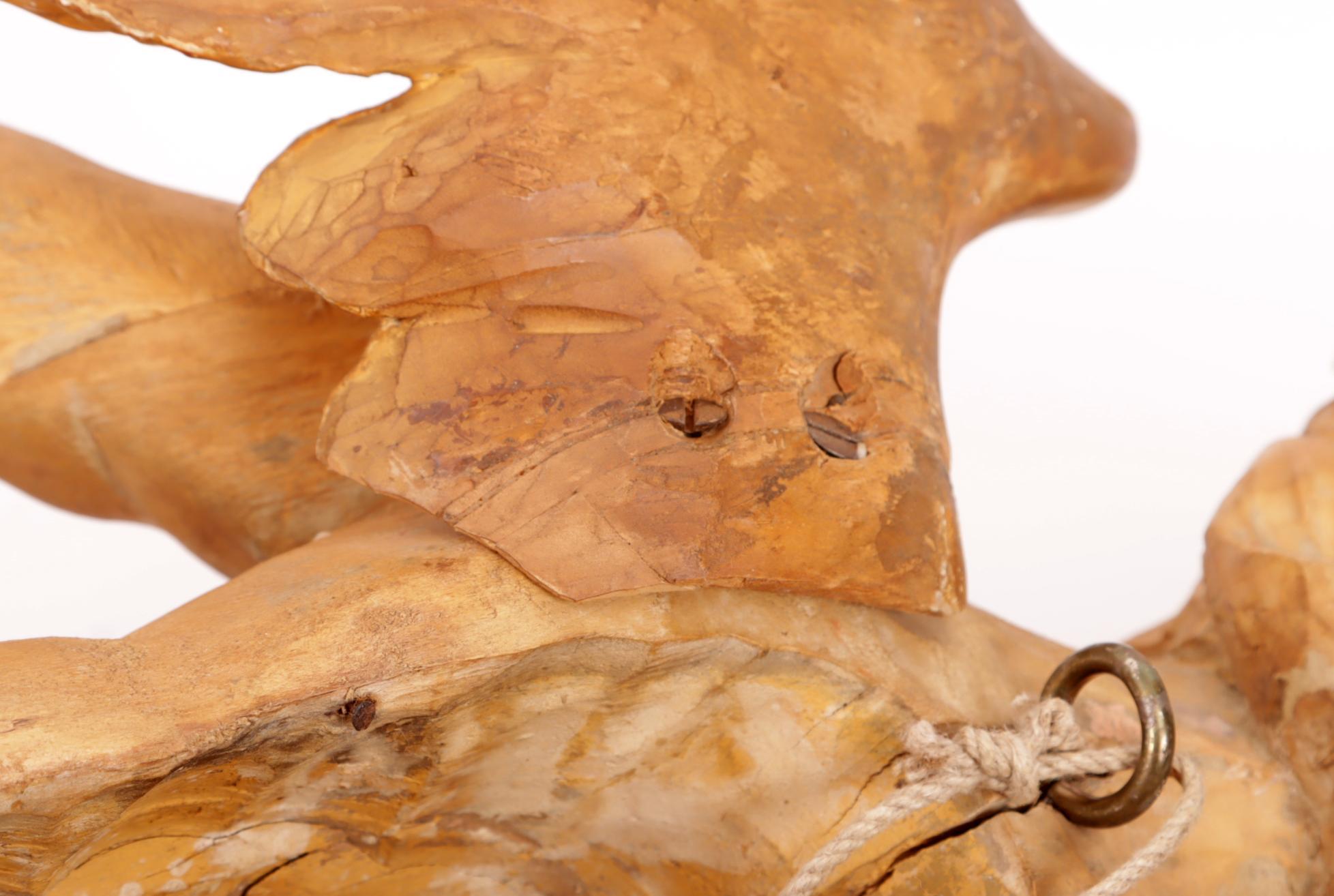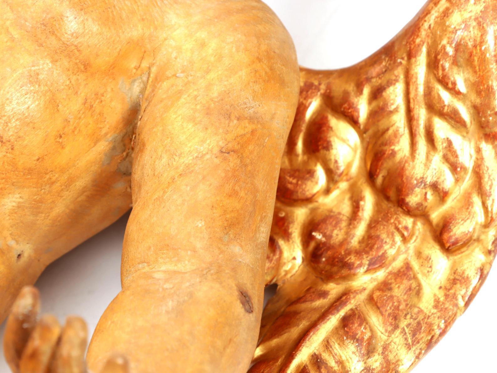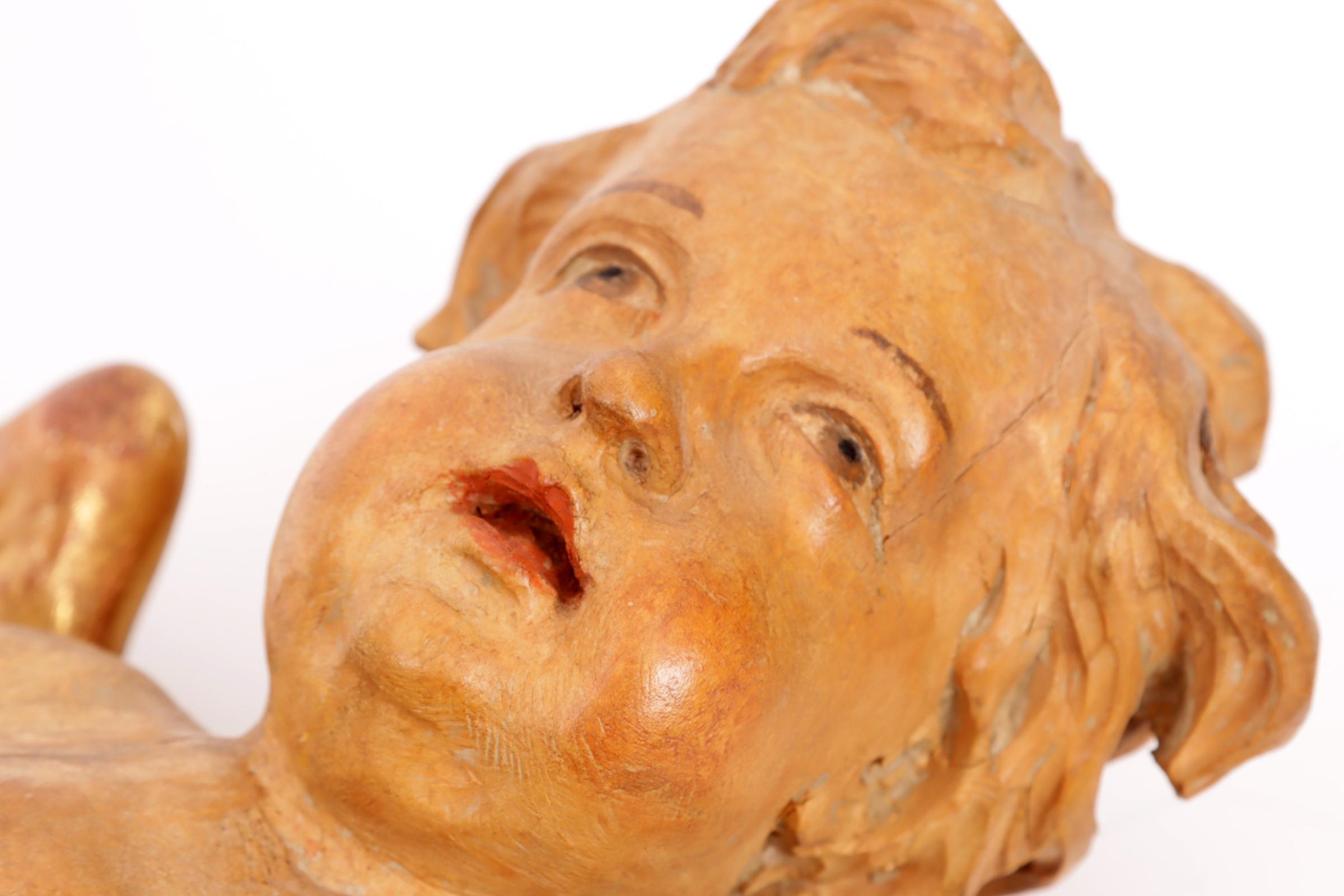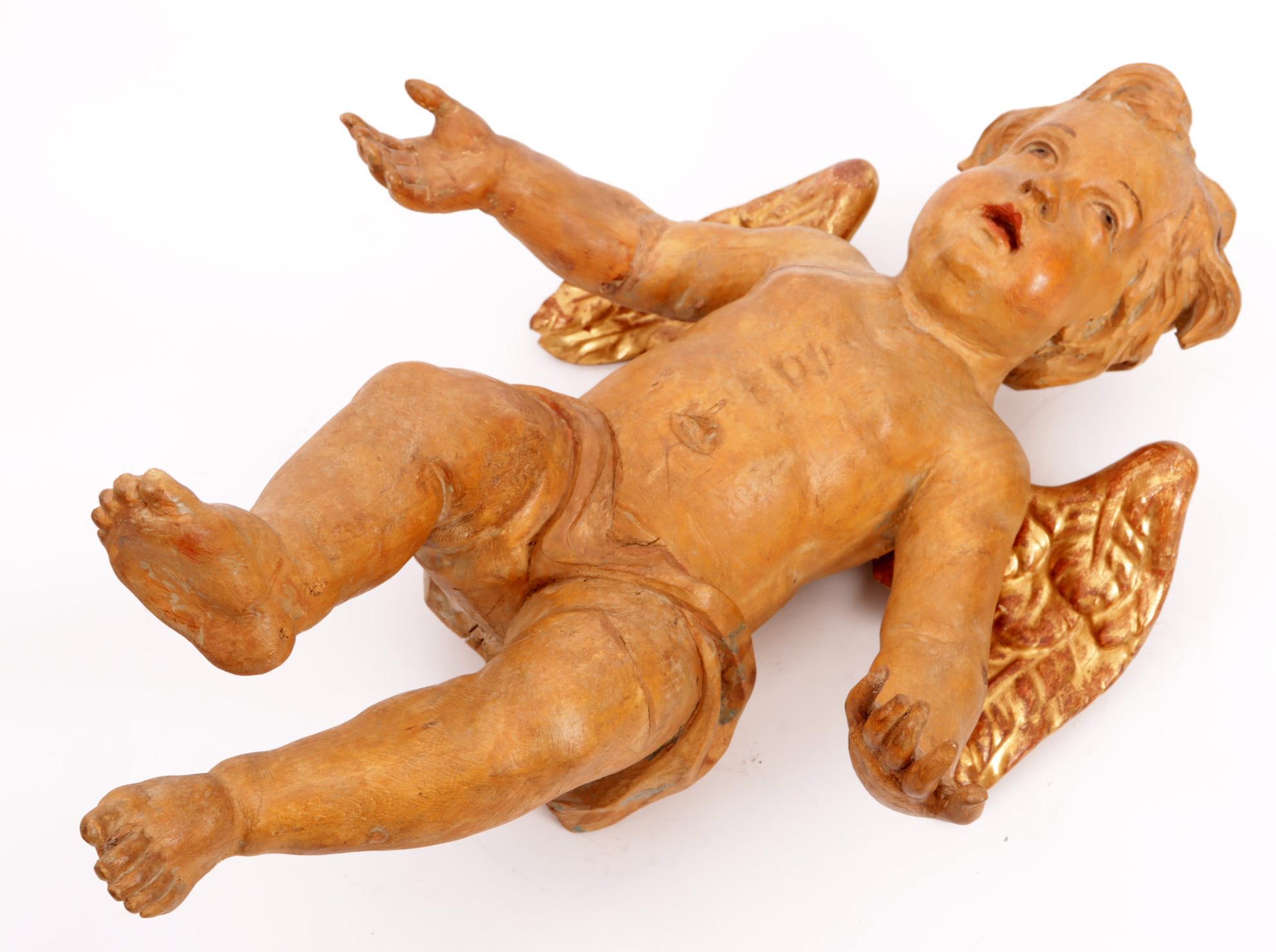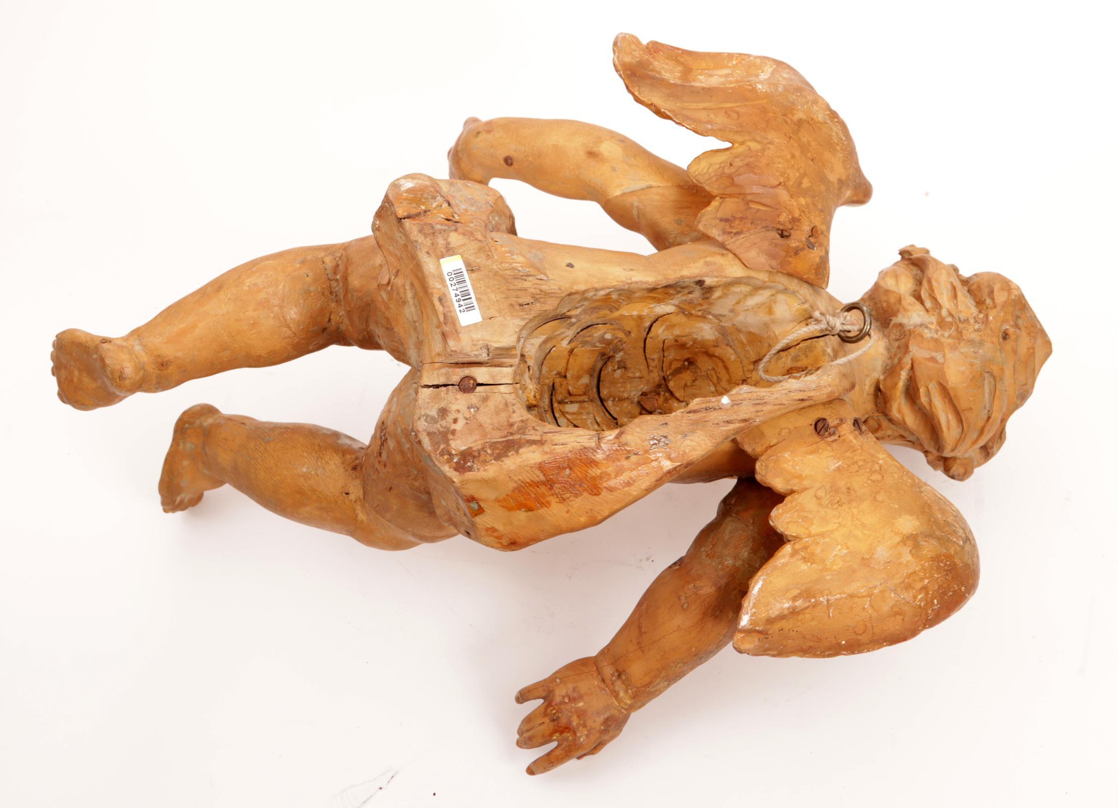 Antiek vruchtboomhouten engel, 18e/19e eeuw met twee vleugels (latere datum), h.54 cm.
