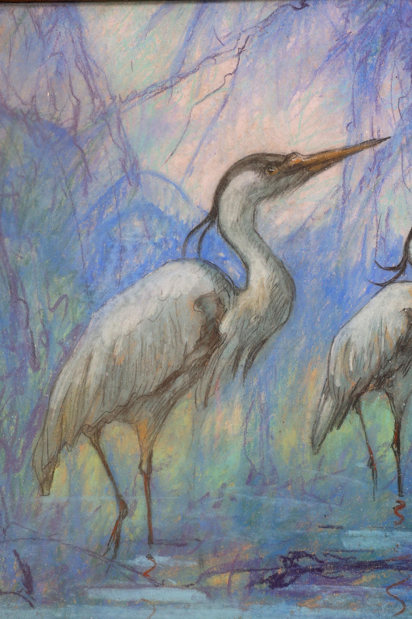 Abert Klein Sprokkelhorst (1887-1968), Reigers aan het water, pasteltekening, 51,5 x 42 cm.