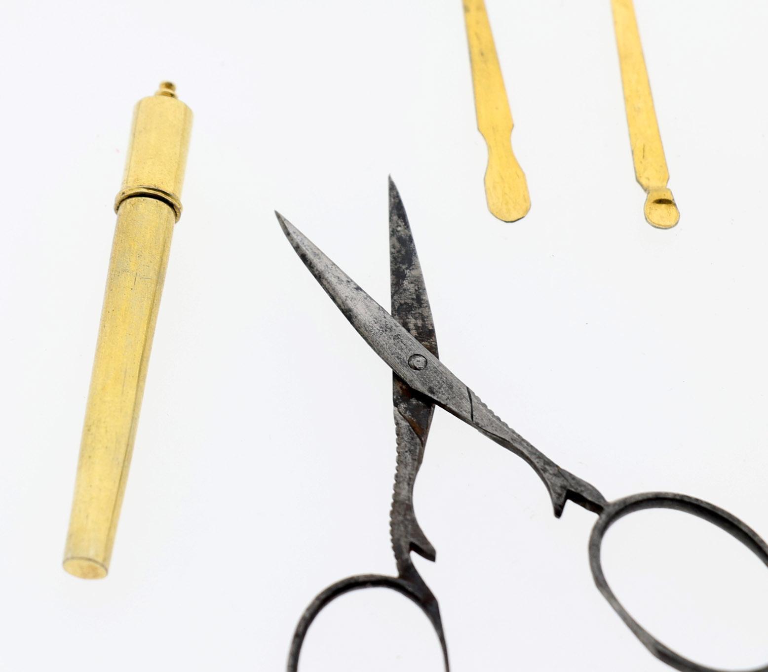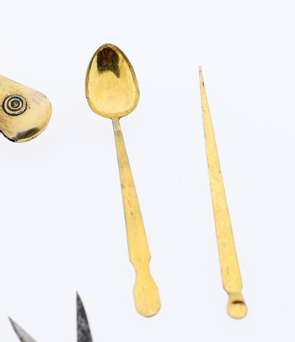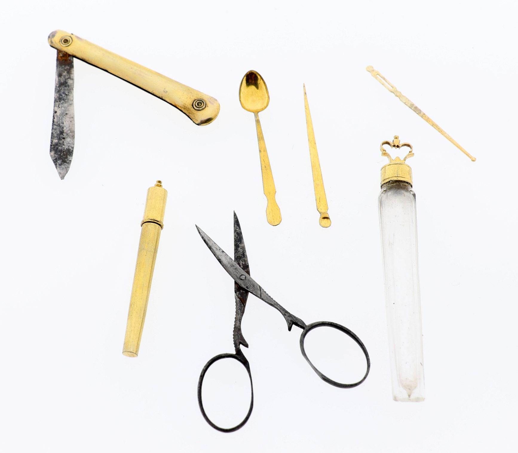 Verguld zilveren naai-etui met diverse vergulde instrumenten en flacon, Parijs, 1784-1789, gestileerd met bloemen en golvende lijnen, Louis XV-stijl, makermerk : ZT
