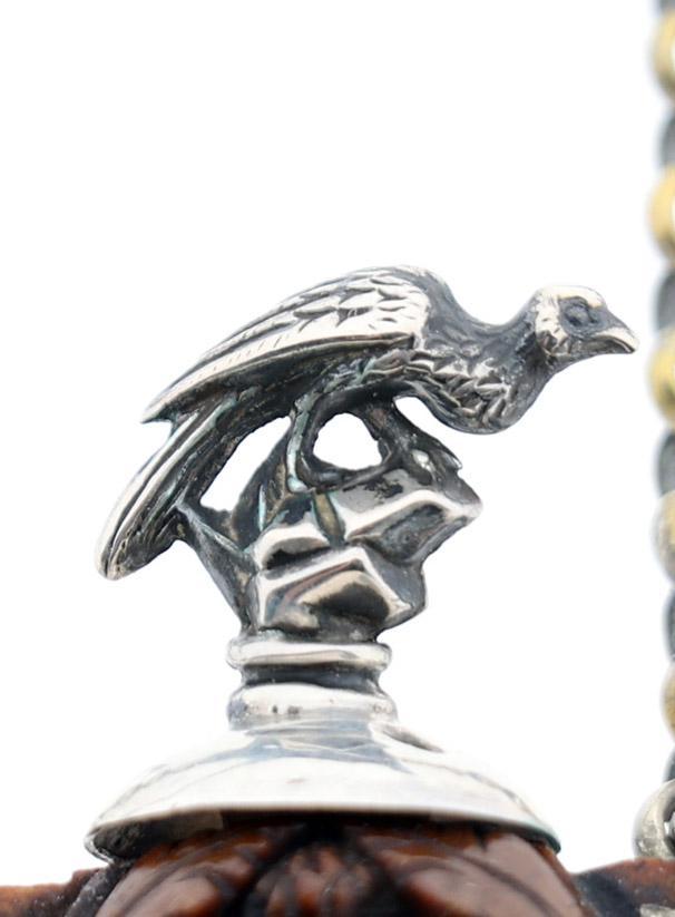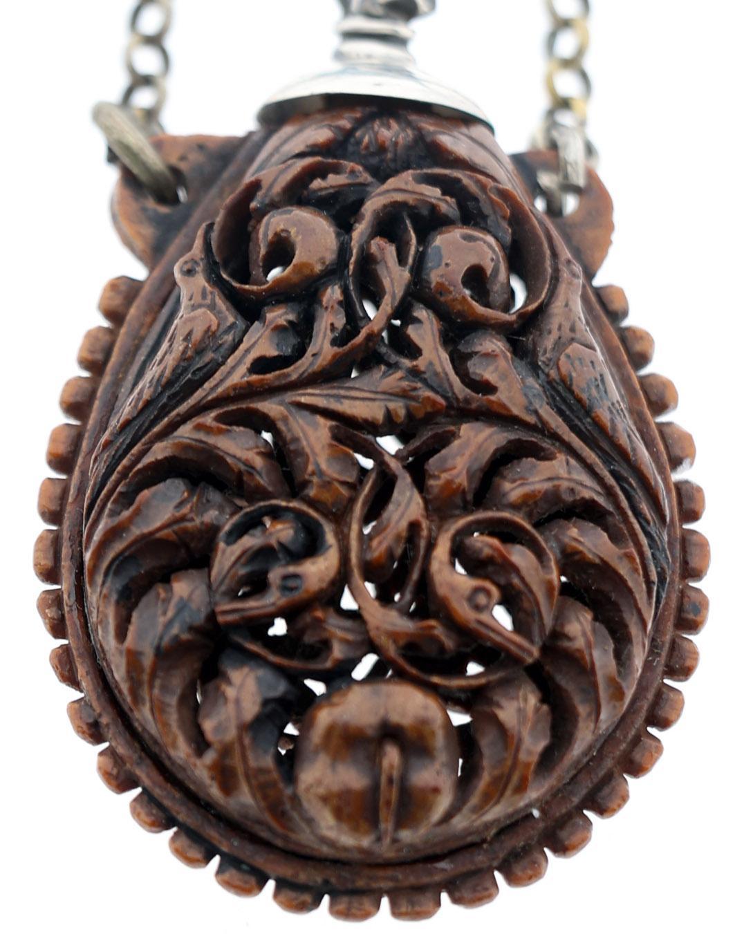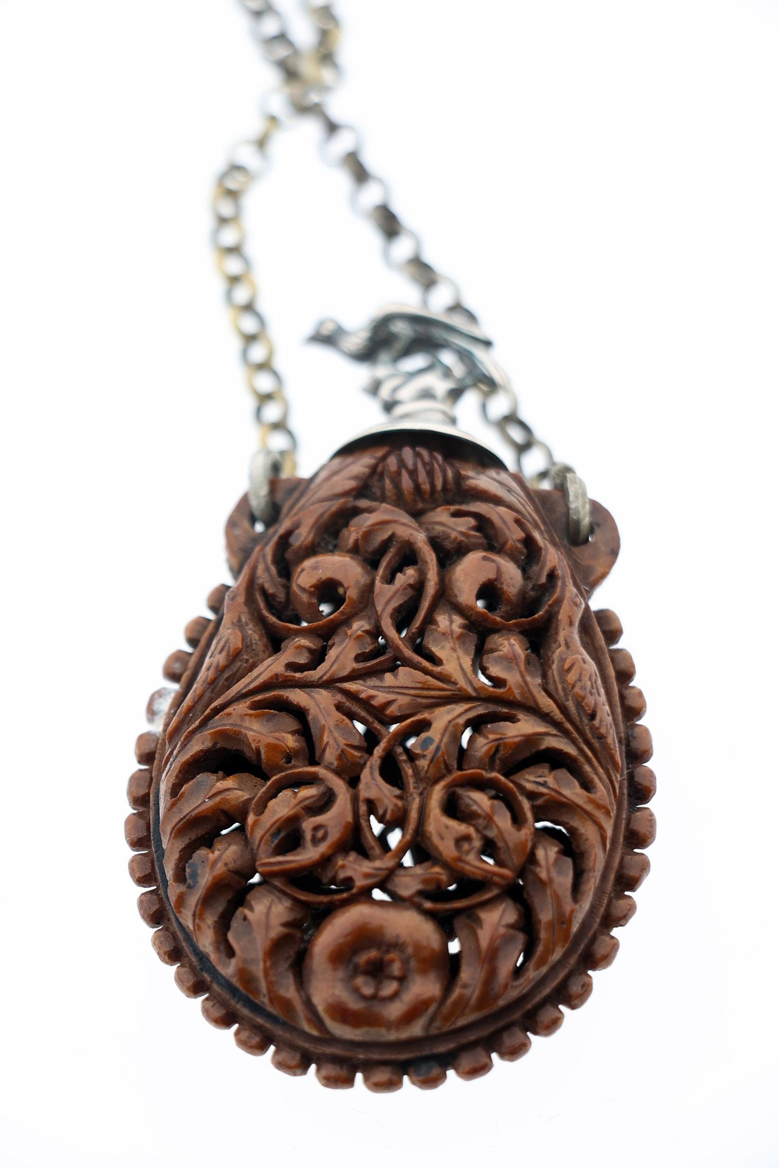 Rijkbewerkte druppelvormige coquille reukdoosje met zilveren dop i.v.v. vogel aan lange zilver ketting, Frankrijk ca.1800