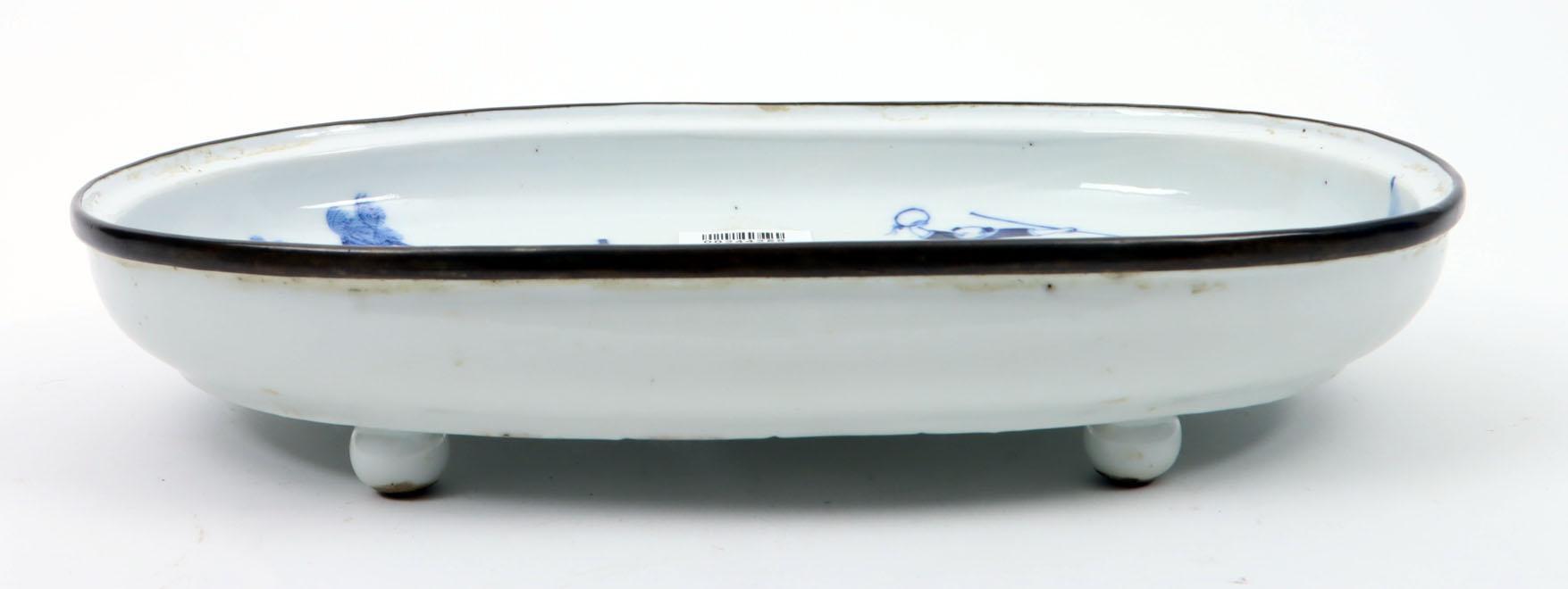 Blauw/wit Chinees porseleinen schotel op pootjes met figuratieve voorstelling, 28,5 x 20 x 5,5 cm.