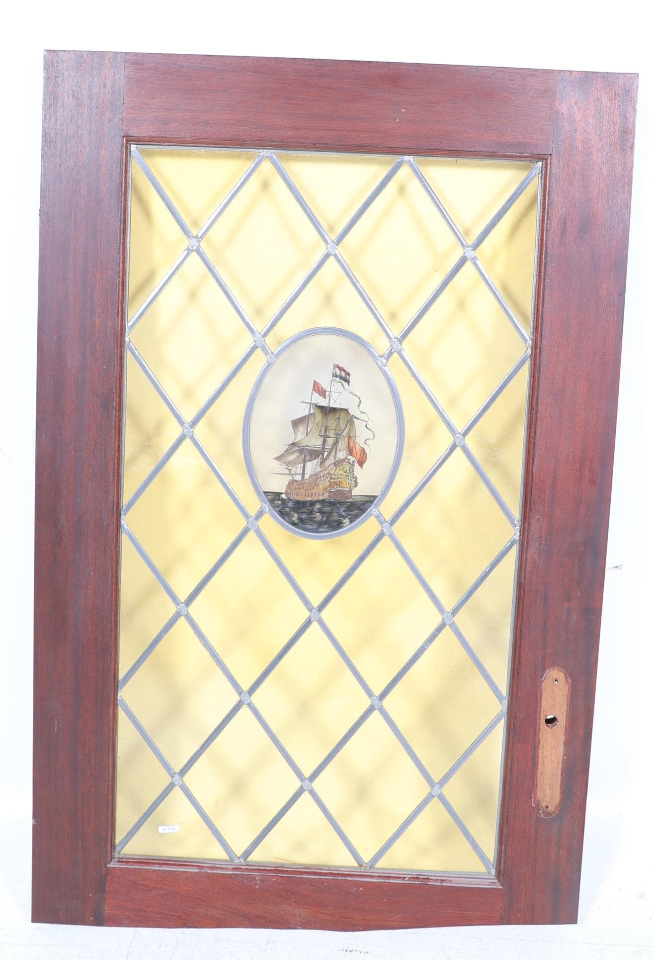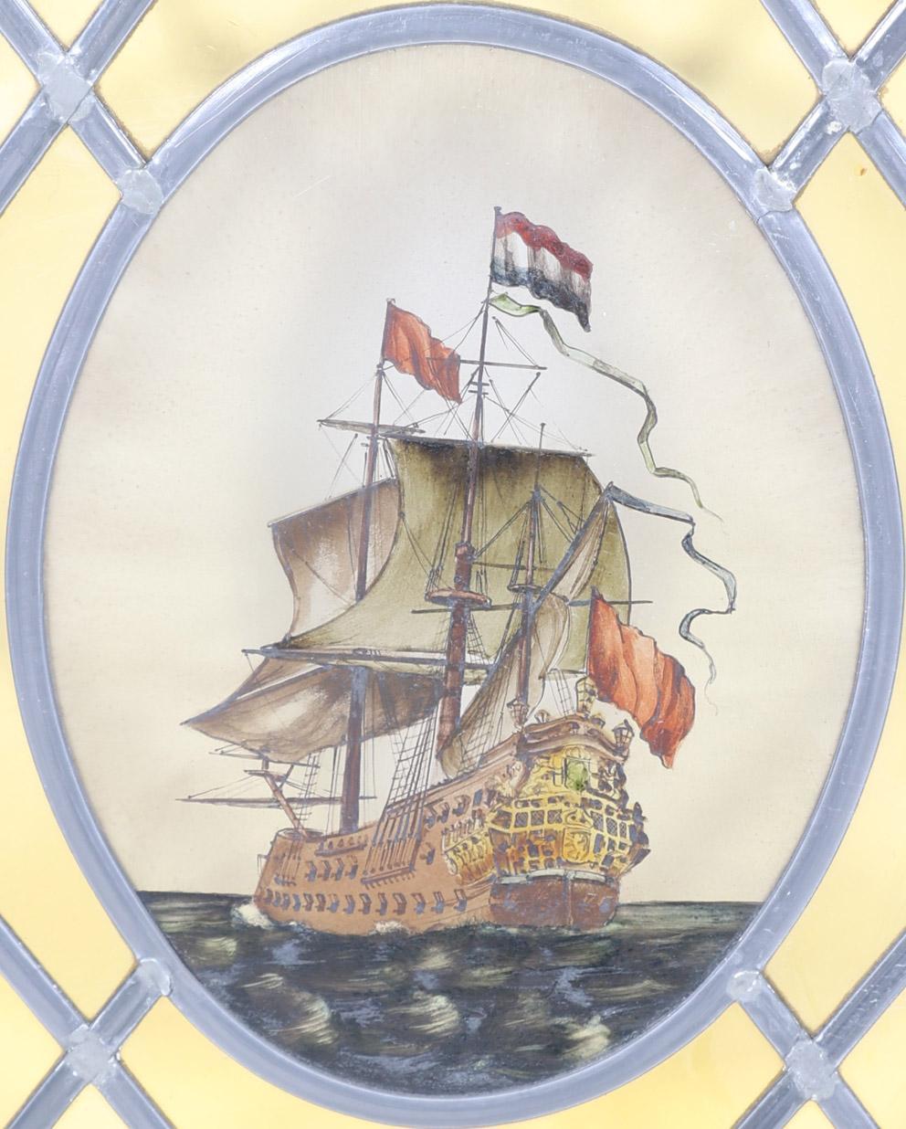 Oud glas-in-lood ruit met gebrandschilderd schip, h.110 x b.61 cm.(ruit) met kozijn 134 x 86 cm.