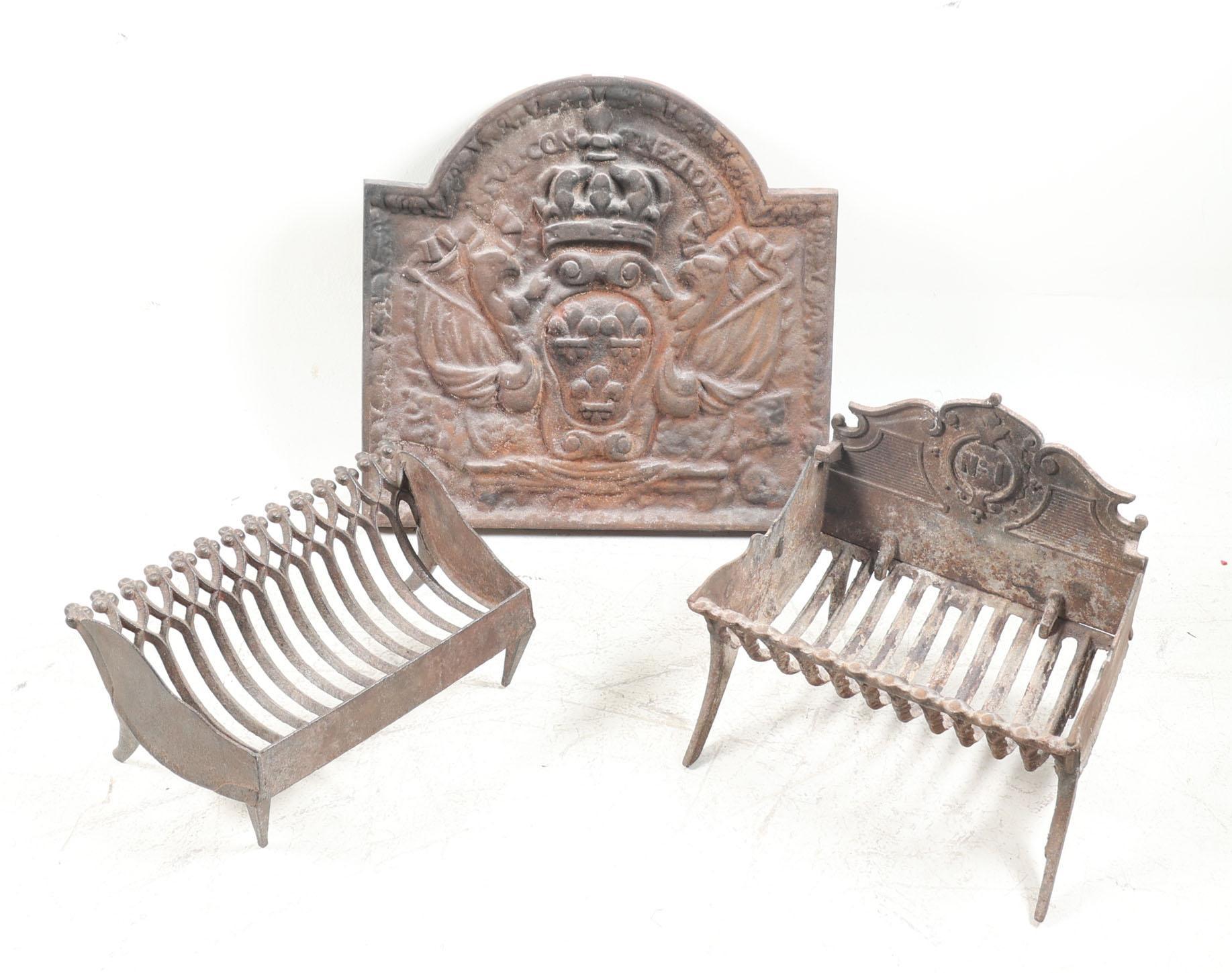 Antieke metalen haardplaat, 48 x 49 cm. en twee vuurkorven