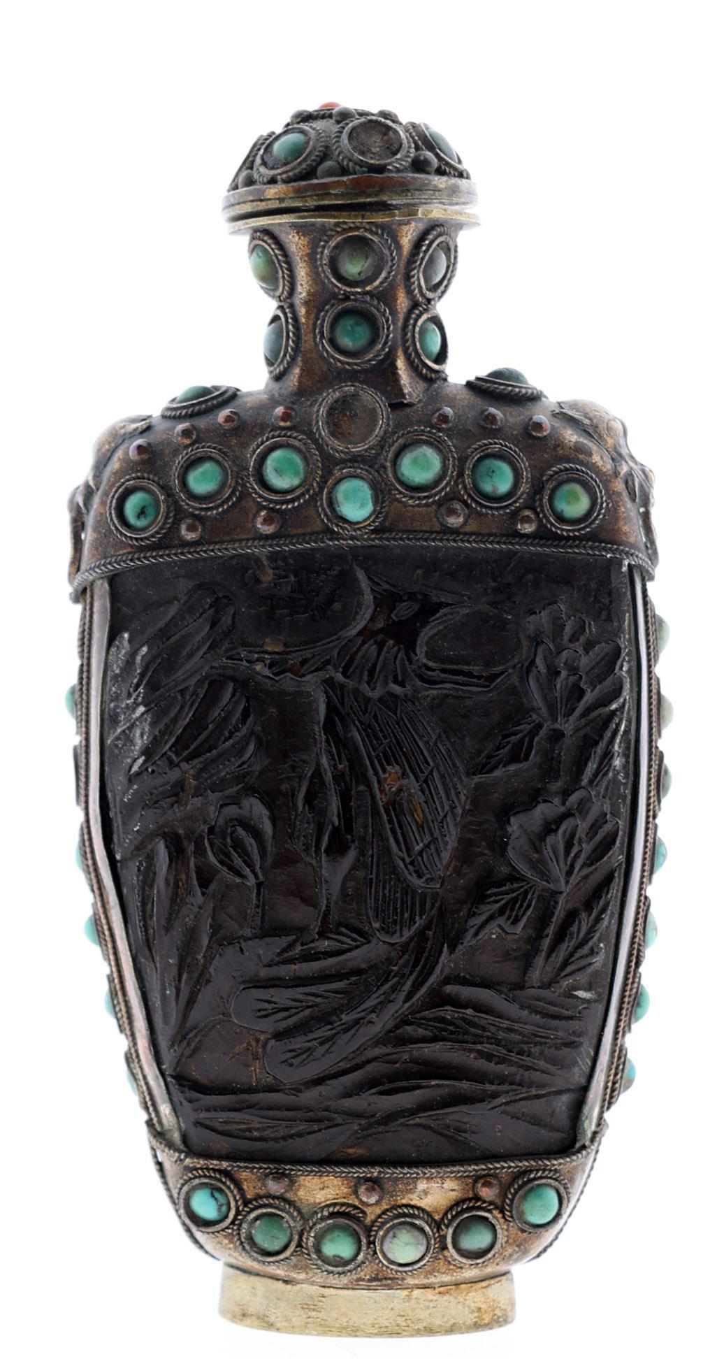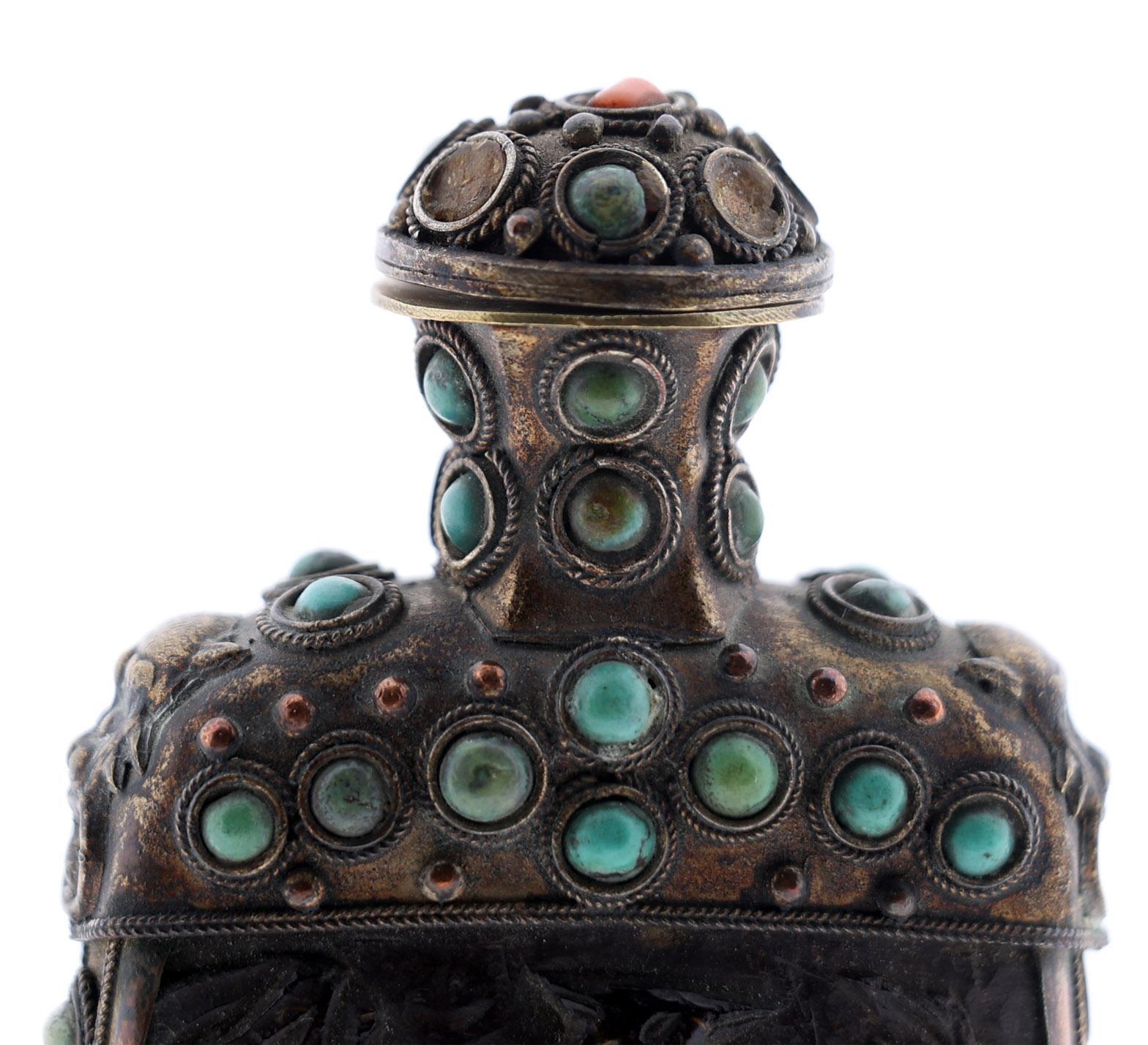 Nepalees houten gesneden odeurflacon afgewerkt met koper en turkooizen steentjes, h 11 cm