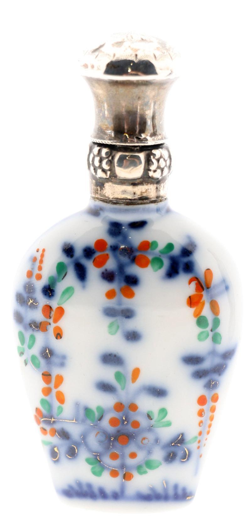 2 Porseleinen Amsterdams Bont odeurflacons met zilveren doppen, h.10,5 en 7,5 cm.