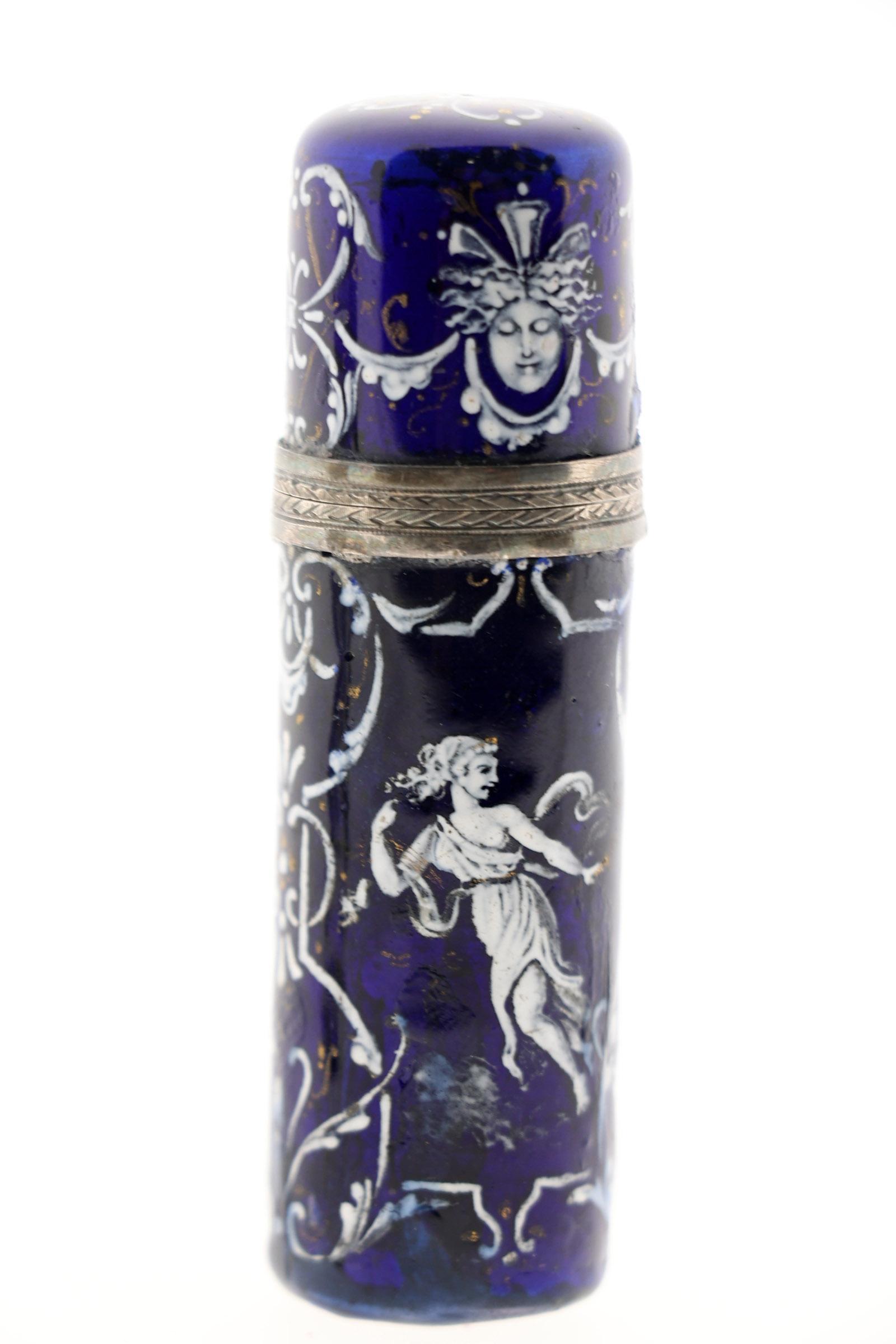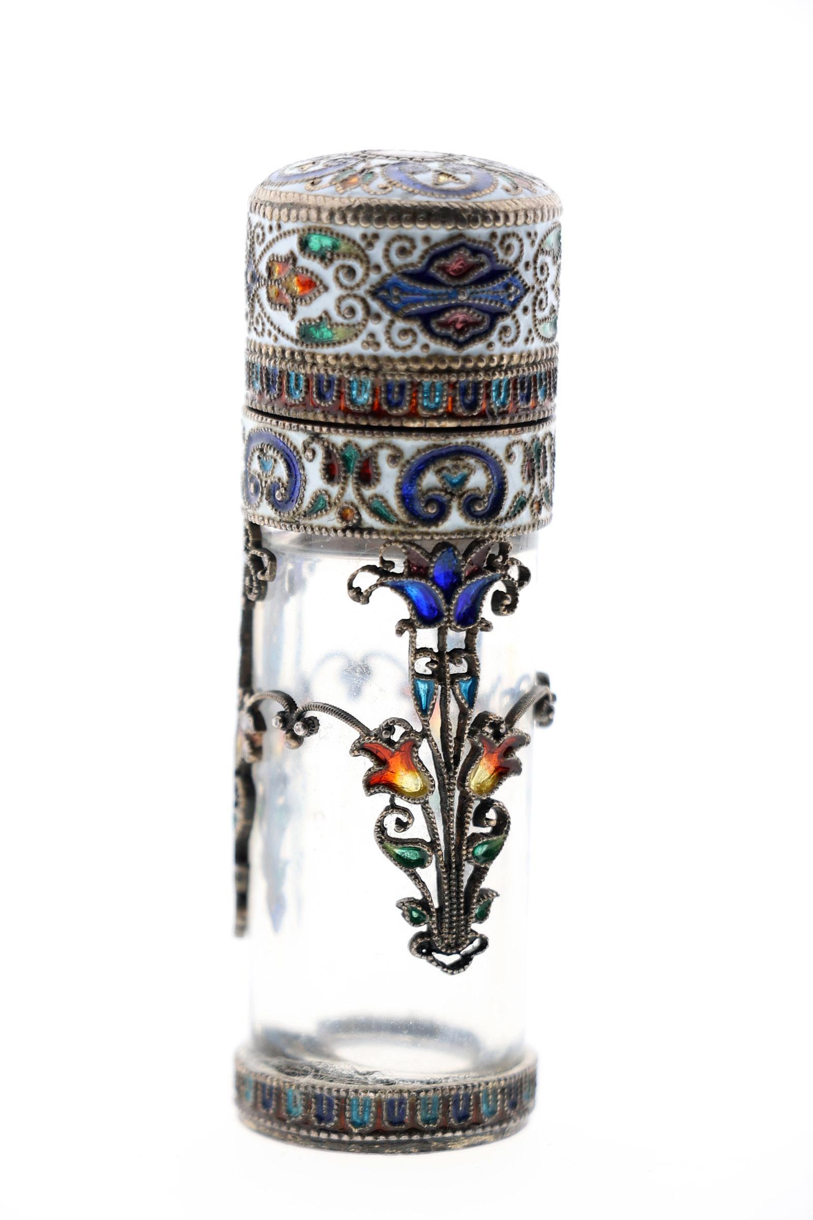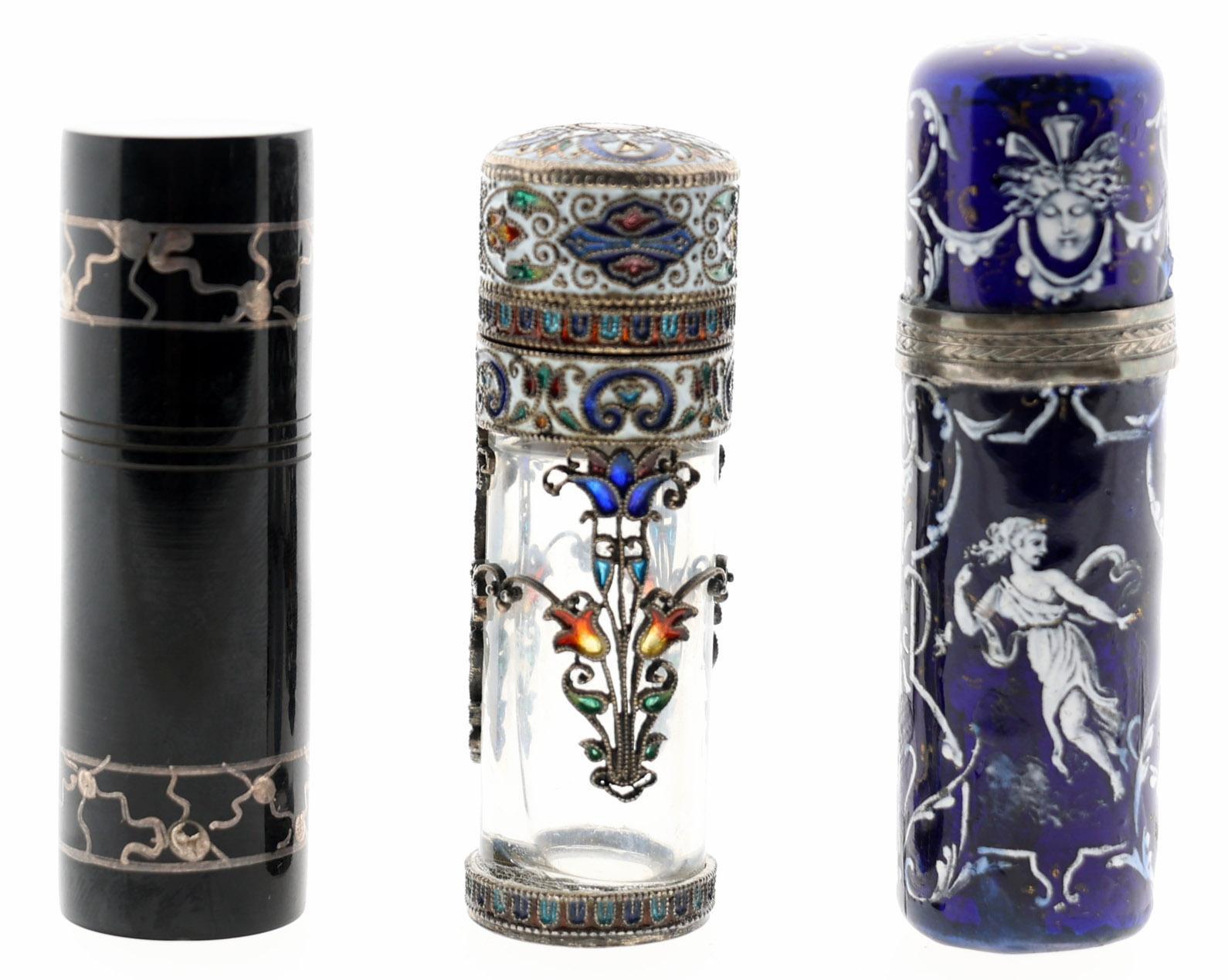 Koop van 3 antieke odeurflacons w.o. Oostenrijkse Cloisonné met emaille, ca. 1880, Franse blauw emaille met zilver en een kristallen flesje met doublé dop in houder
