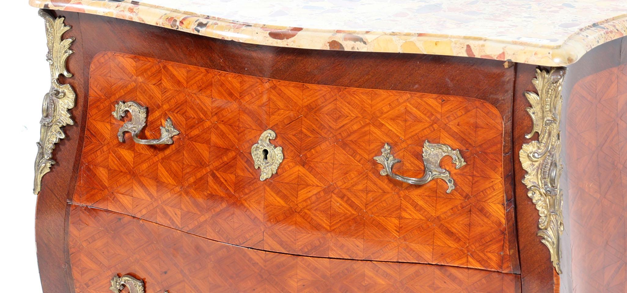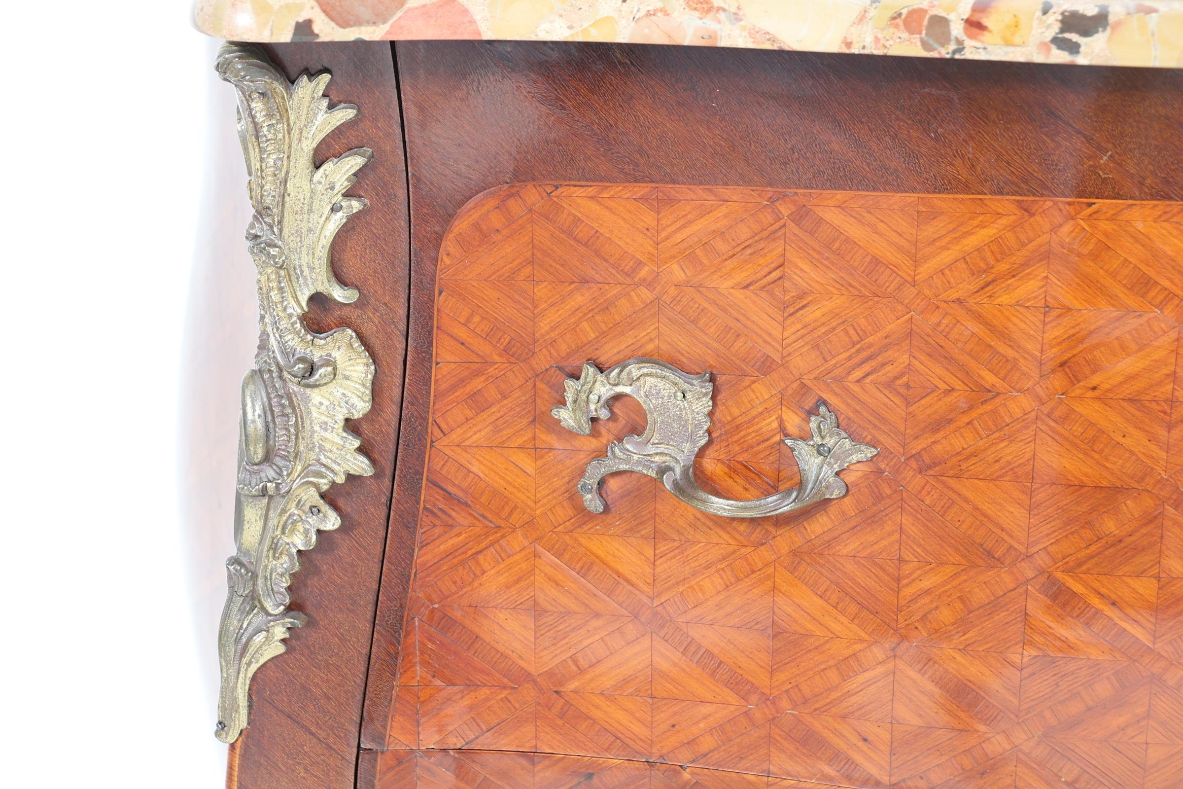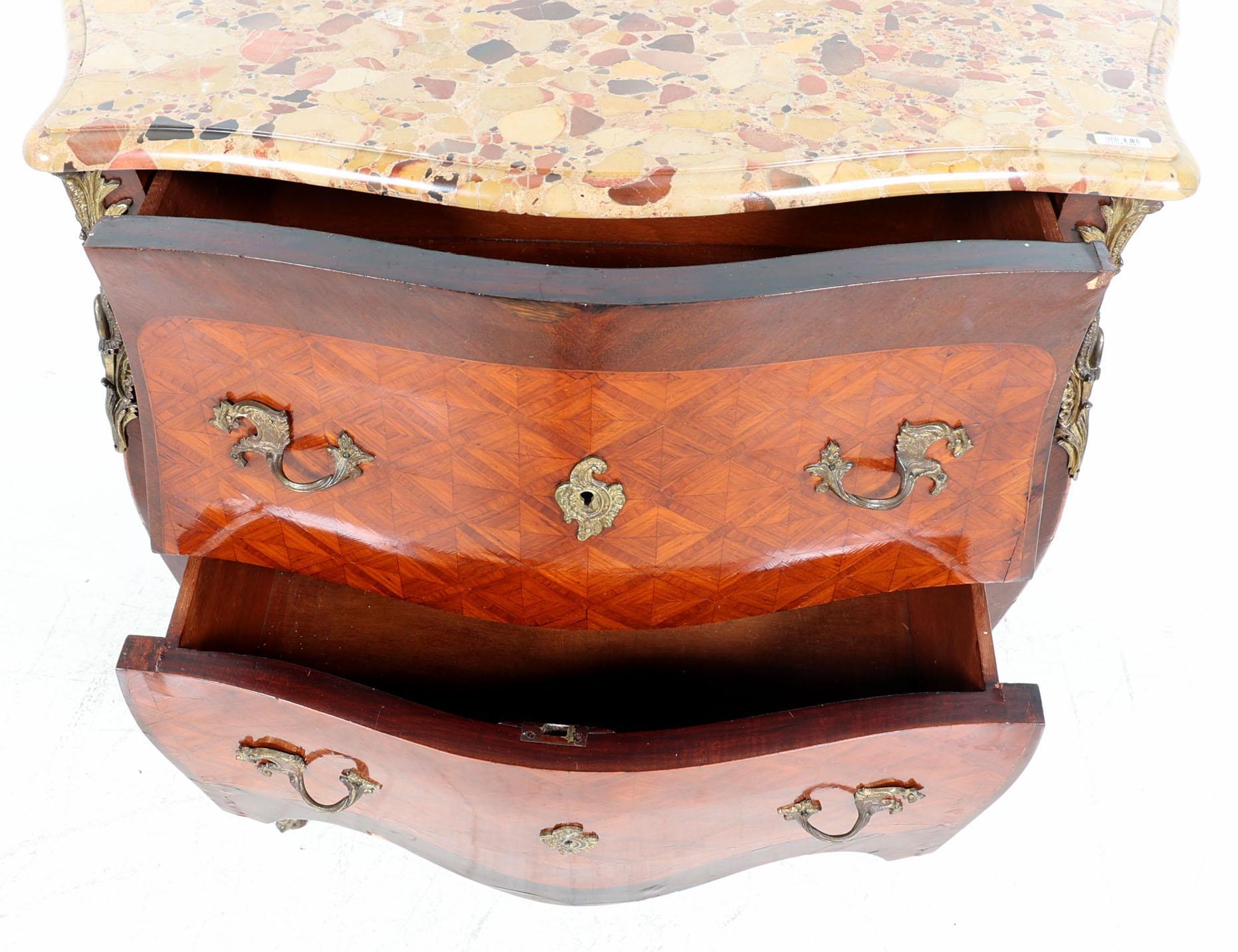 Oude ingelegde rozenhouten 2-laden commode met gemêleerd marmeren blad, Louis Quinze stijl, h.86 x b.80 x d.39 cm.