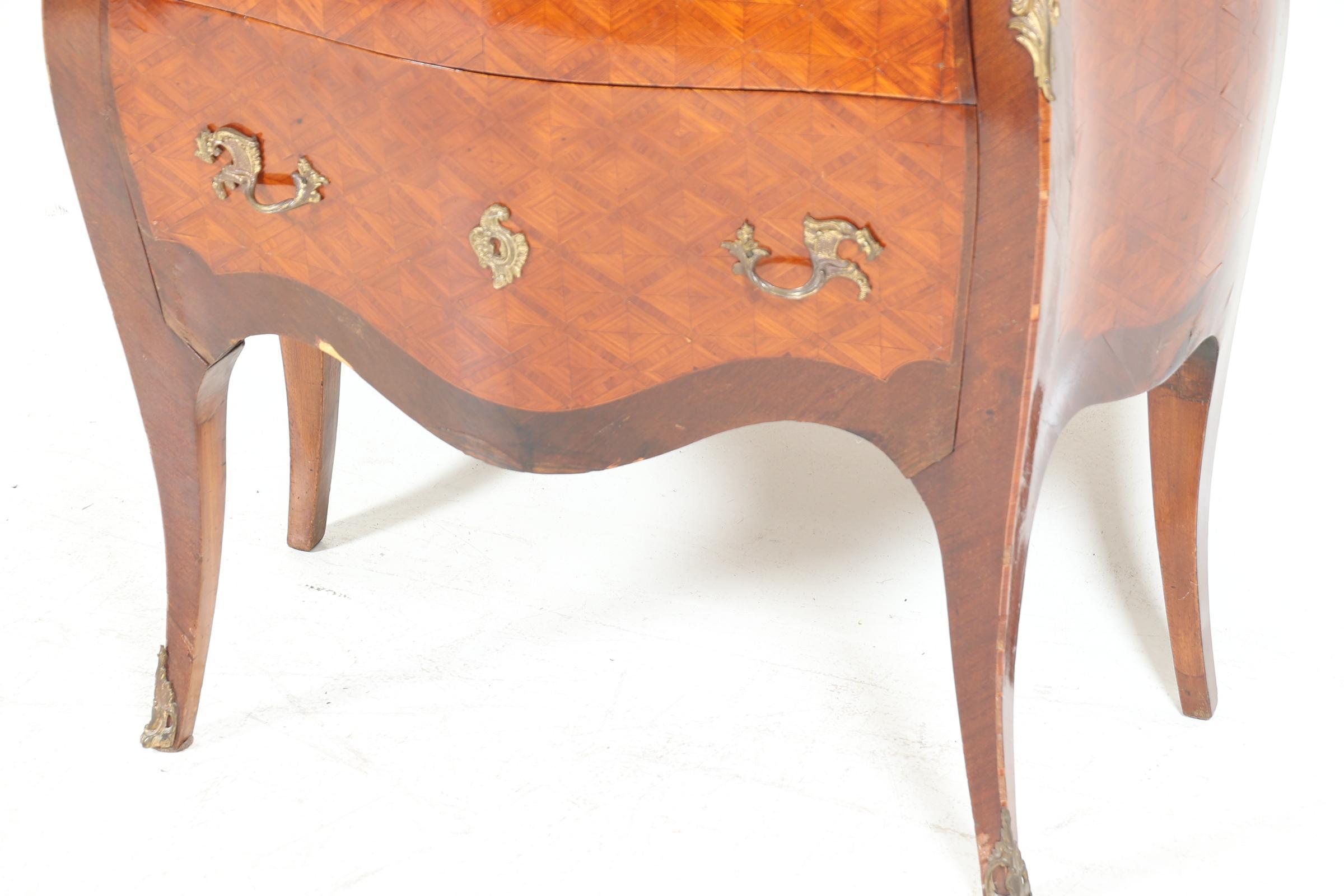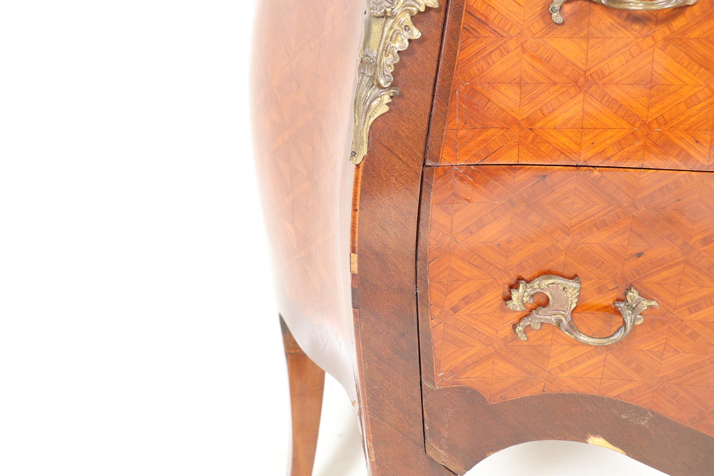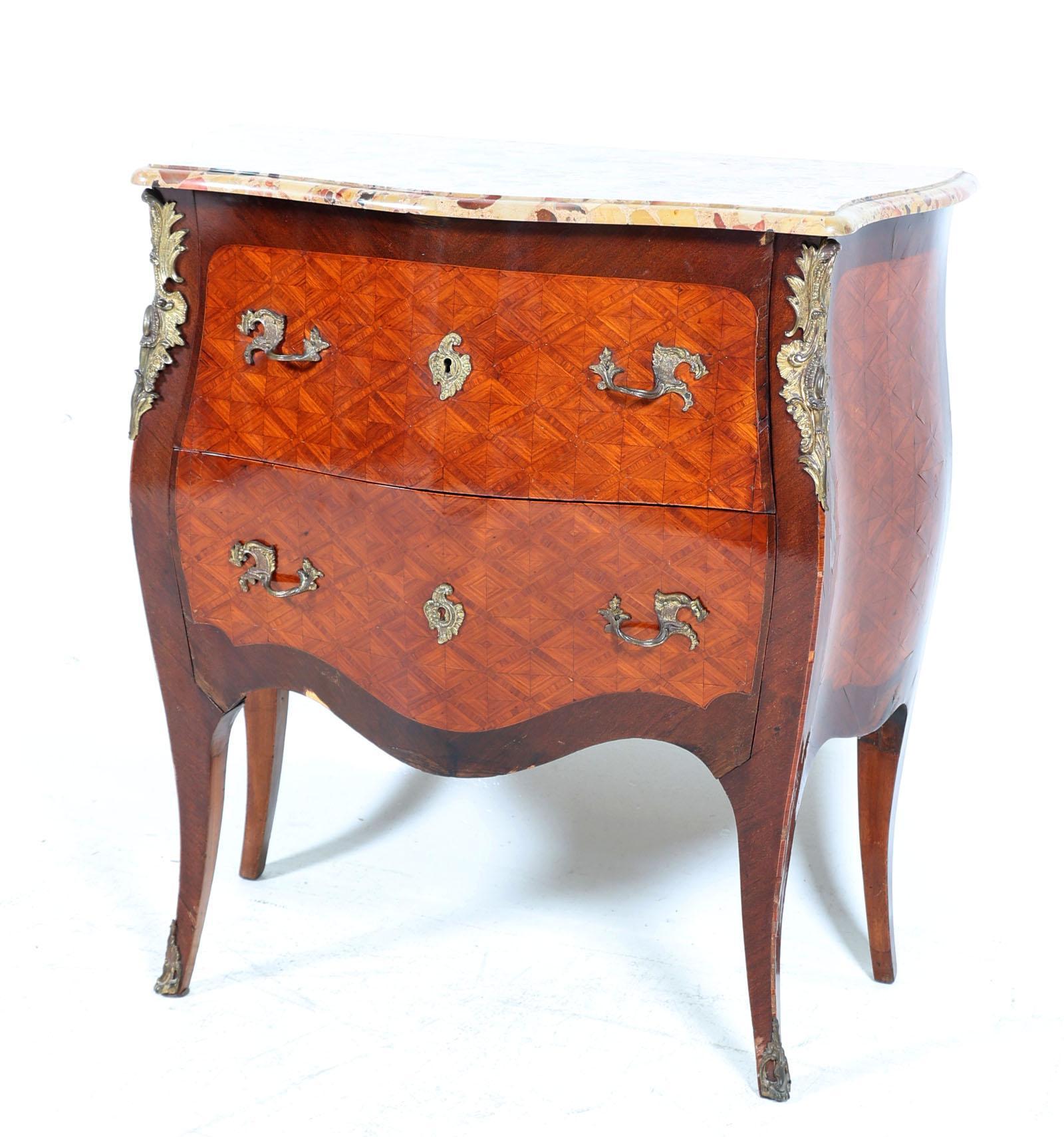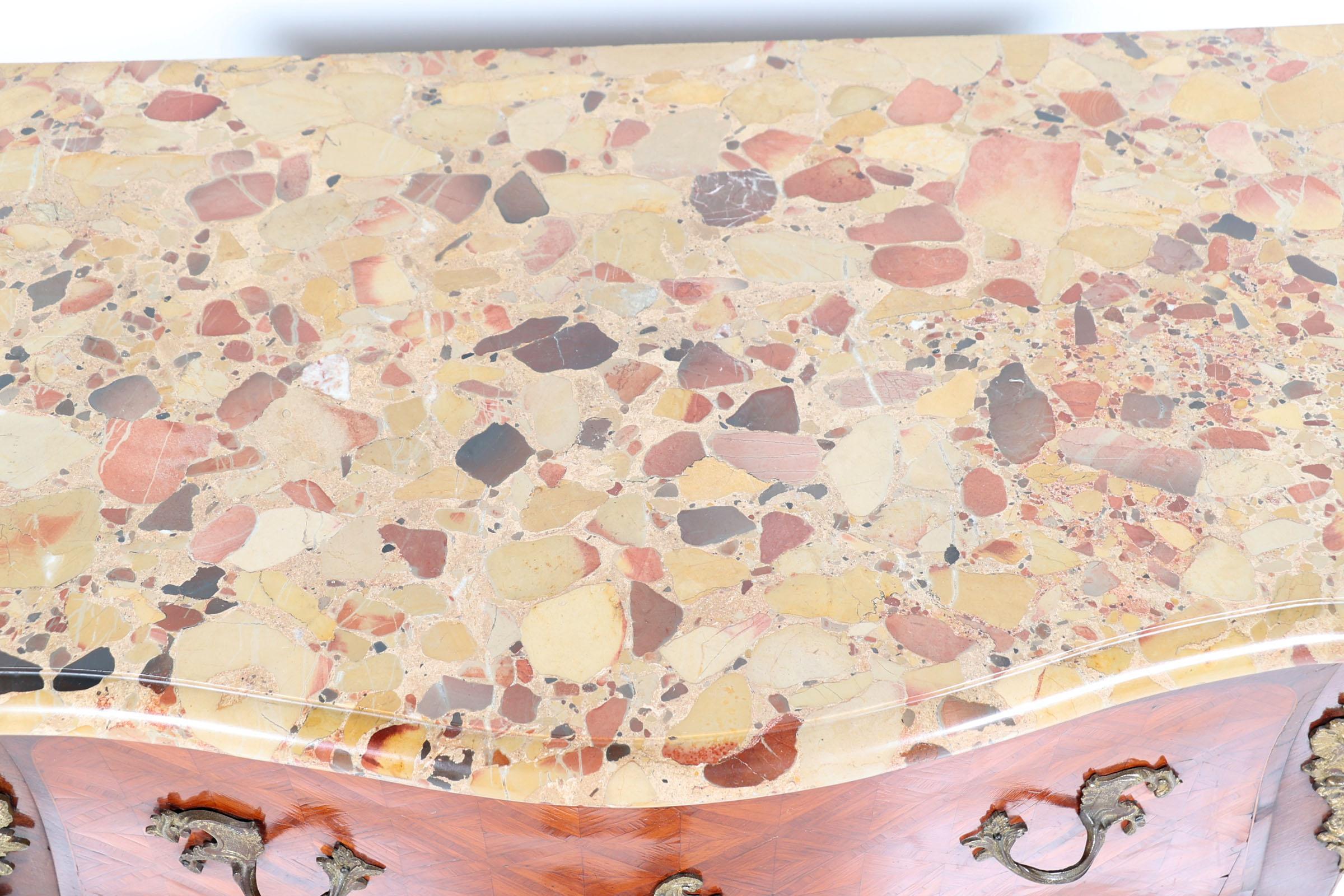 Oude ingelegde rozenhouten 2-laden commode met gemêleerd marmeren blad, Louis Quinze stijl, h.86 x b.80 x d.39 cm.