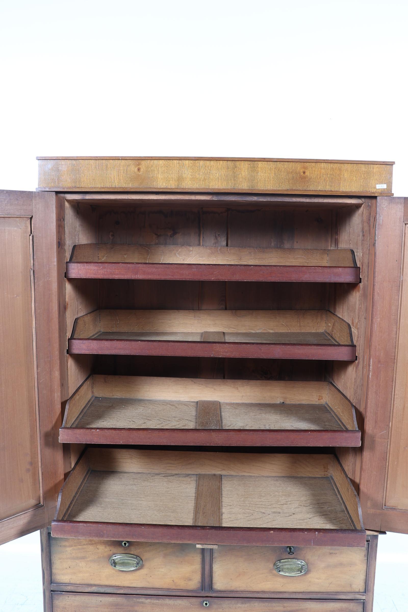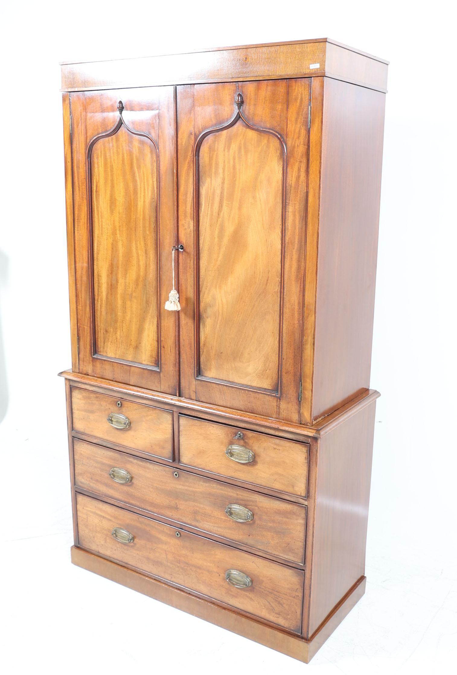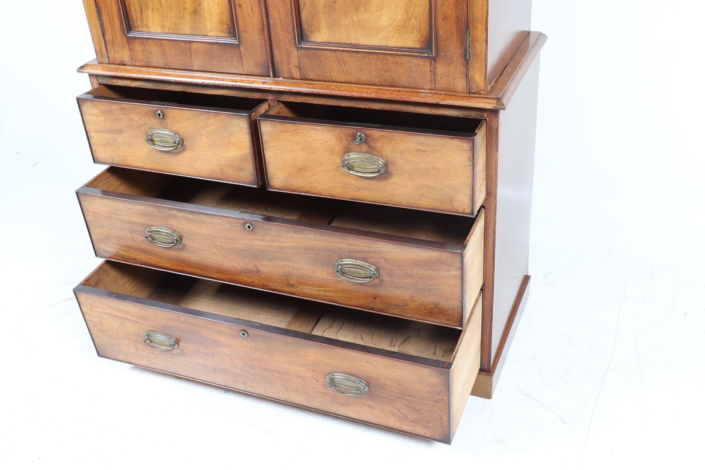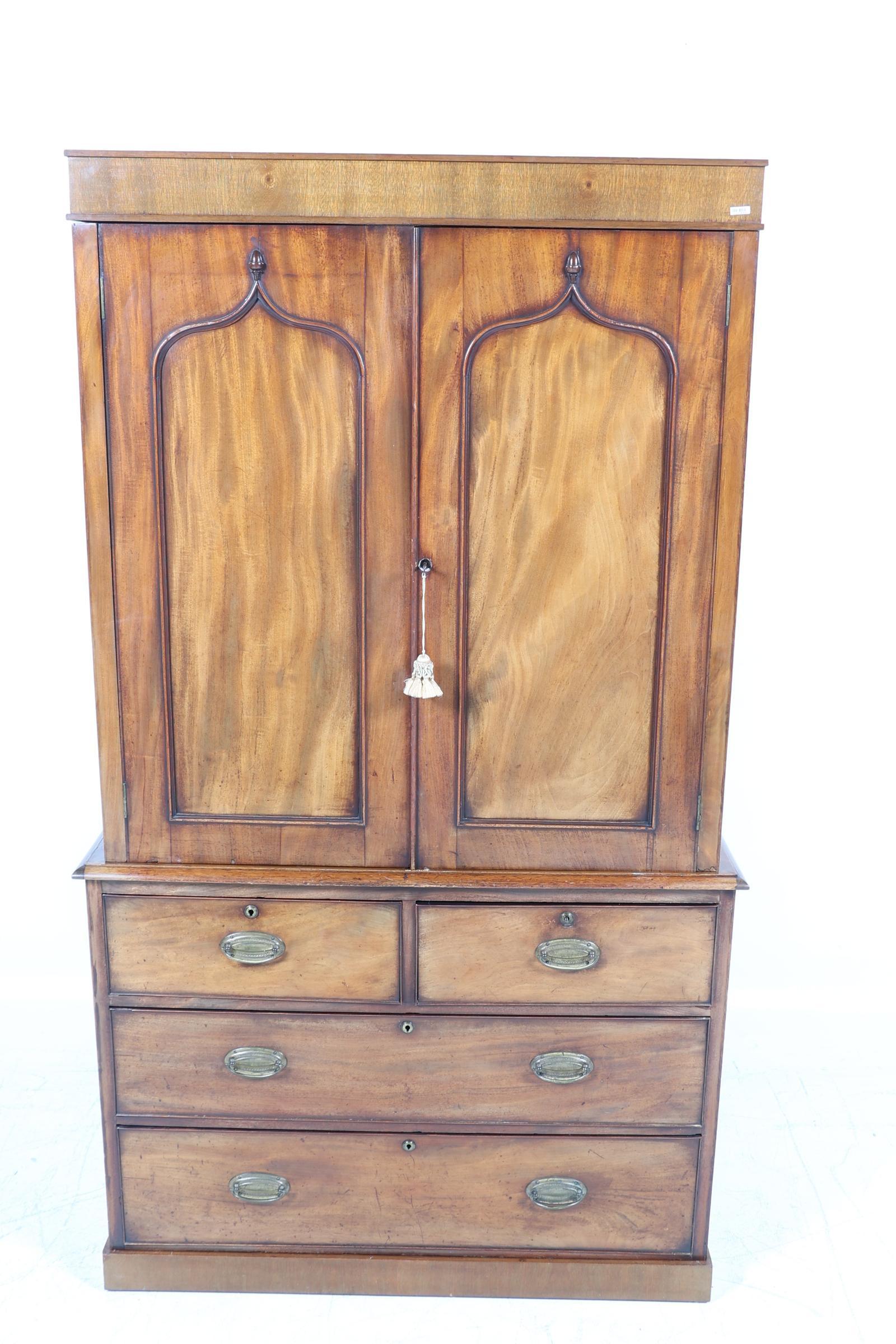 Antiek mahoniehouten Engels 2-deurs kabinet met 4 laden, h.194 x b.111 x d.48 cm.