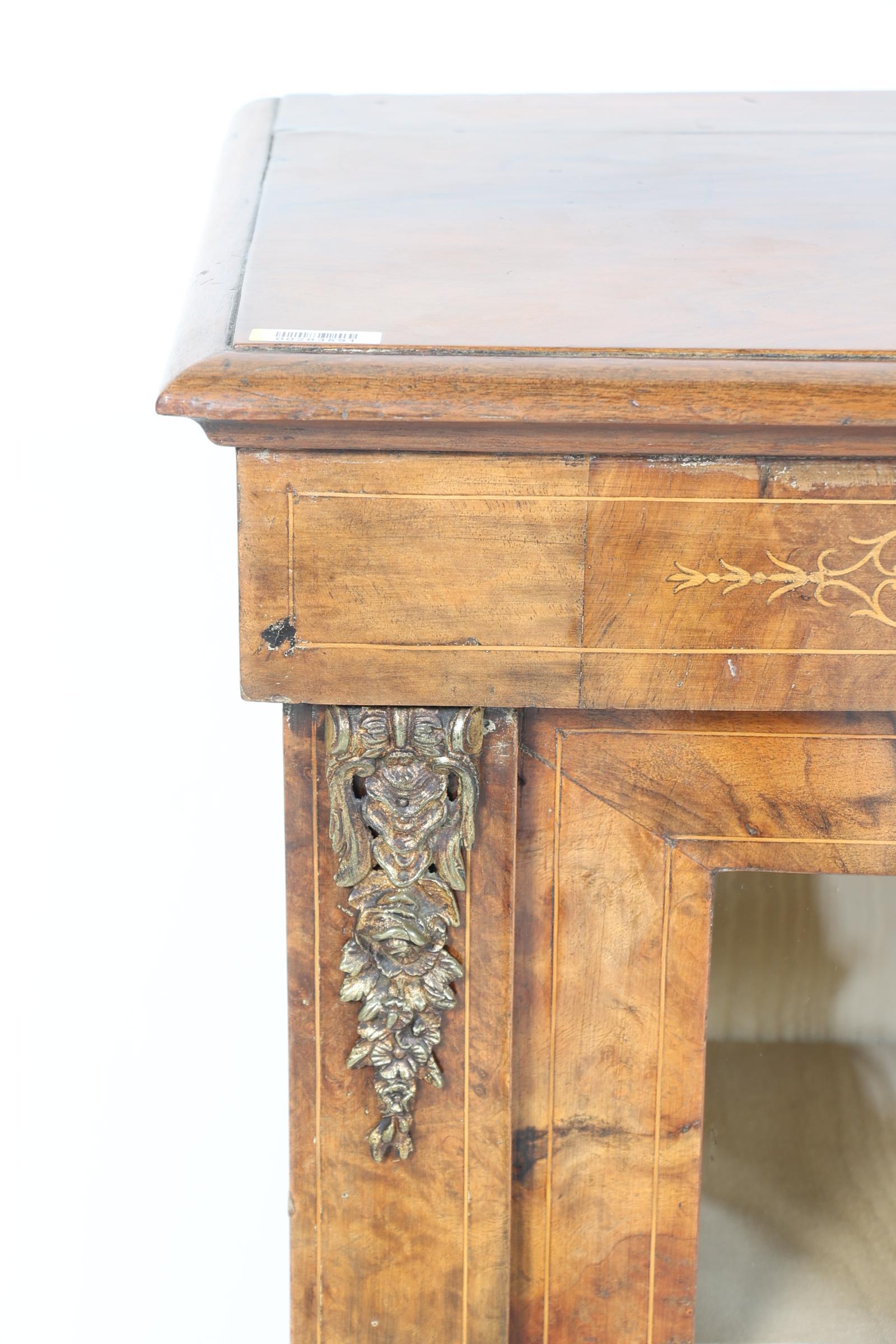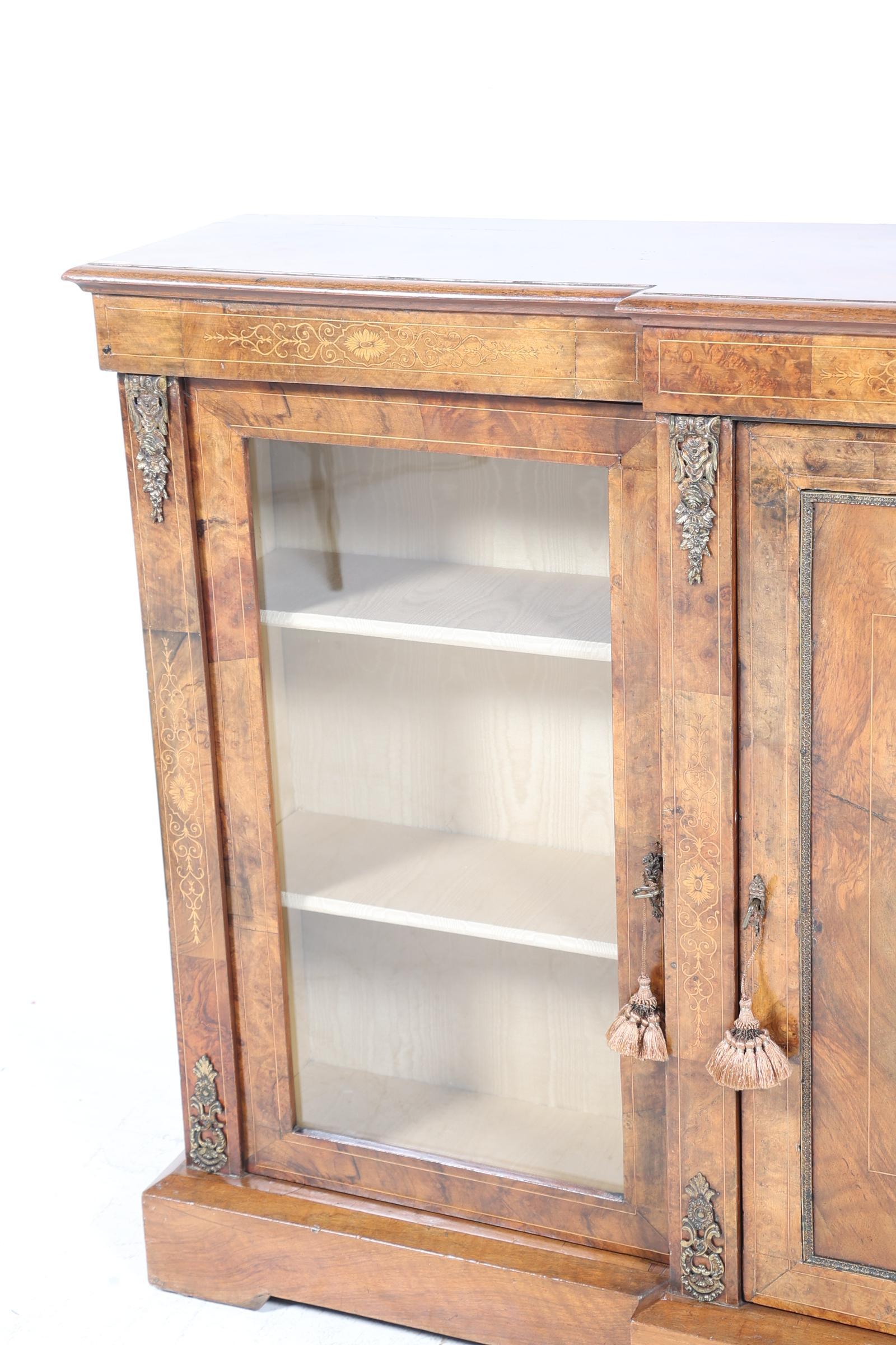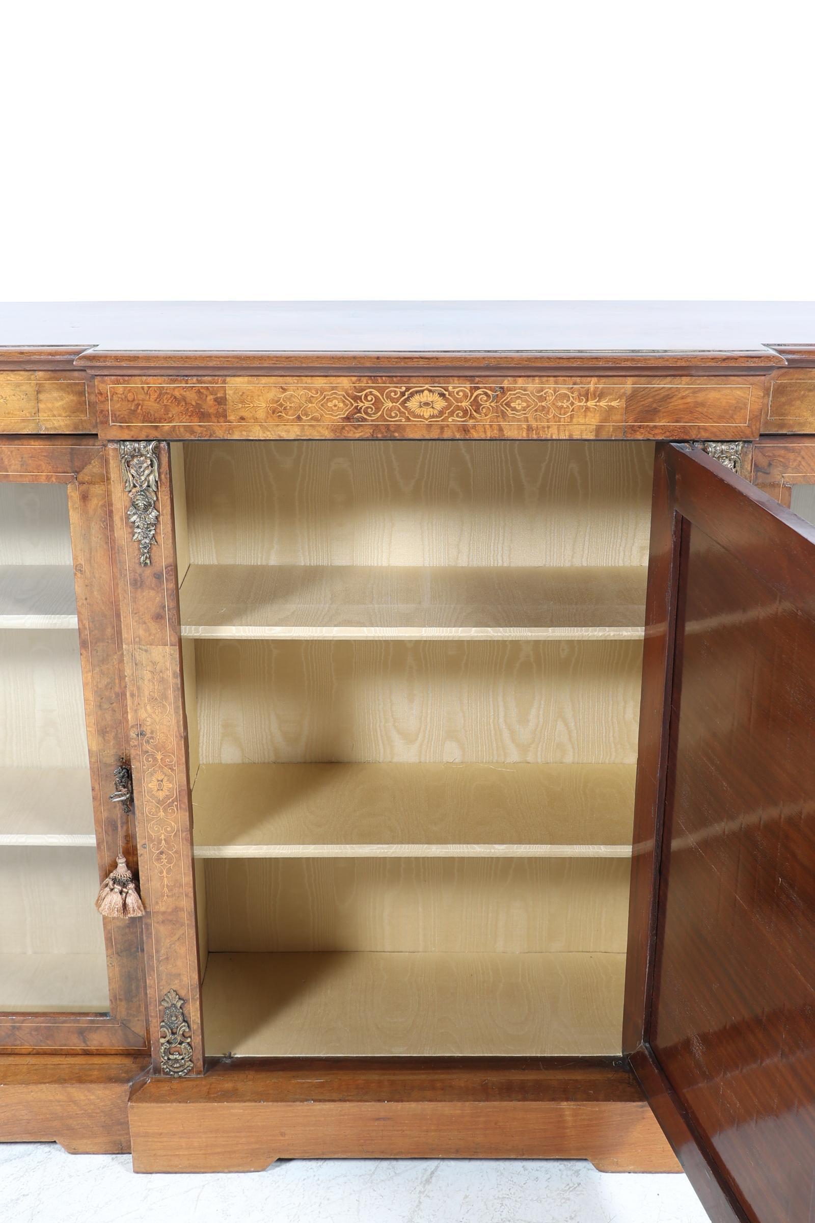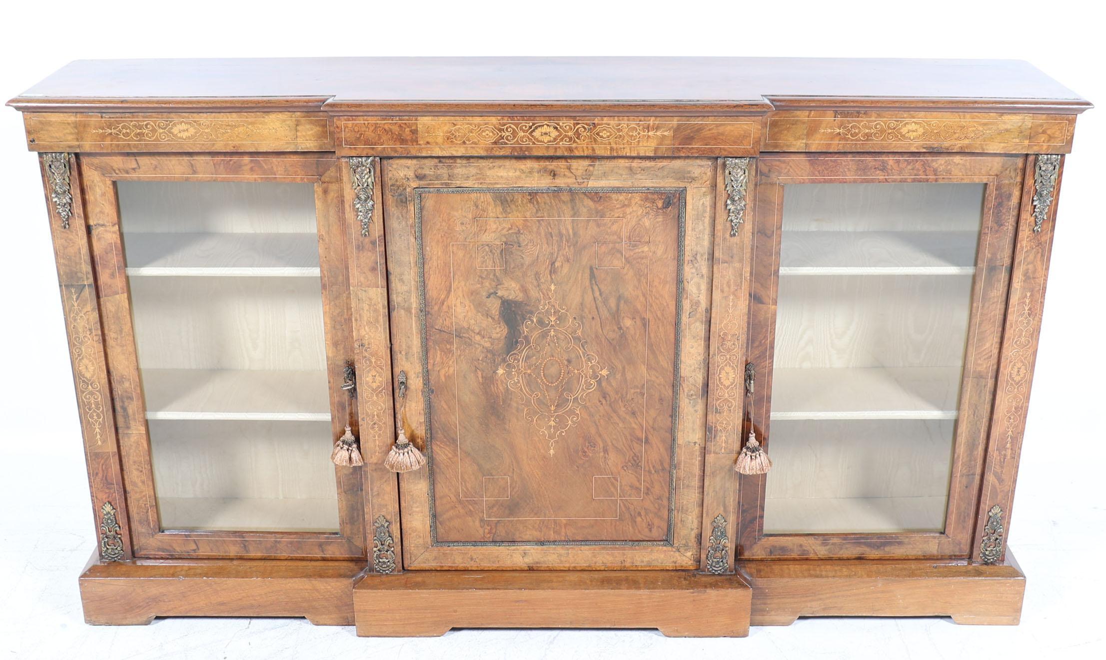 Oude wortelnotenhouten buffetkast met inlegwerk en vitrinedeuren, h.103 x b.176 x d.34 cm.