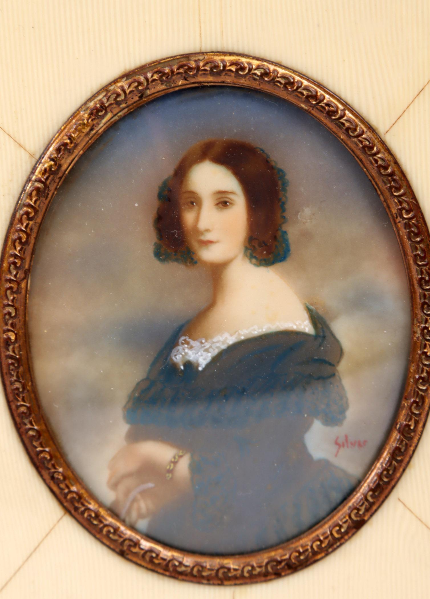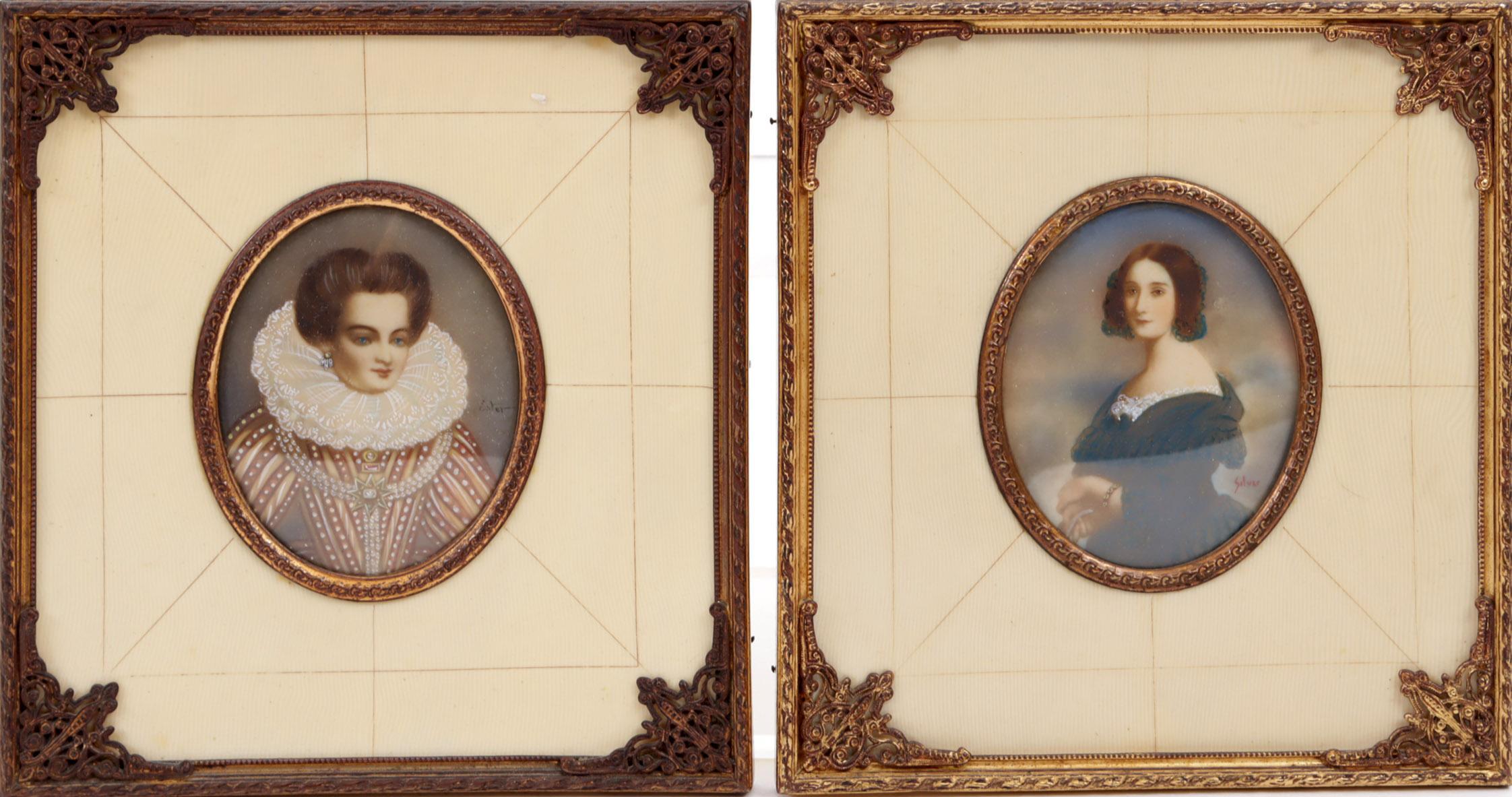 Handgeschilderde portretminiaturen van vrouwen, 15 x 14 cm.