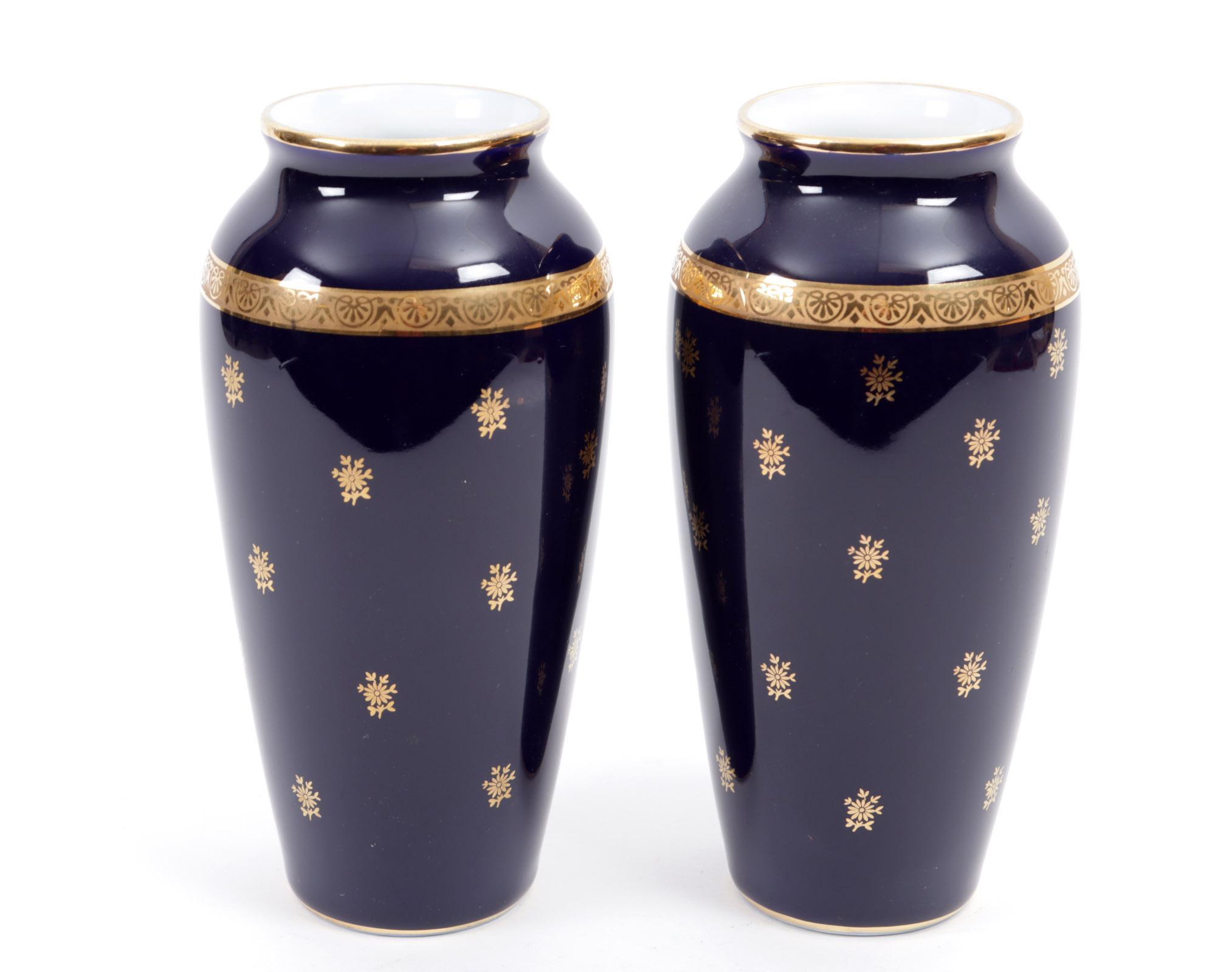 2 Blauw/goud gedecoreerde Limoge porseleinen vazen, h.21 cm.