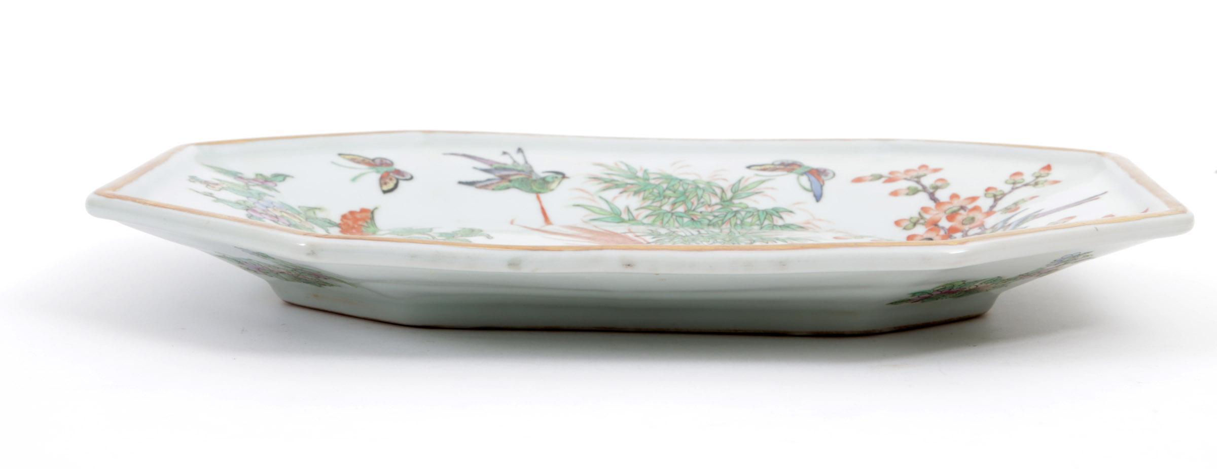 Met bloemen, vogels en vlinders gedecoreerde Chinees porseleinen schaal, h.4 x b.36 x d.26 cm.