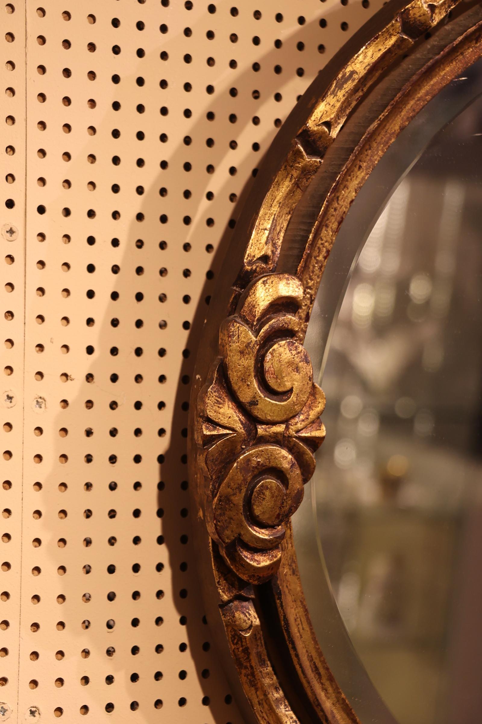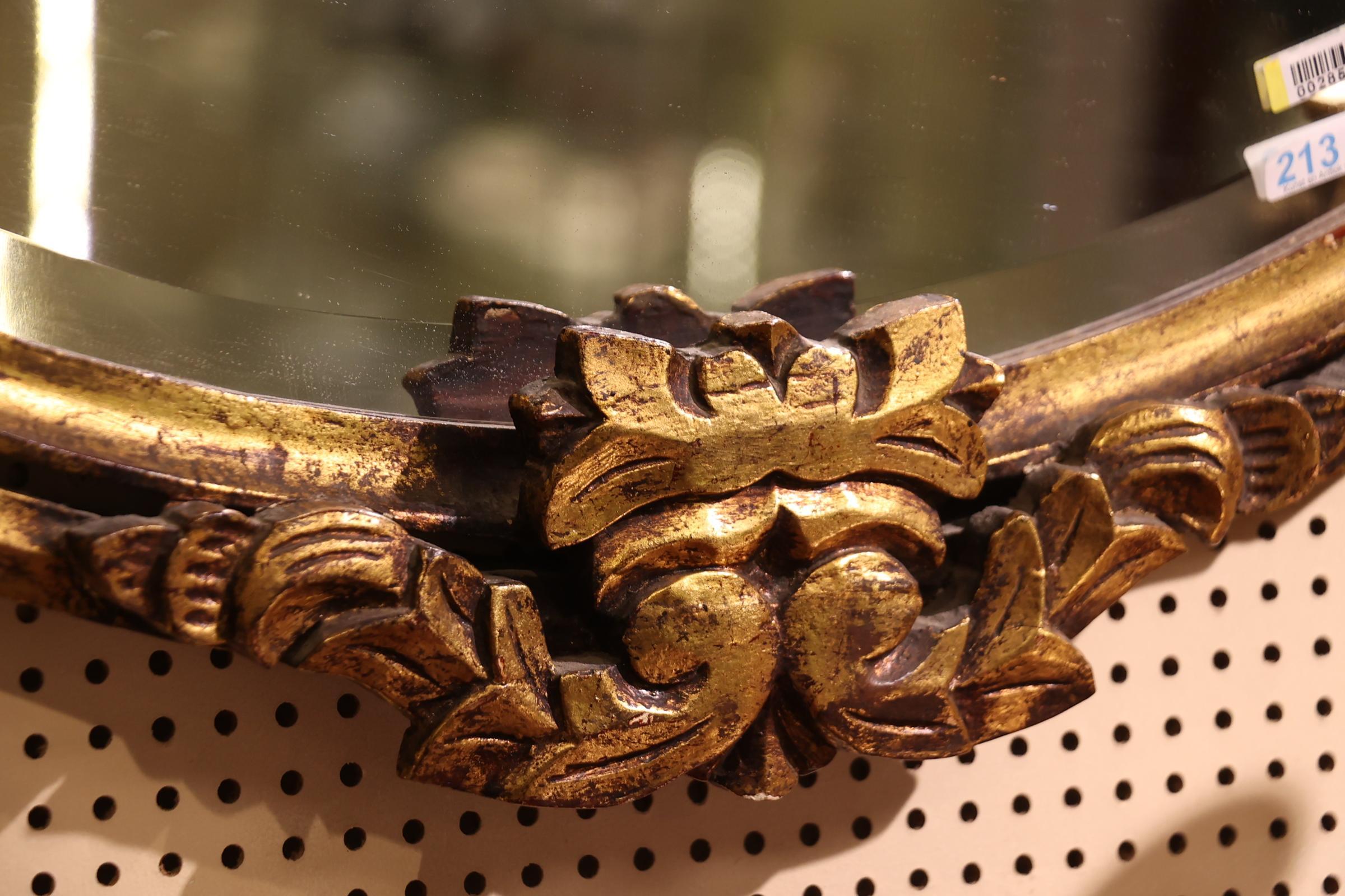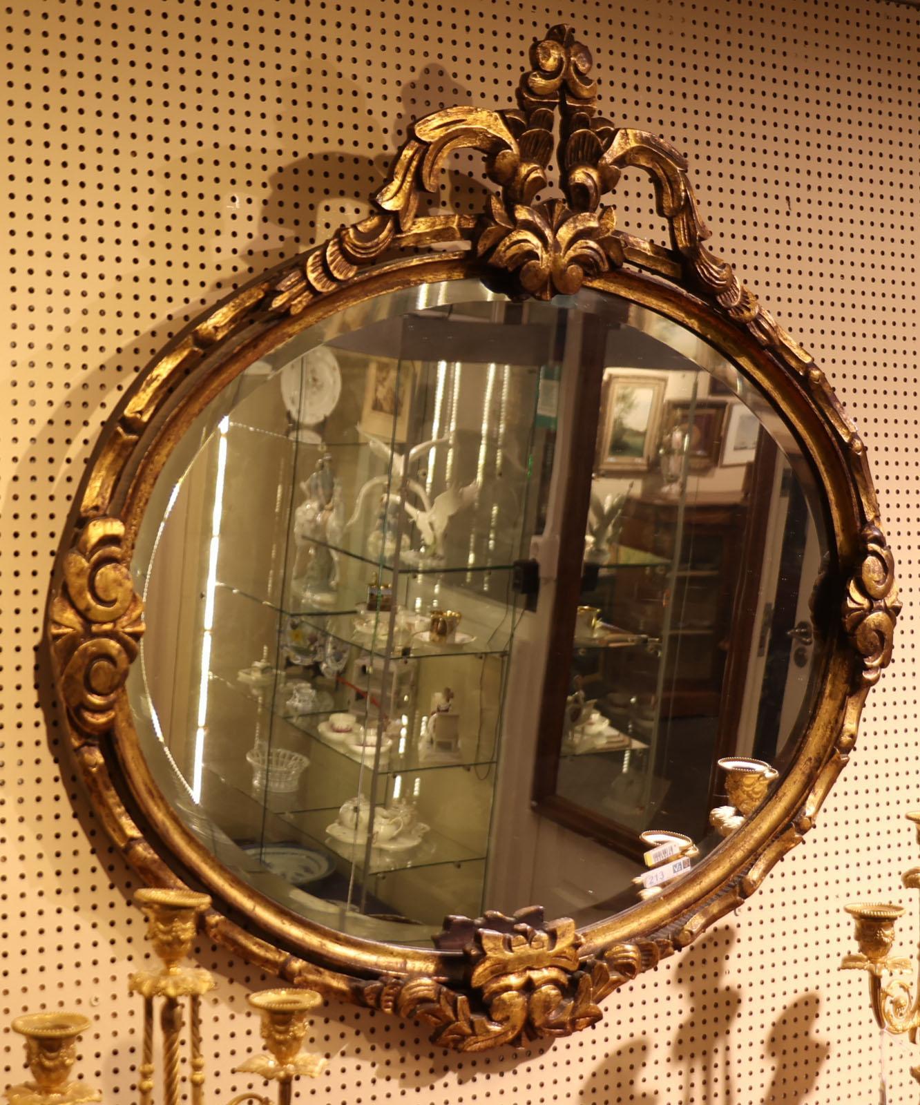 Ovale spiegel in opengewerkte goudkleurige kuiflijst, h.77 x b.76 cm.