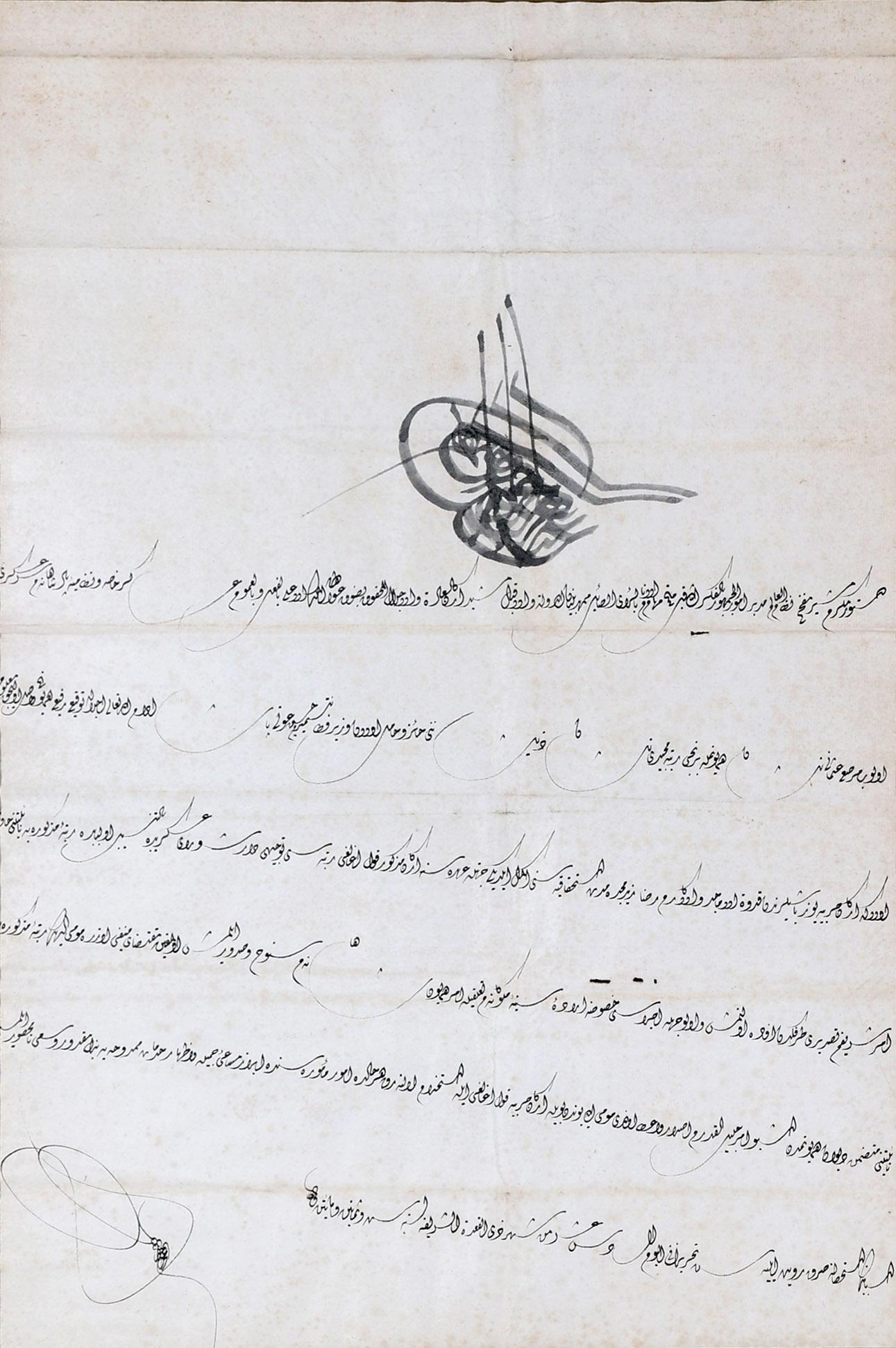 Ottomaanse ferman (koninklijk decreet of schriftelijk bevel van de Ottomaanse sultan), geschreven in Diwani, Sultan II Mahmud Han tuğralı (1808-1839), 70 x 48 cm.