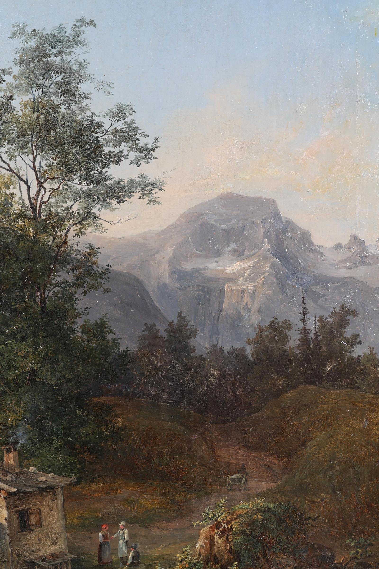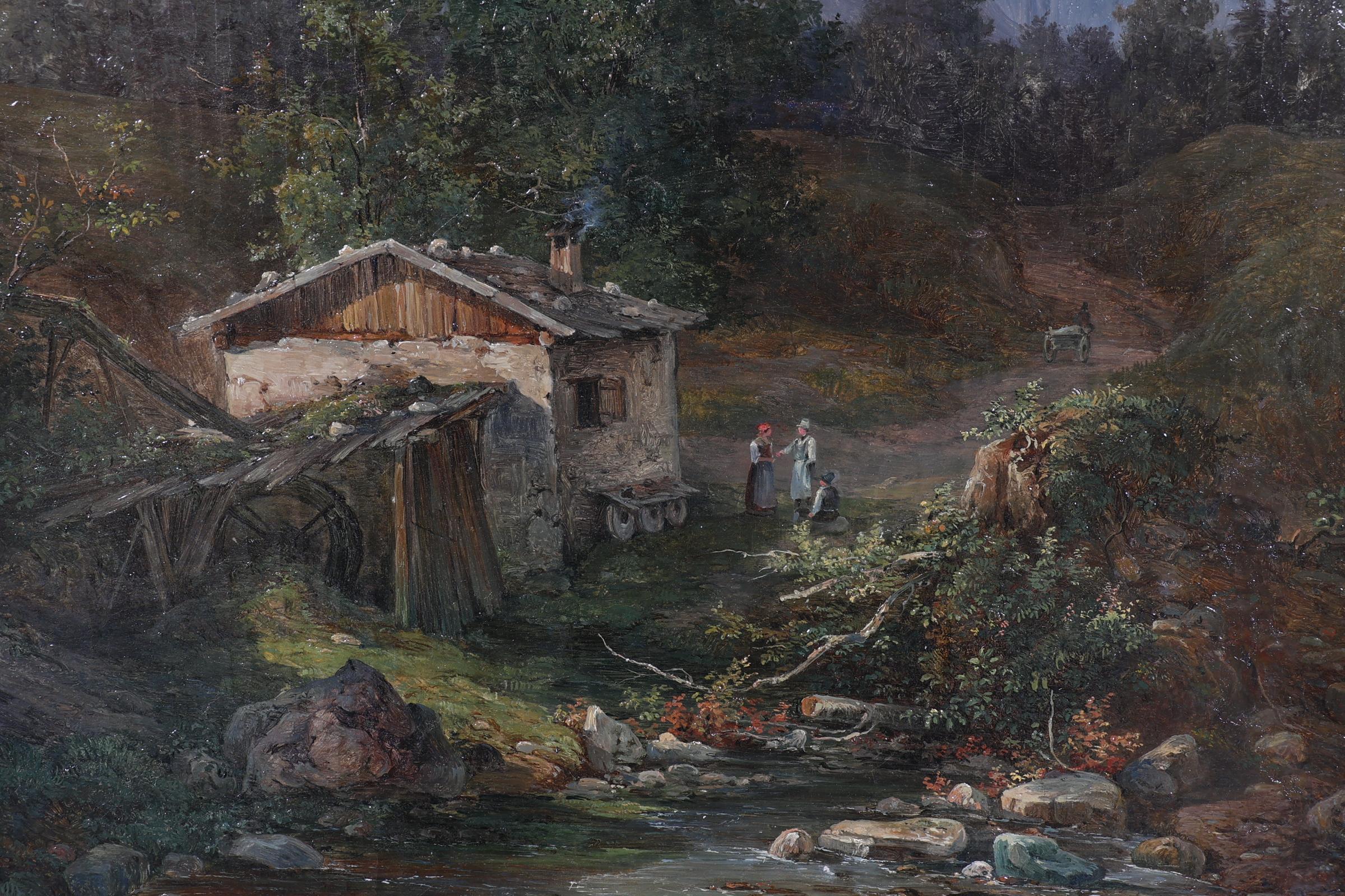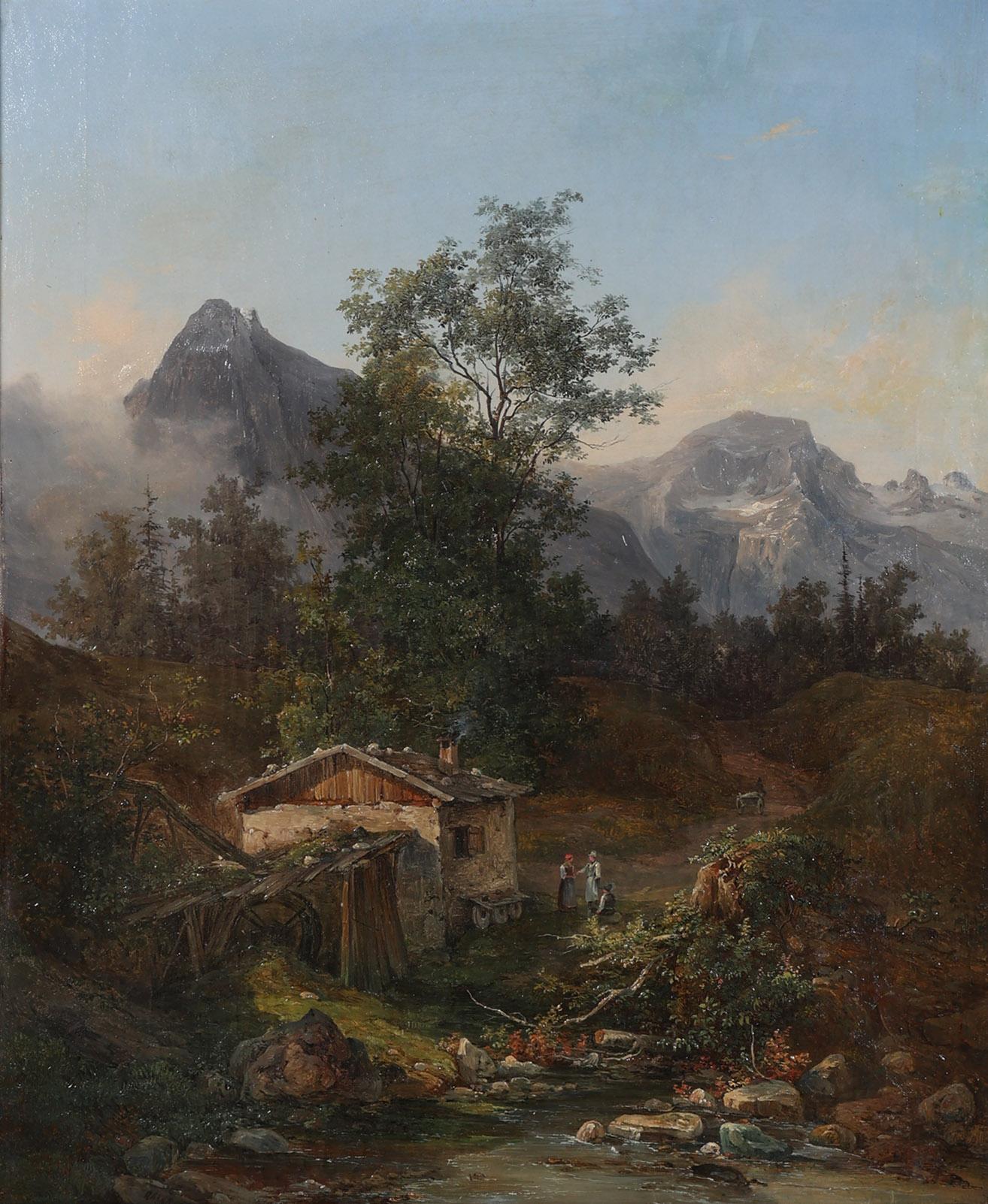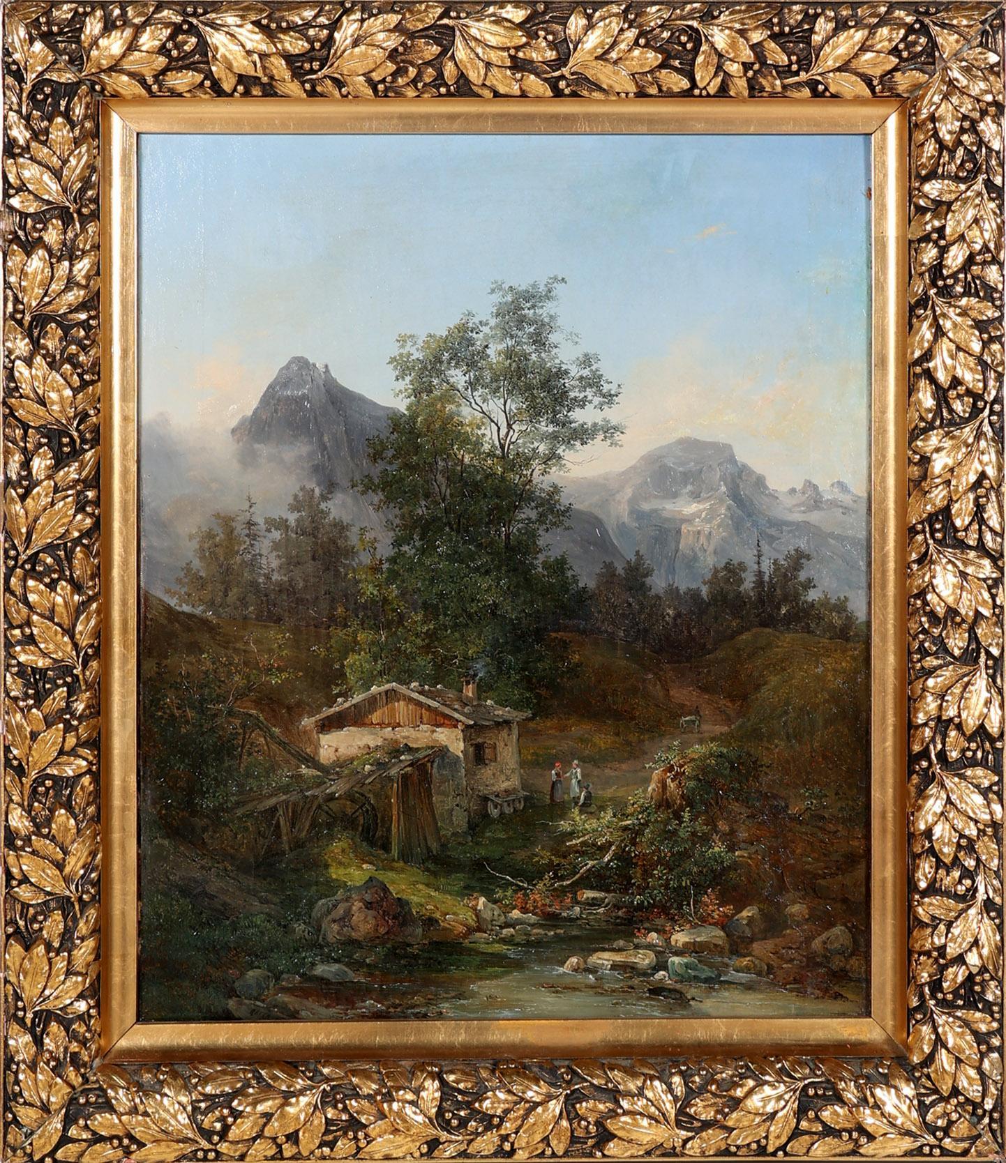 Georg Geyer (1823-1912), Bosrijke omgeving met personen langs het water, olieverf op doek, gedateerd 1897, 55 x 45 cm.