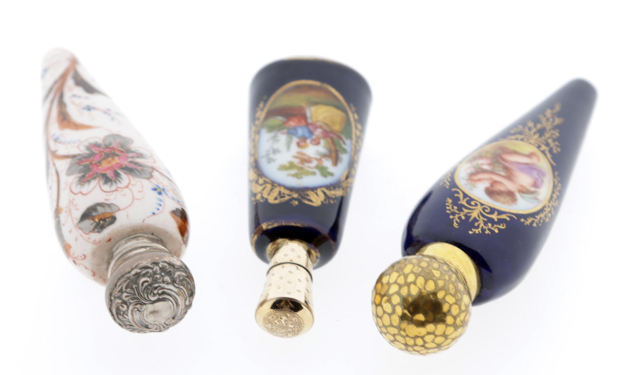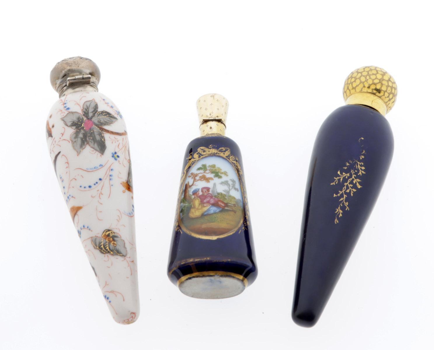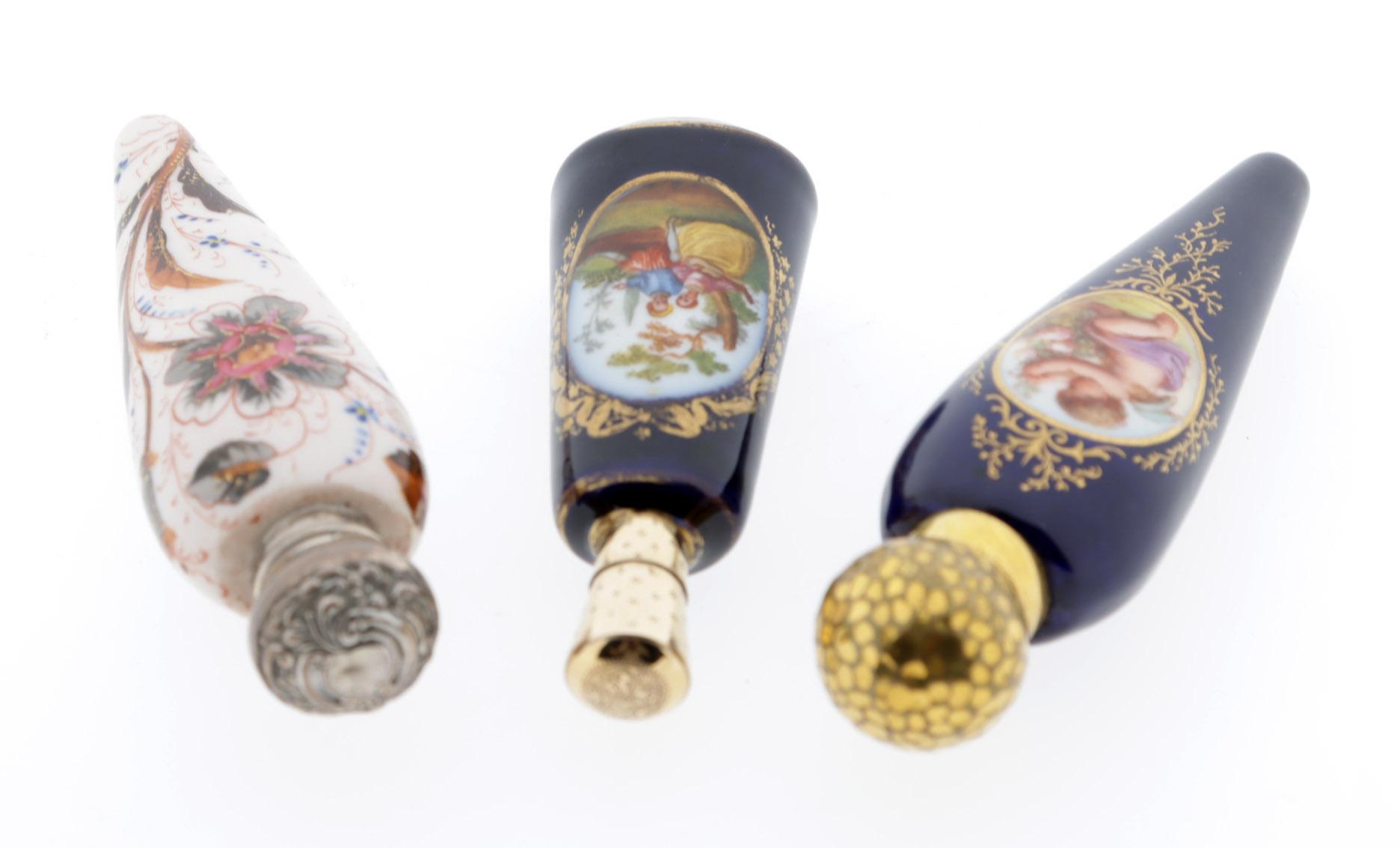 3 Antieke porseleinen odeurflacons w.o. met bloemen gedecoreerde fles, Birmingham, 19e eeuw, kleine blauwe fles met romantische voorstelling met gouden dop, gekeurd Birmingham, 1900 en een grote blauw fles met engel gedecoreerd, eind 19e eeuw, h.13, h.10 en h.12 cm.
