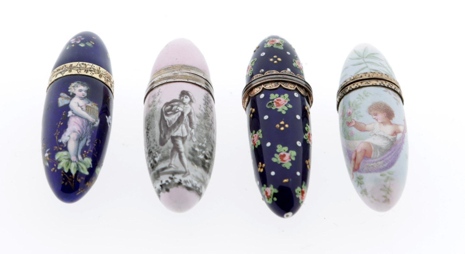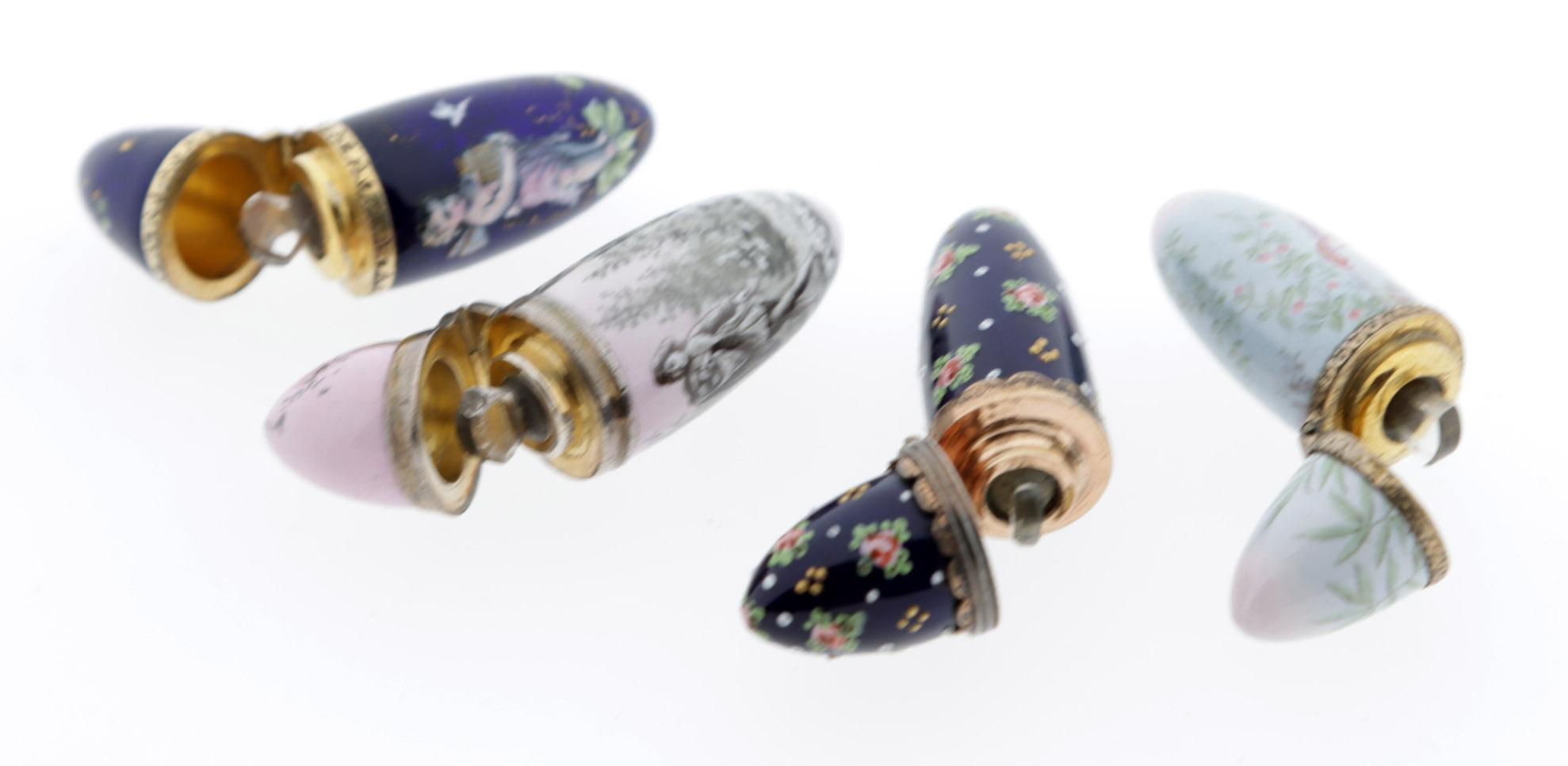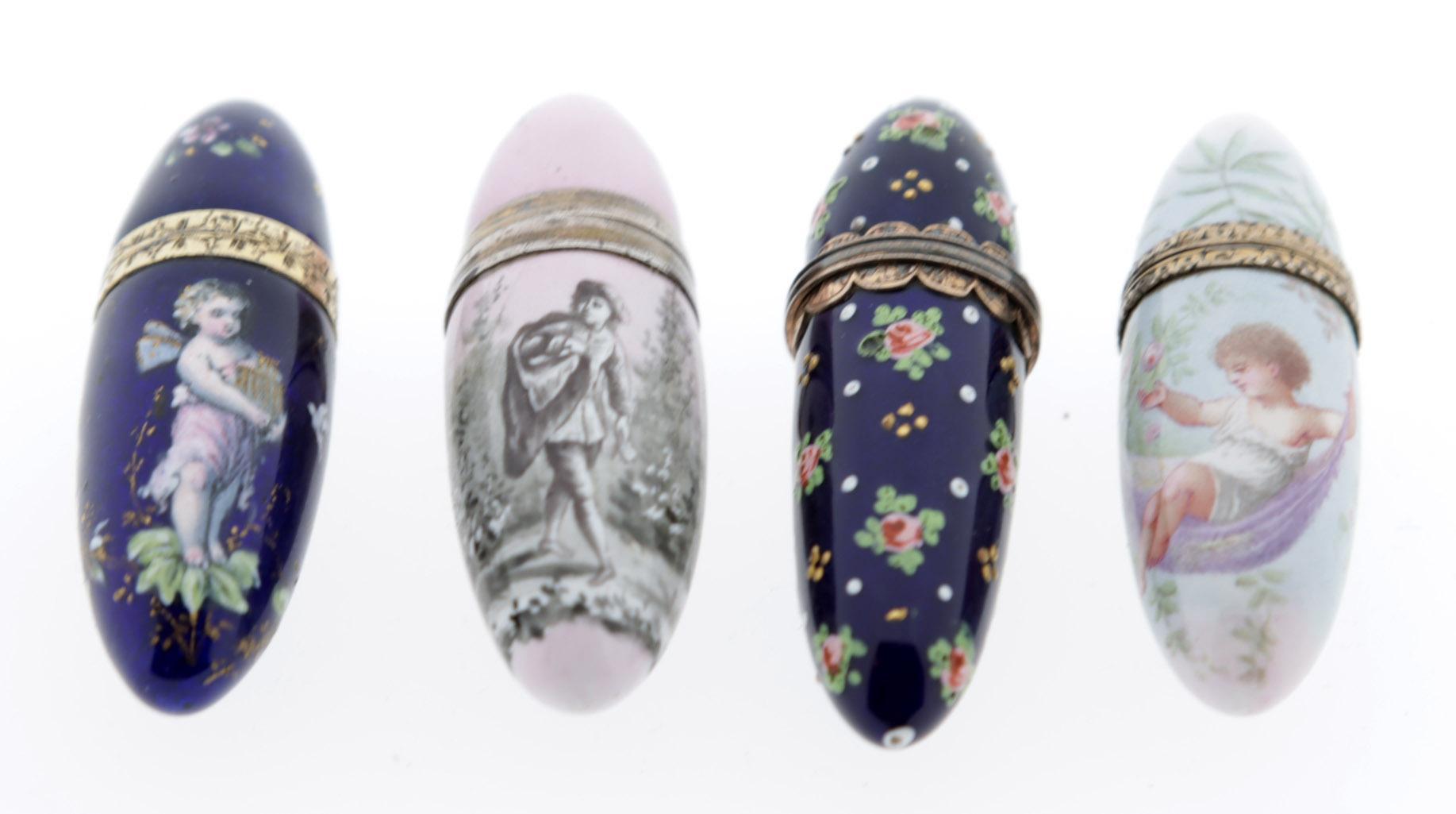 4 Fraai beschilderde emaille odeurflacons met zilveren monturen, h.5 cm.