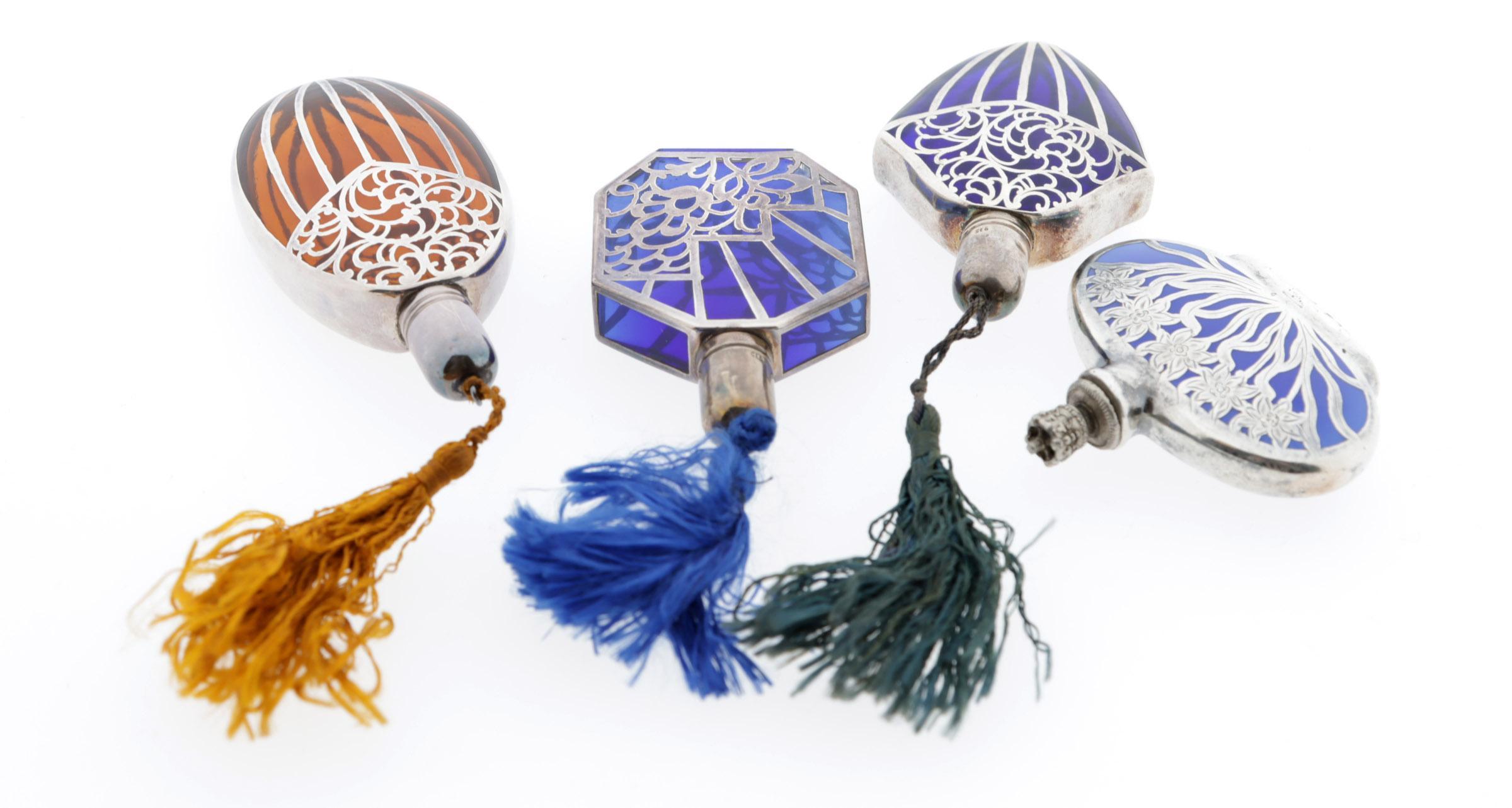 4 Kristallen met zilver afgewerkte Art Deco odeurflacons, h.9, h.8, h.7 en h.6 cm.