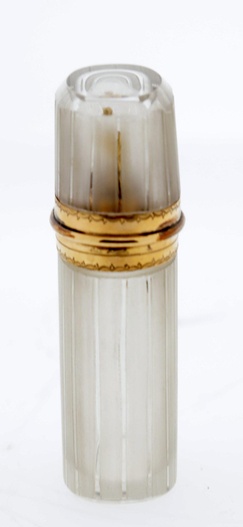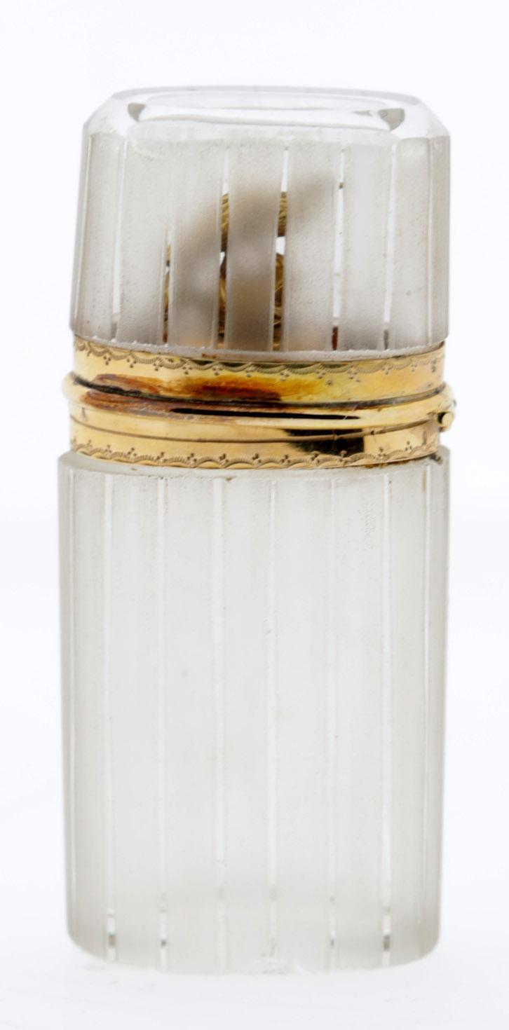 Antieke mat kristallen odeurflaocn met gouden monturen en stop i.v.v. een vogel, 7,5 cm.