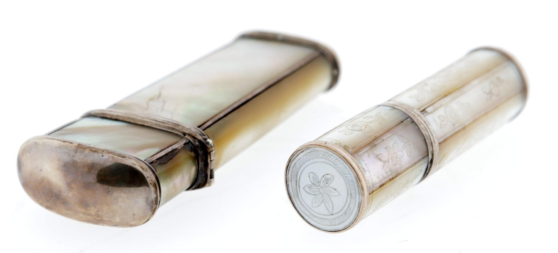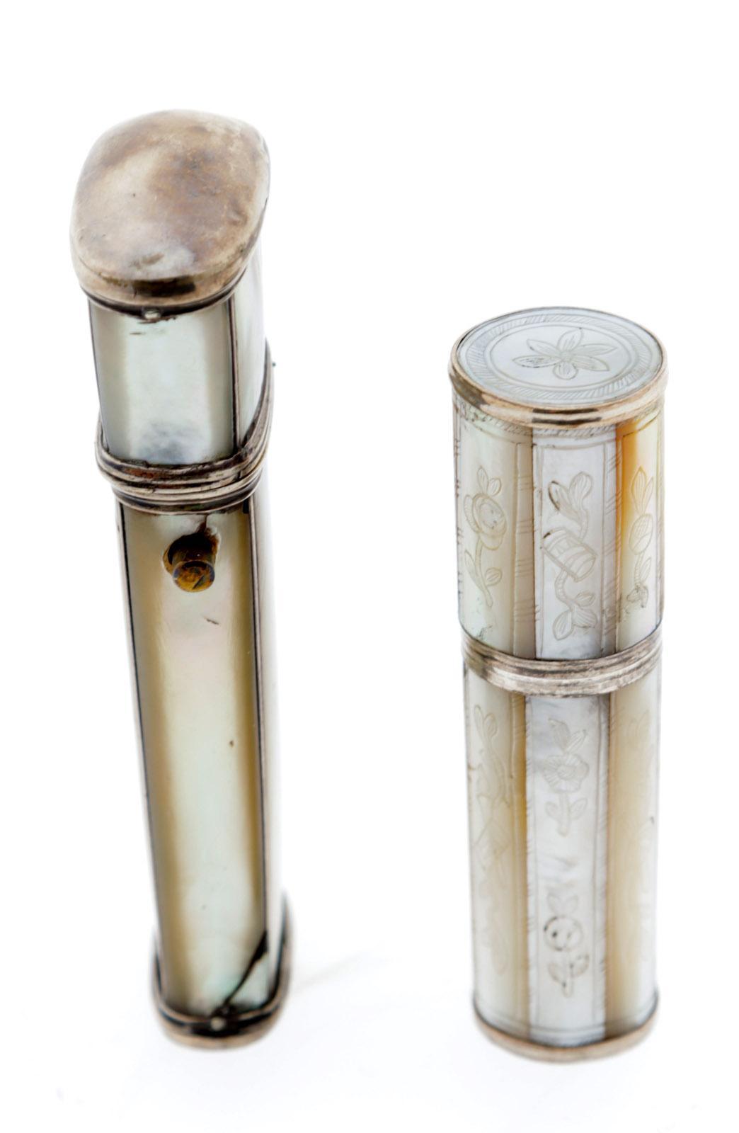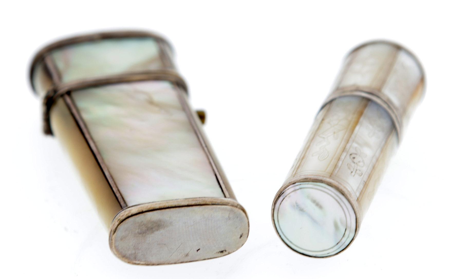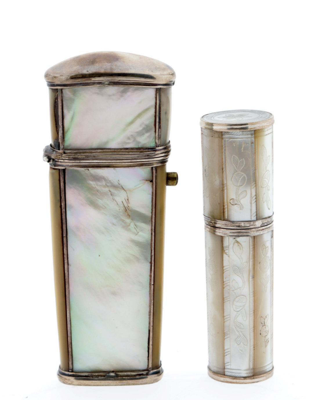 Antieke blauw kristallen odeurflacon in zilveren met parelmoer beklede foudraal, 18e eeuw, h.10 cm. en kristallen odeurflacon met zilveren monturen en dop met parelmoer en zilver beklede ronde foudraal, 18e eeuw, h.8 cm.