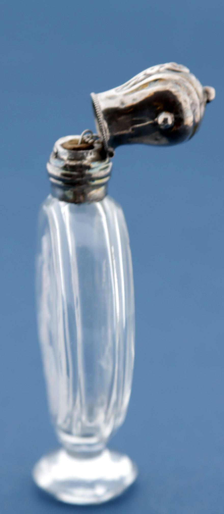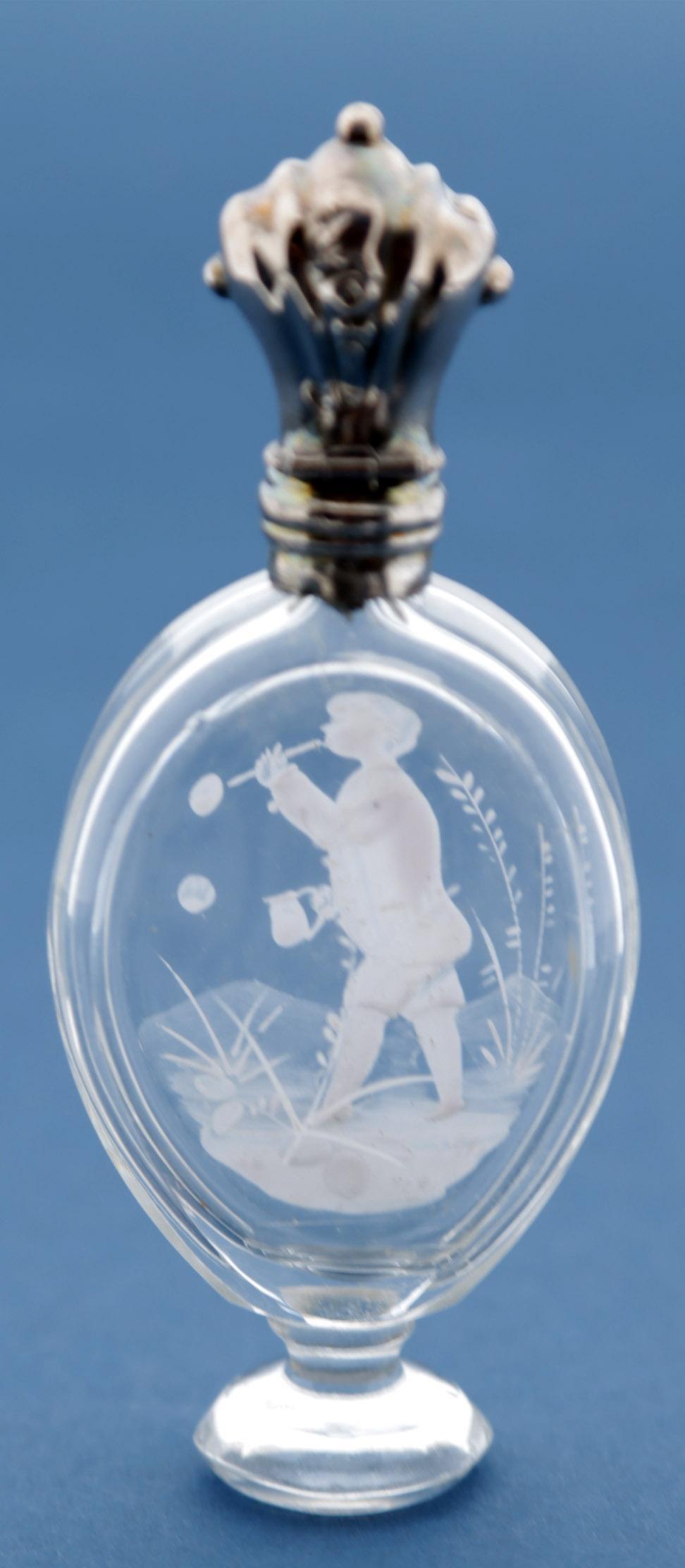 Met bellenblazend jongetje beschilderde kristallen odeurflacon, zgn. Mary Gregory, met zilveren dop, ca.1850 in origineel lederen foudraal