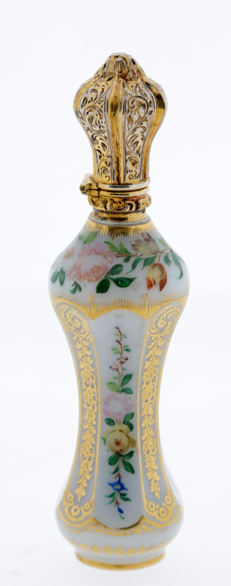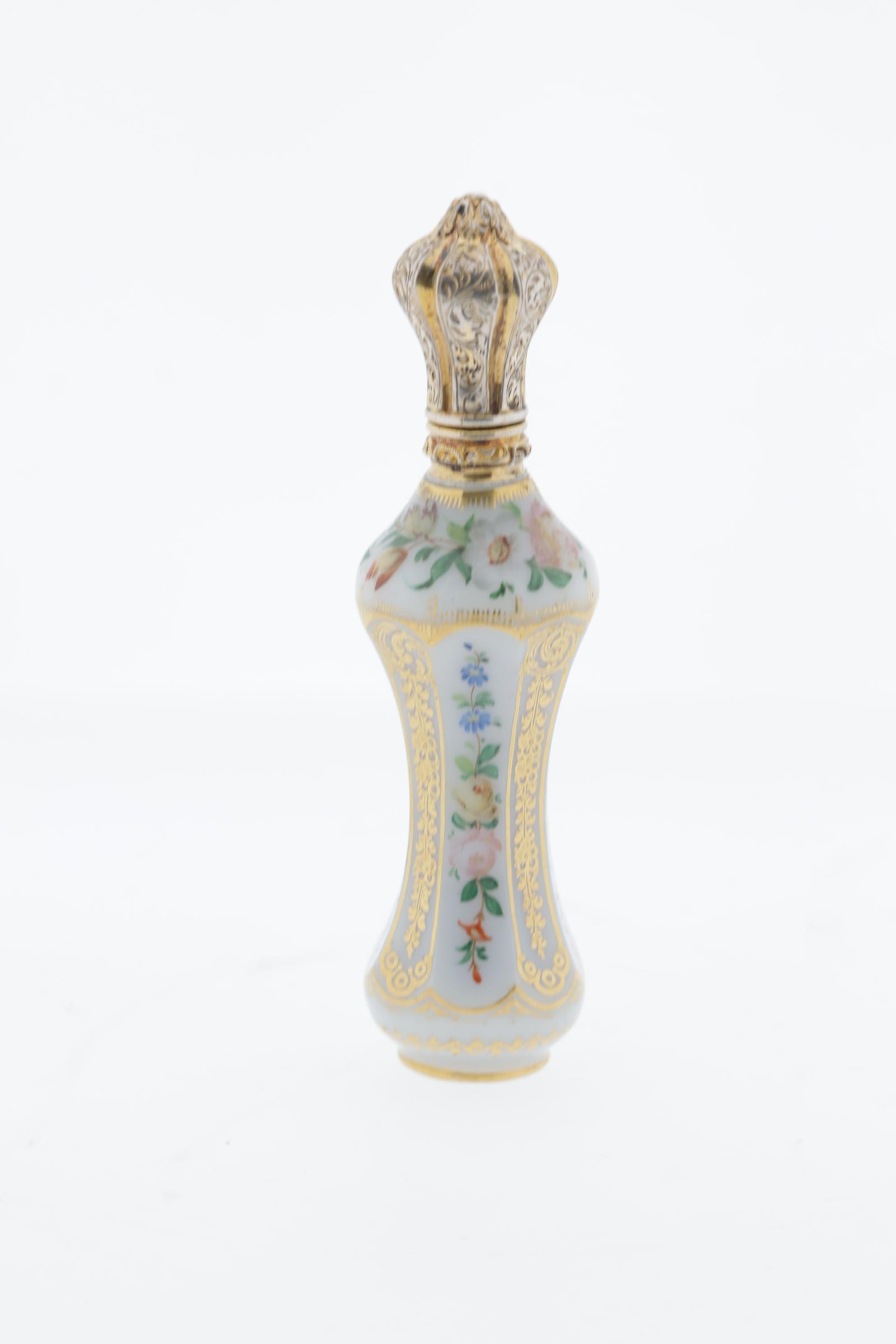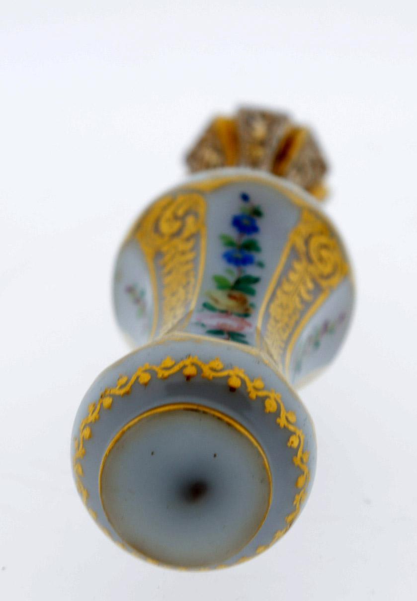 Antieke met bloemen gedecoreerde Frans porseleinen odeurflacon met verguld zilveren dop, 19e eeuw, h.11 cm.