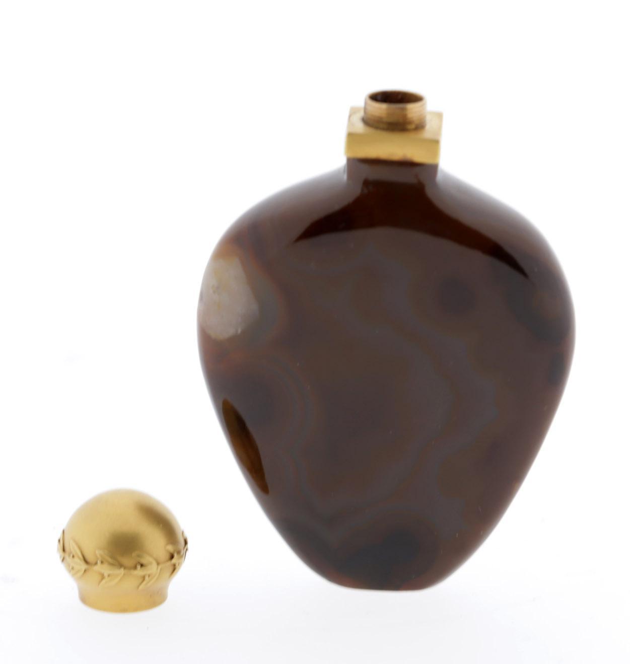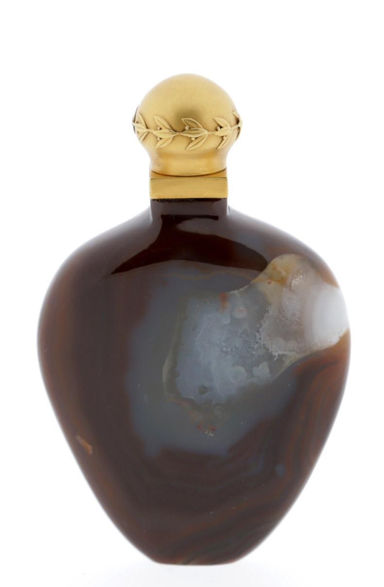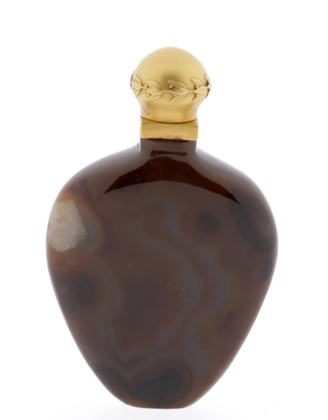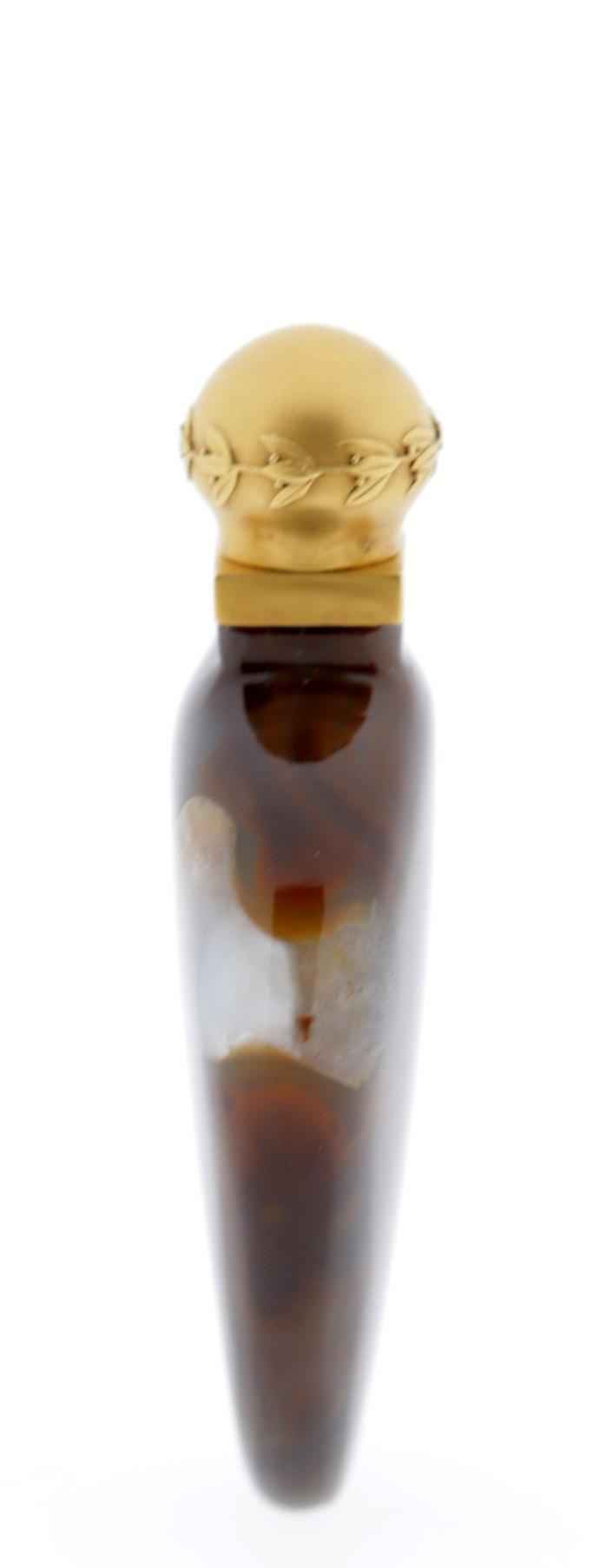 Platte agaten odeurflacon met gouden schroefdop, Frankrijk, Art Deco ca. 1930, h.8 cm.