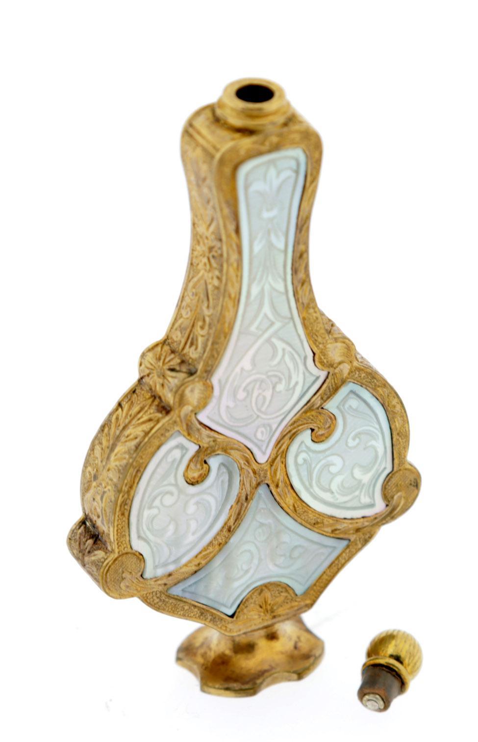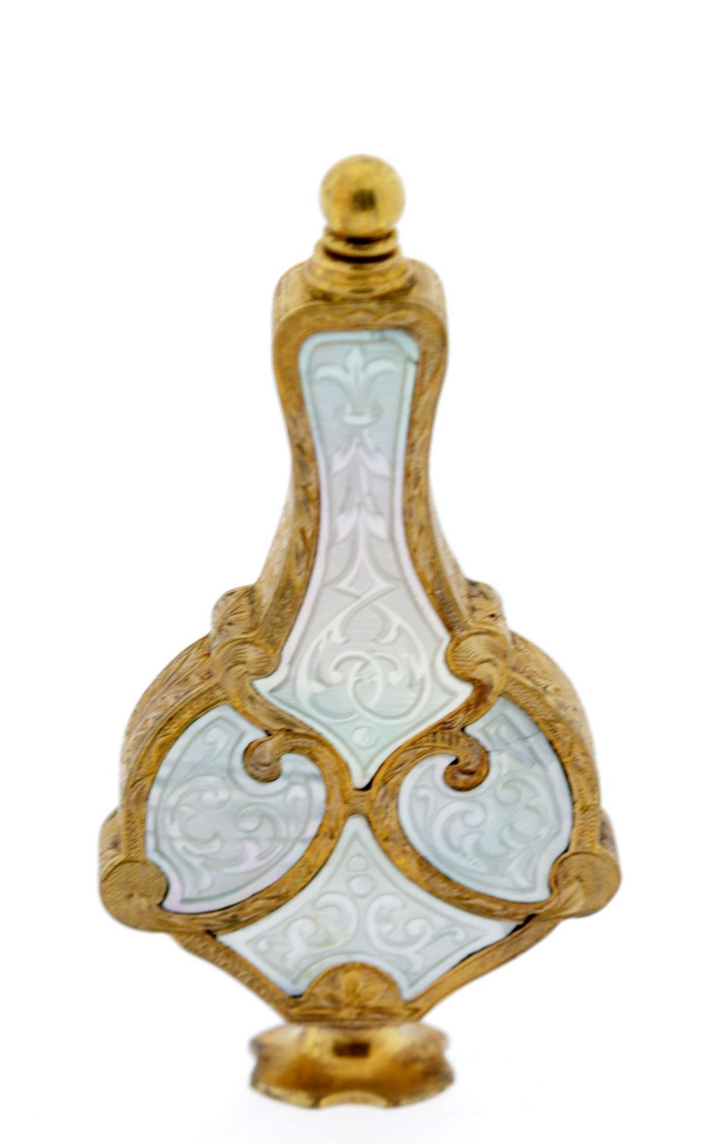 Verguld zilveren met parelmoer beklede odeurflacon met lakzegelstempel, Frankrijk, 18e eeuw, h.8,5 cm.