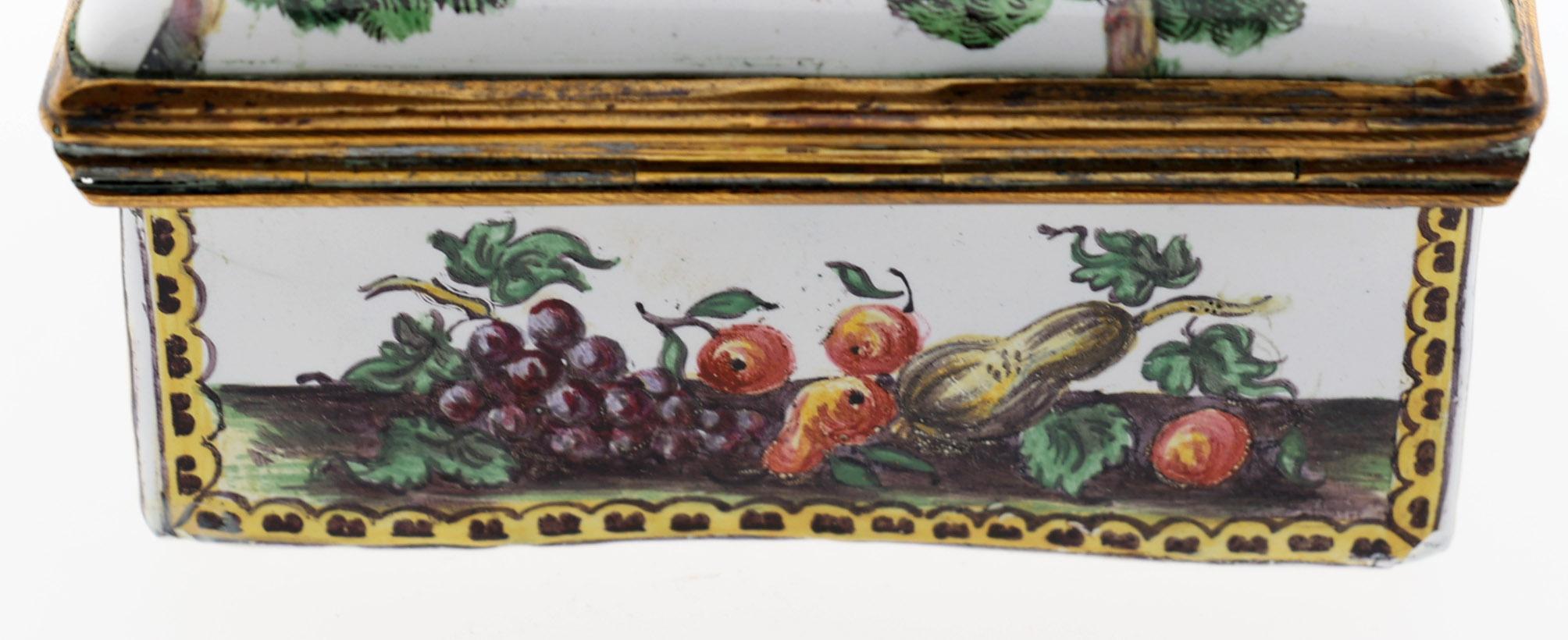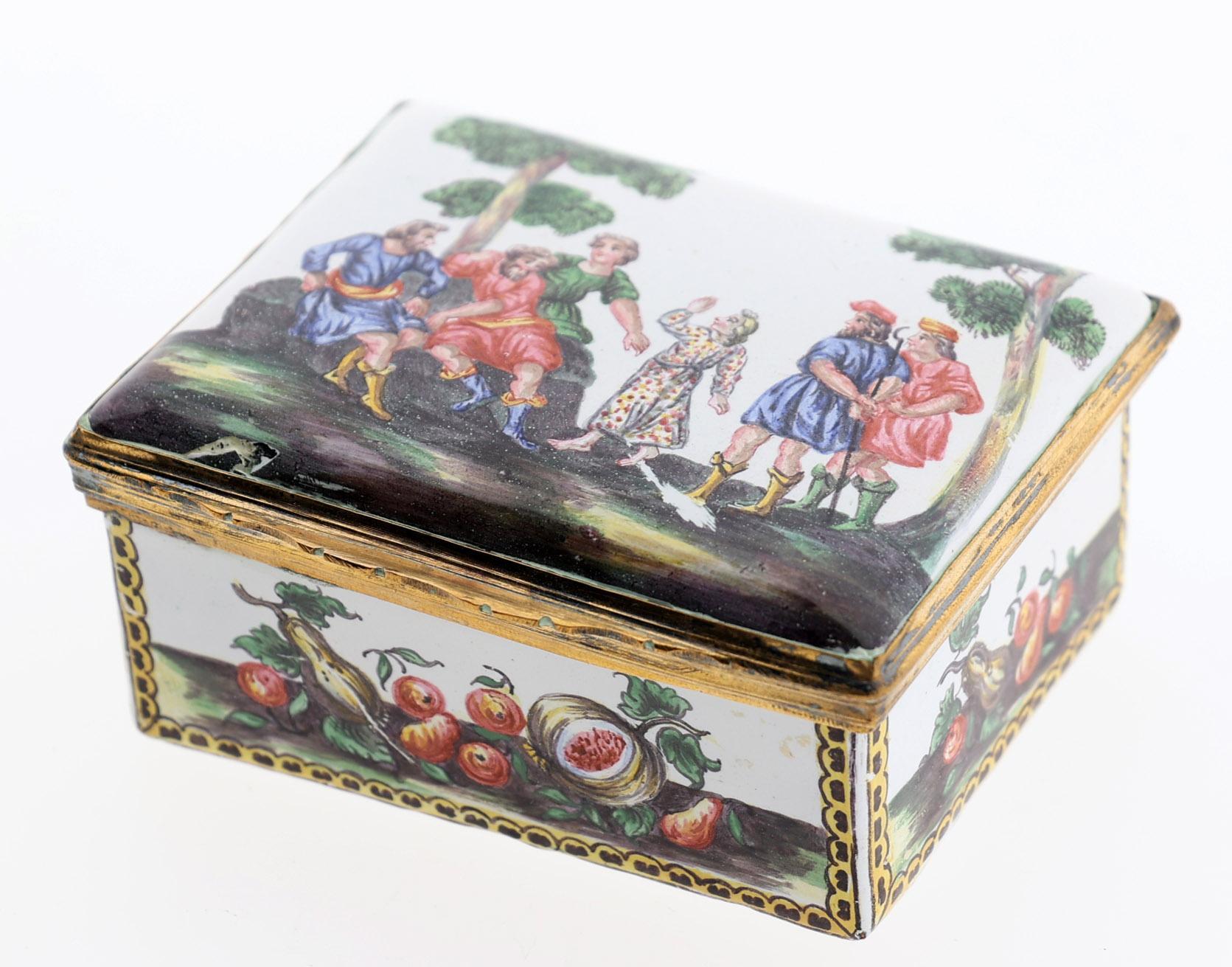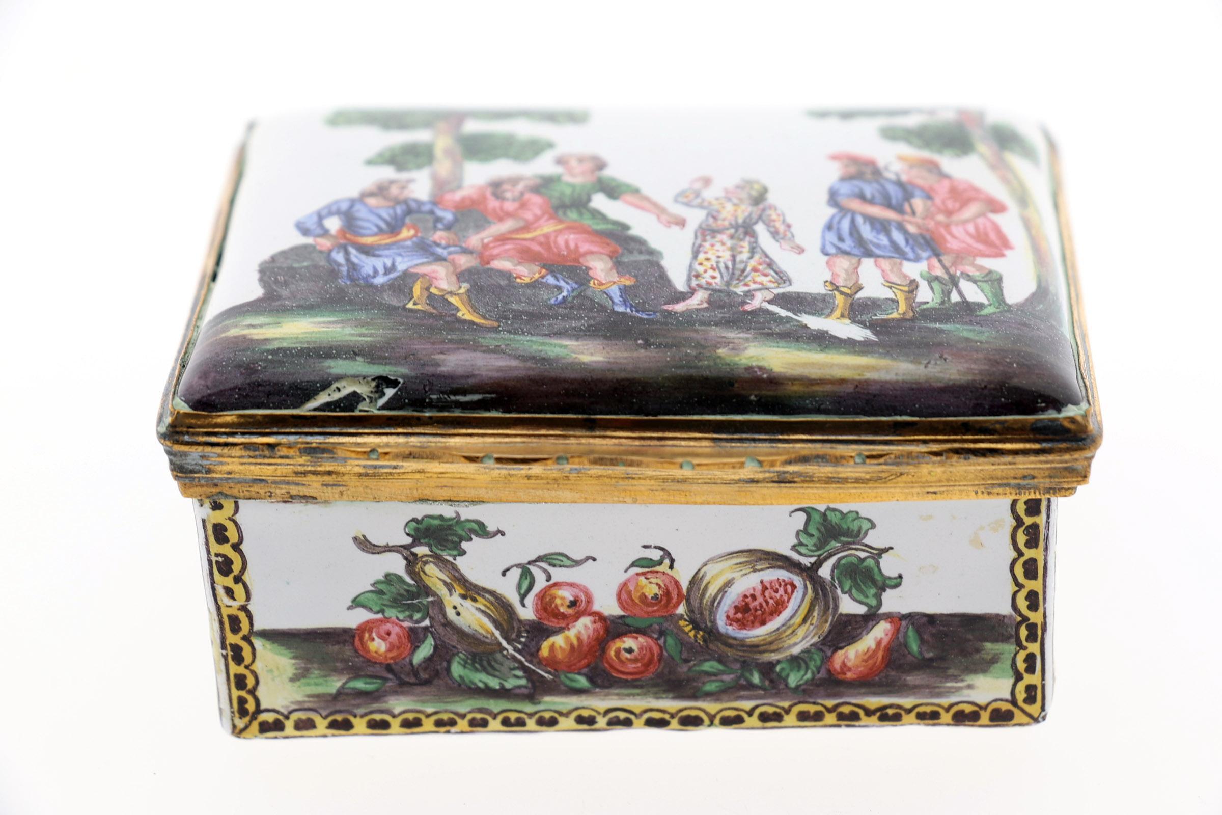 Rechthoekige emaille snuifdoos met op de deksel voorstelling van 6 Romeinse figuren in landschap en rondom gedecoreerd met vruchten en aan de onderzijde een sprinkhaan, 18e eeuw met vergulde bronzen monturen, h.4,2 x b.8,7 x d.7 cm.