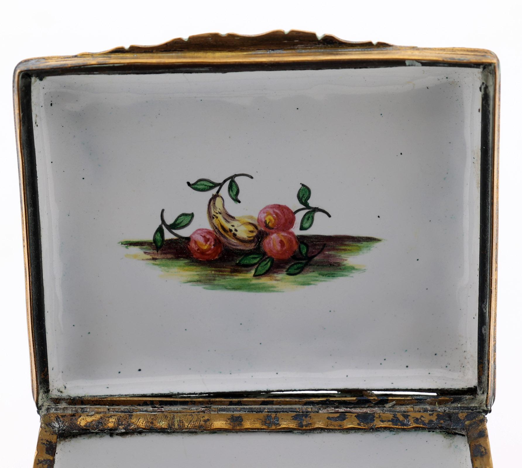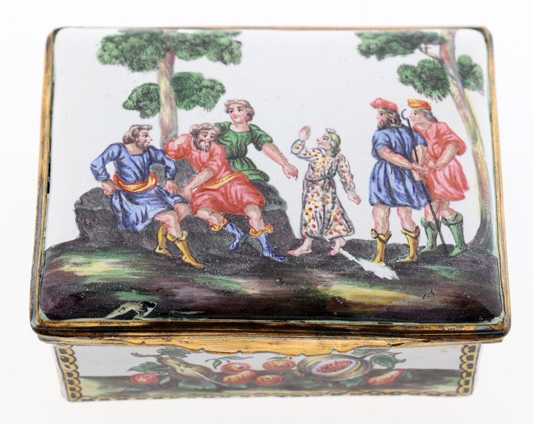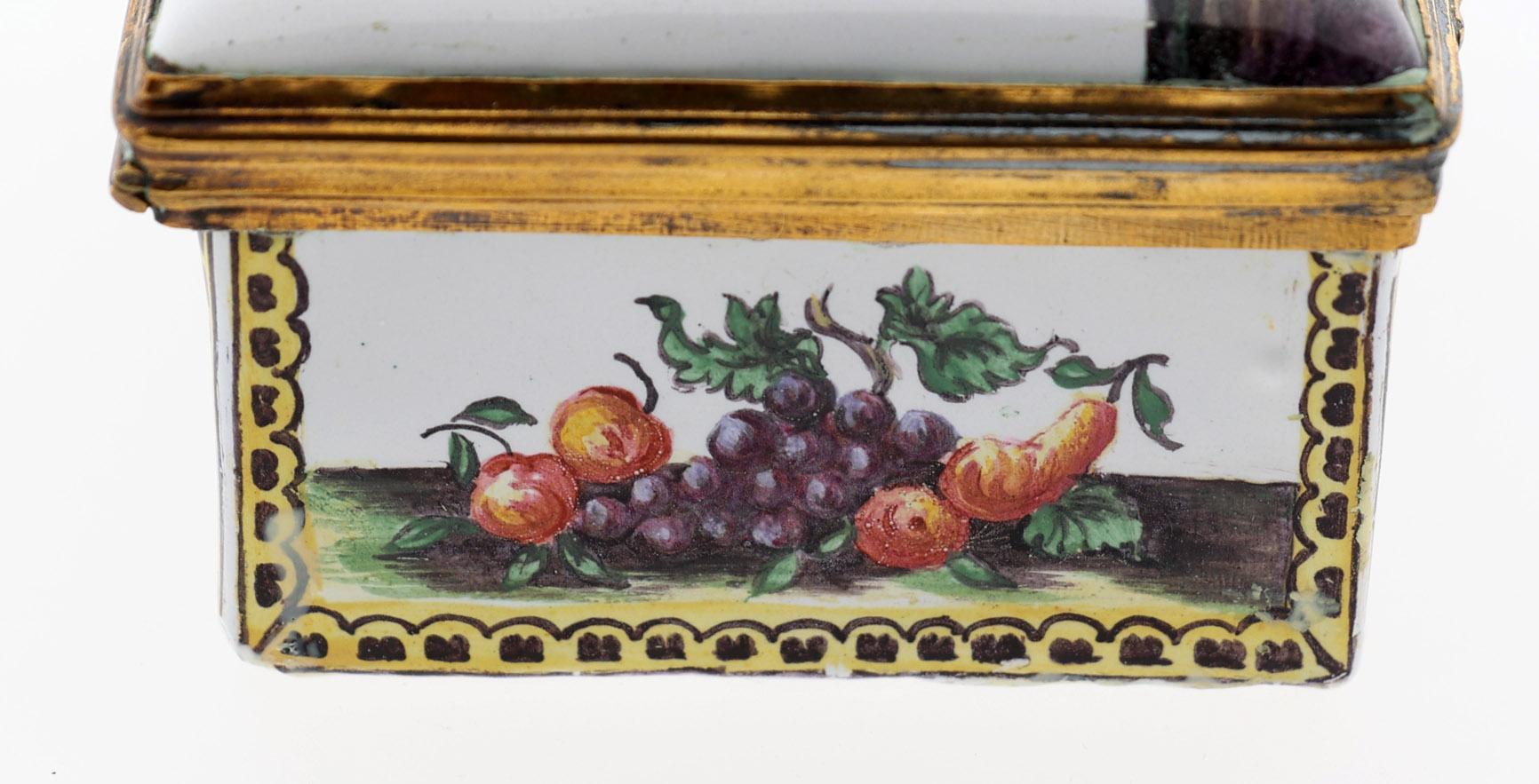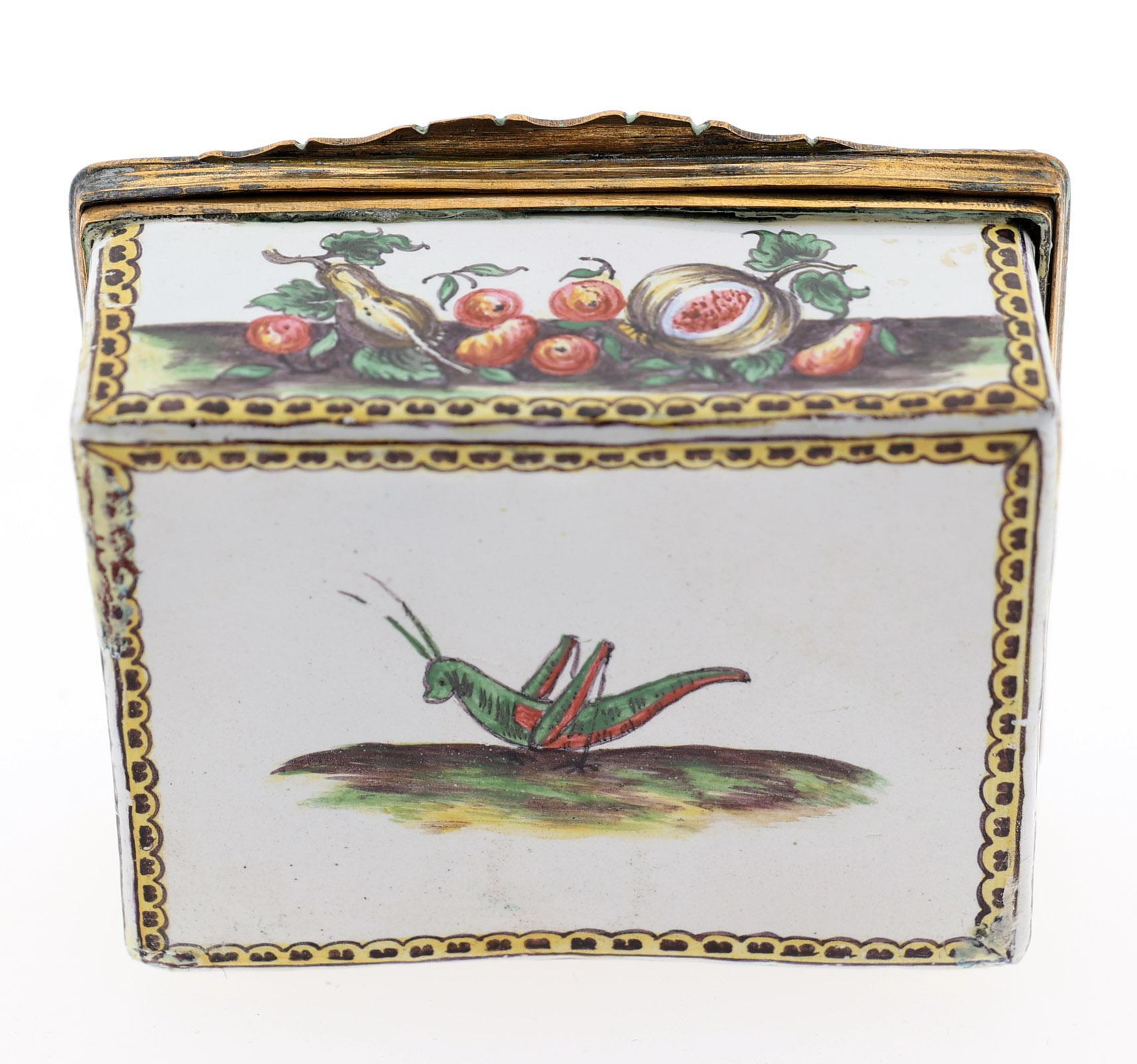 Rechthoekige emaille snuifdoos met op de deksel voorstelling van 6 Romeinse figuren in landschap en rondom gedecoreerd met vruchten en aan de onderzijde een sprinkhaan, 18e eeuw met vergulde bronzen monturen, h.4,2 x b.8,7 x d.7 cm.