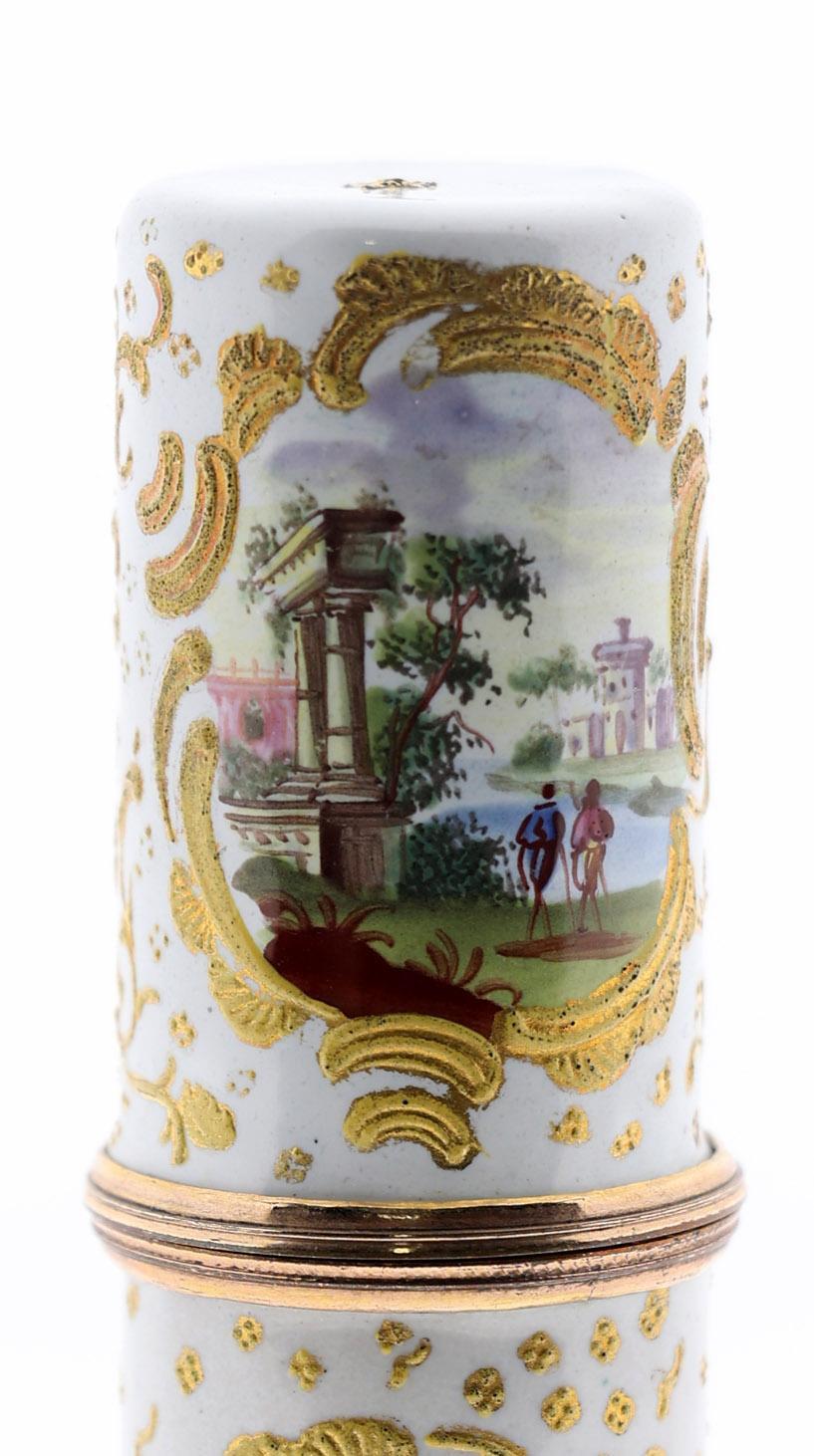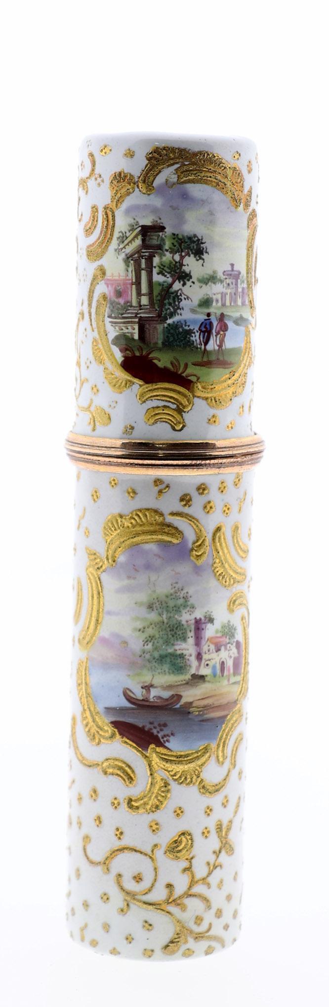 Antieke emaille odeurflacon met romantische landschappen beschilderd en met goud opgehoogd, gouden randen en ornamenten, kristallen binnenfles met zilveren dop, Engeland ca.1765, h.11,5 cm.