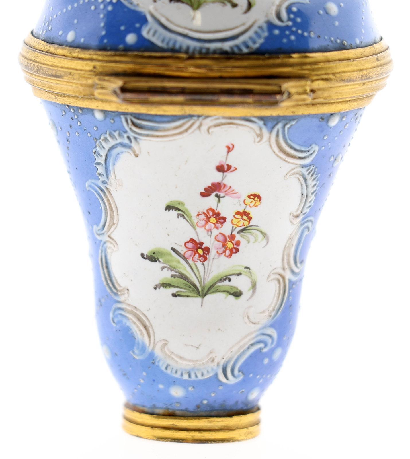 Antieke emaille sponzendekseldoosje met bloemen beschilderd en afgewerkt met verguld brons met oude dop een vis, 18e eeuw