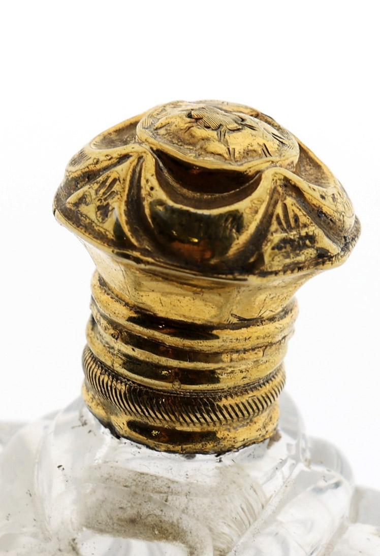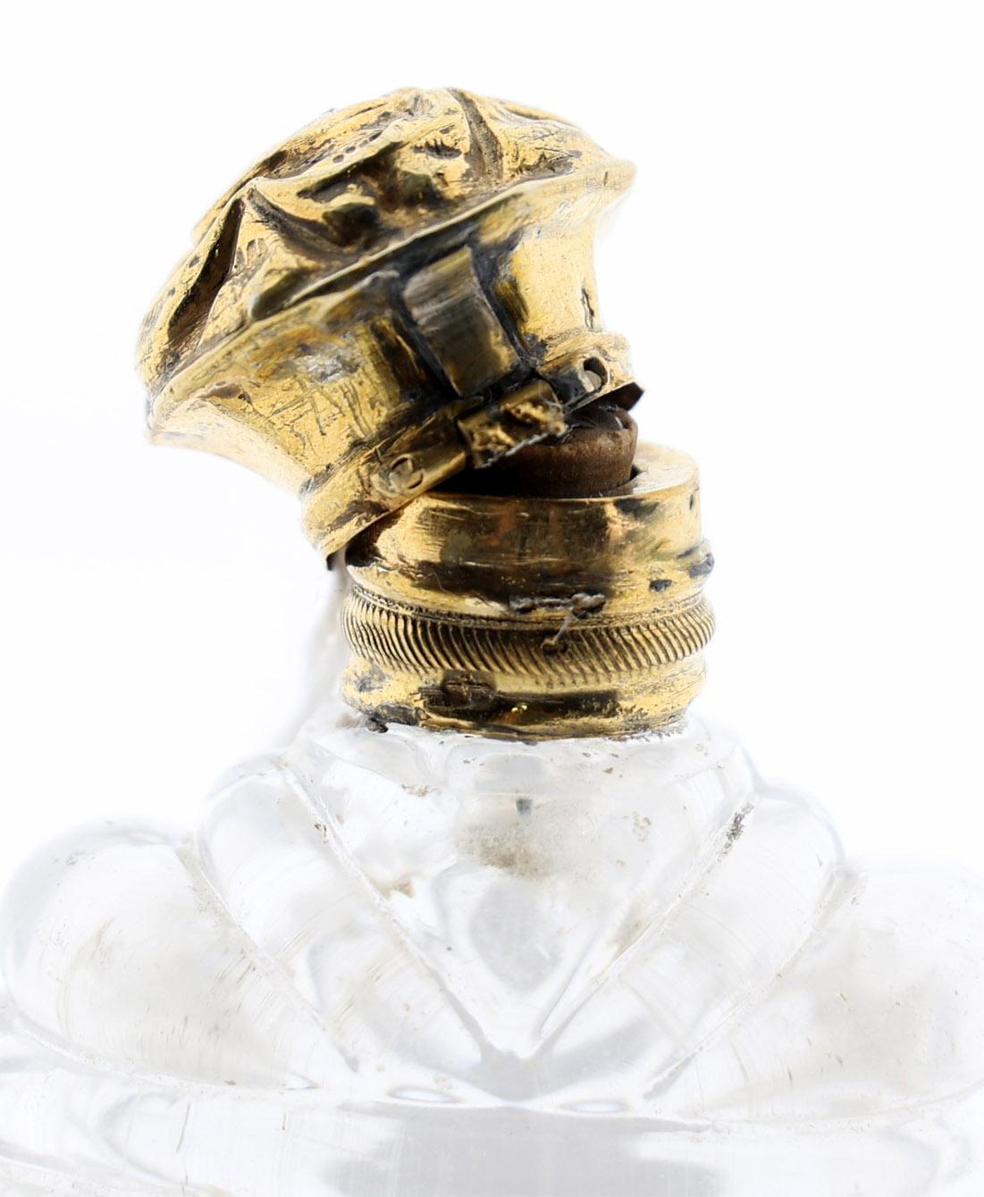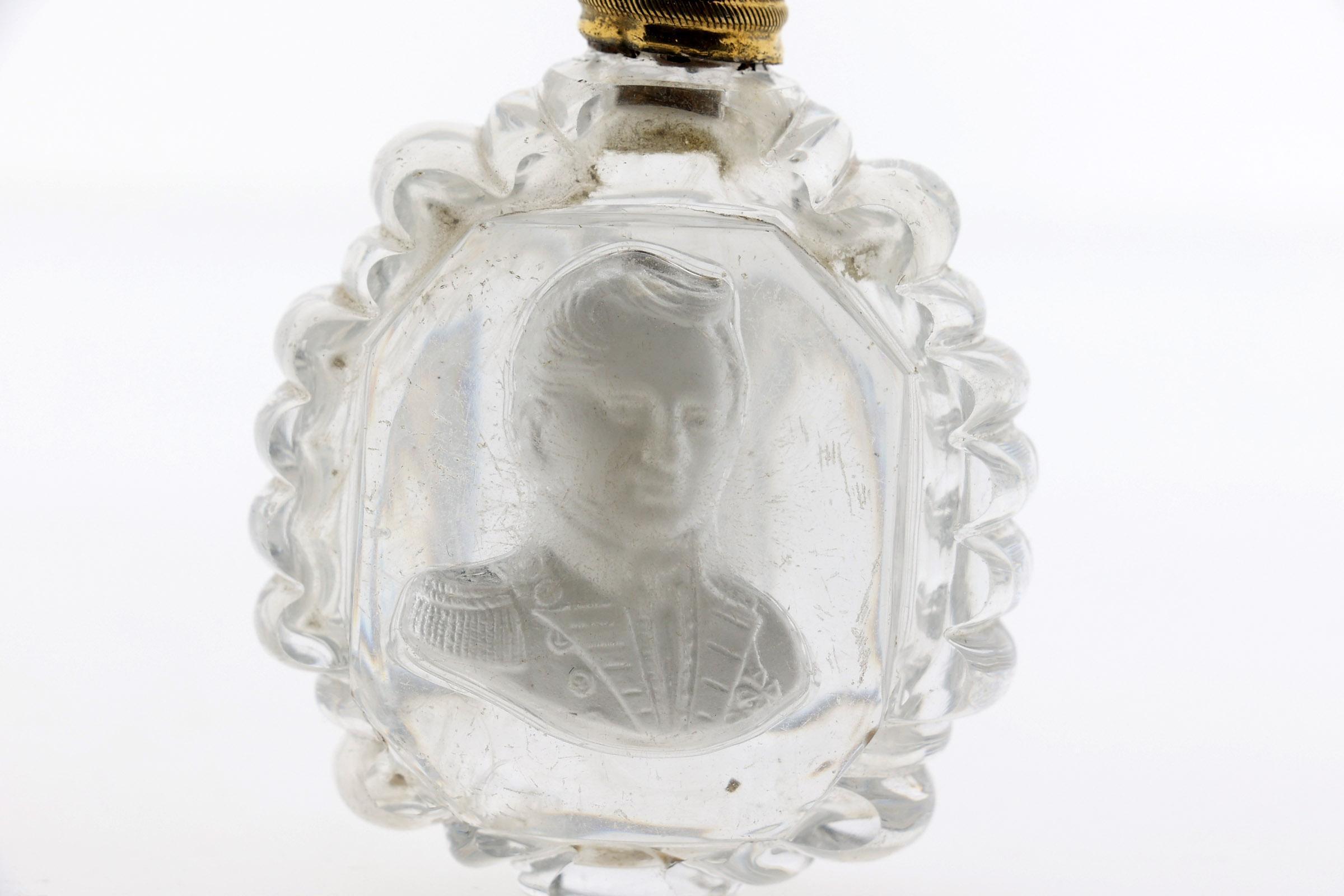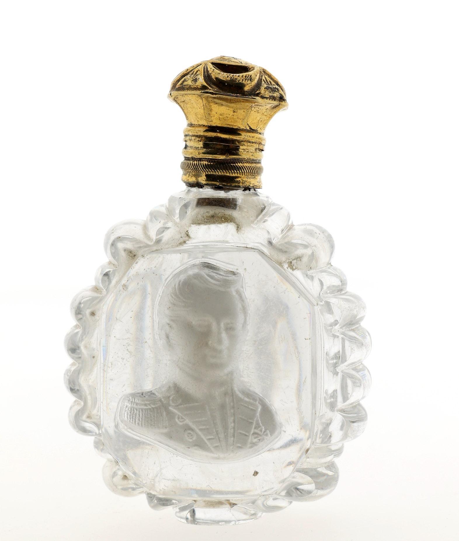 Antieke kristallen odeurflacon met sulfide afbeelding van J.C.J. van Speyk, midden 19e eeuw met scharnierend verguld zilveren montuur, gekeurd met zwaardje, Nederlands, h.8 cm.