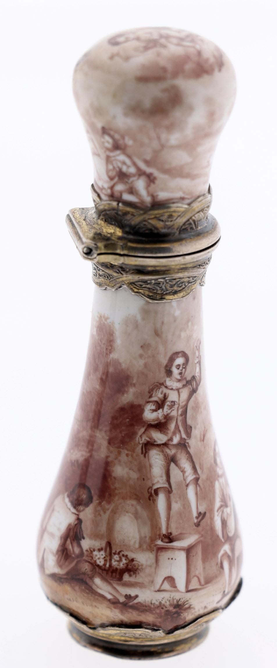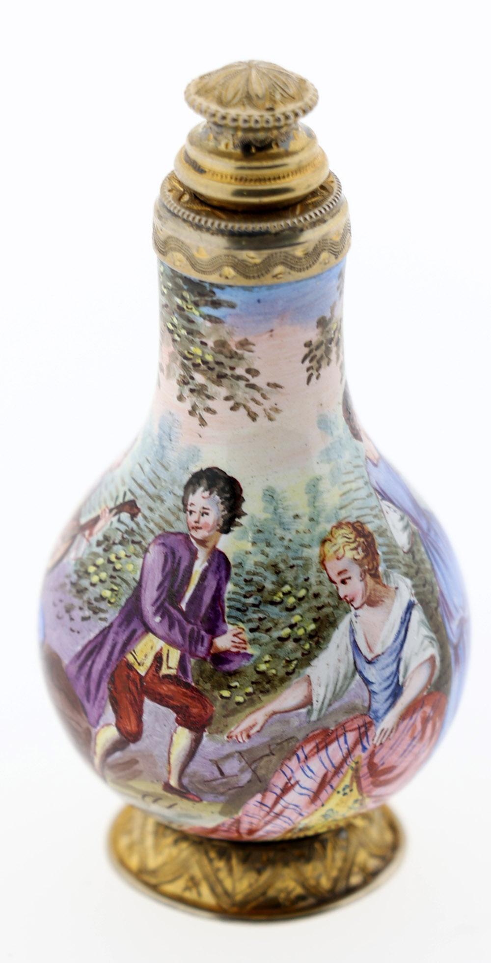 Roze emaille grisaille odeurflacon, Frankrijk, 1860, Weens bolvormig emaille verguld zilveren flacon ca.1860 en een Franse emaille fles odeurflacon ca. 1830