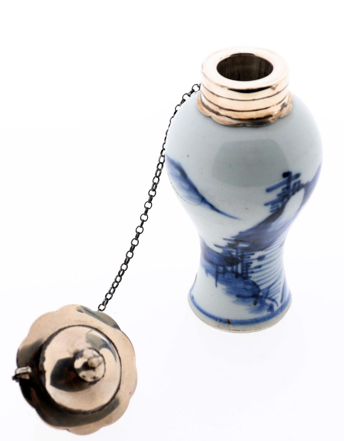 Antieke blauw/wit met landschap gedecoreerde Chinees porseleinen odeurflacon met 2e gehalte zilveren dop en omranding, h.20 cm.