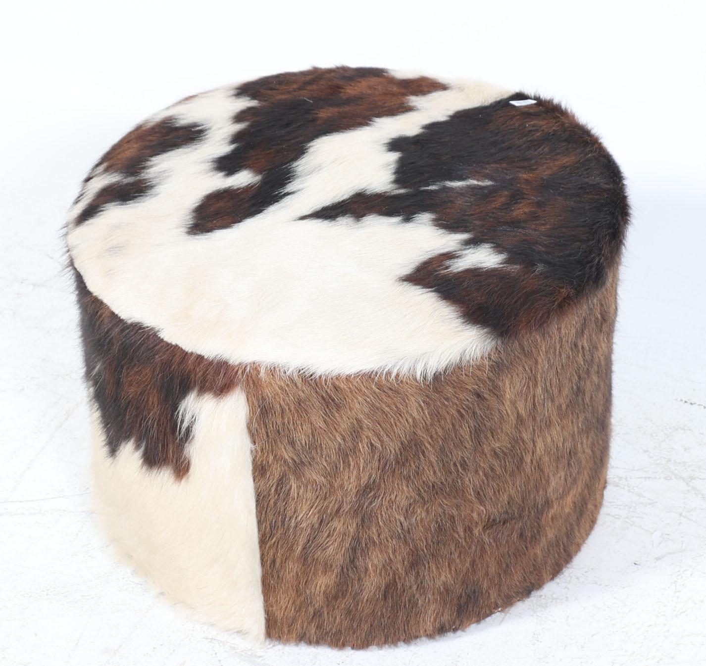 Poef van koeienhuid, h.36 x diam.51 cm.