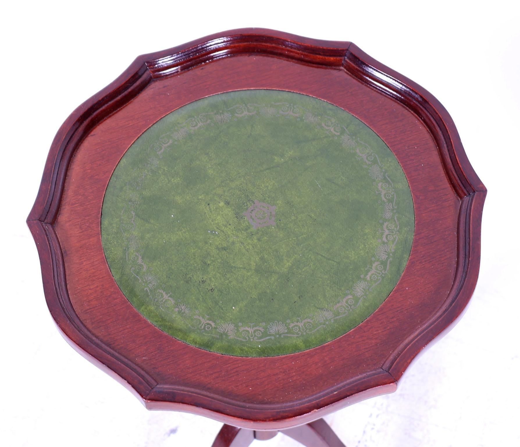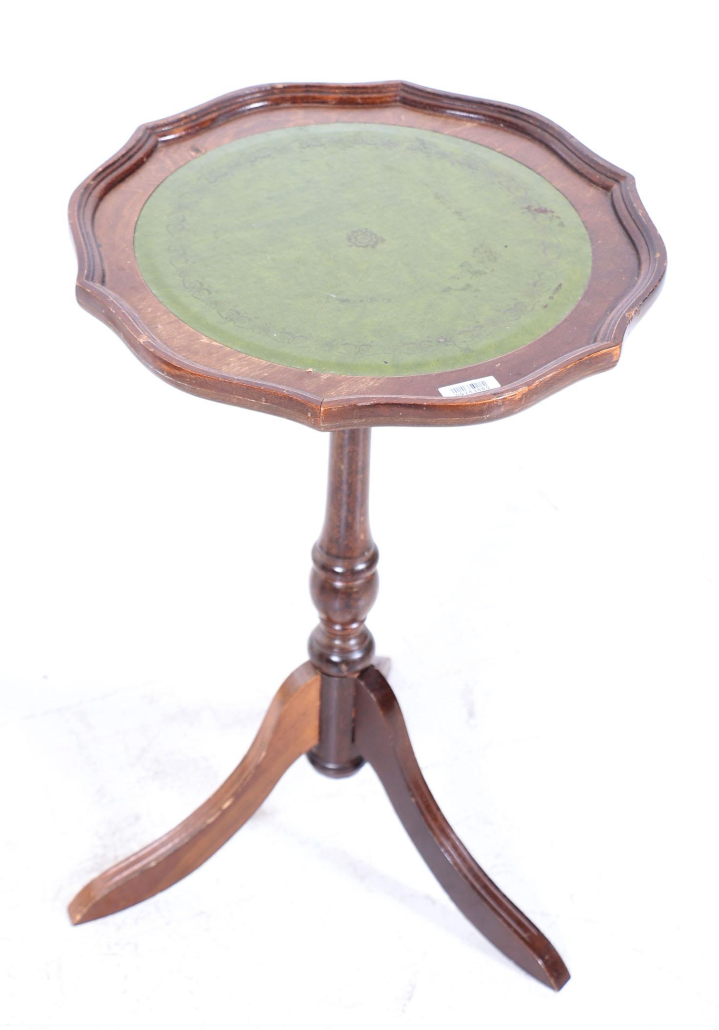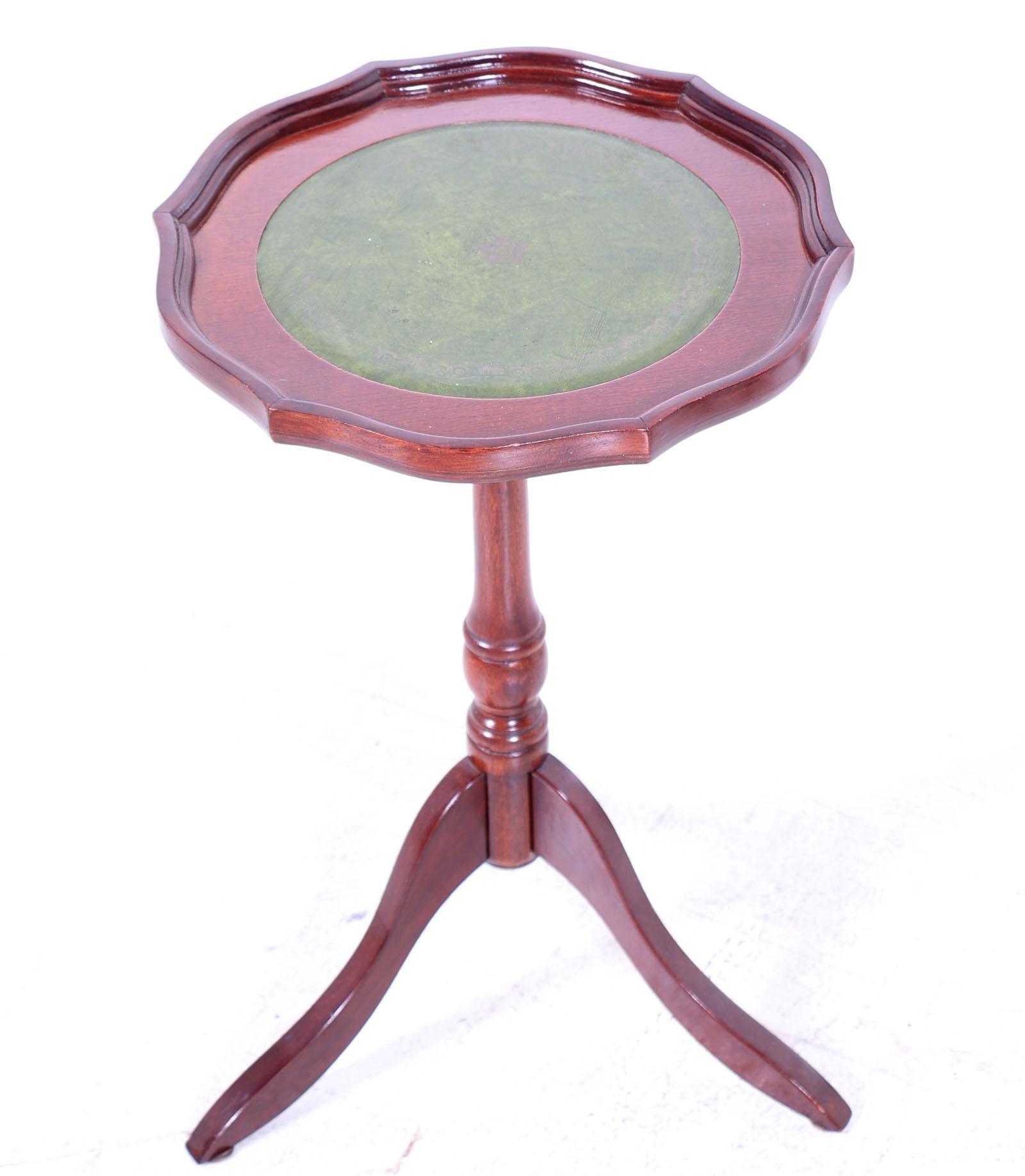 2 diverse notenhouten wijntafeltjes met groen lederen blad, h.52 x diam.34 cm.