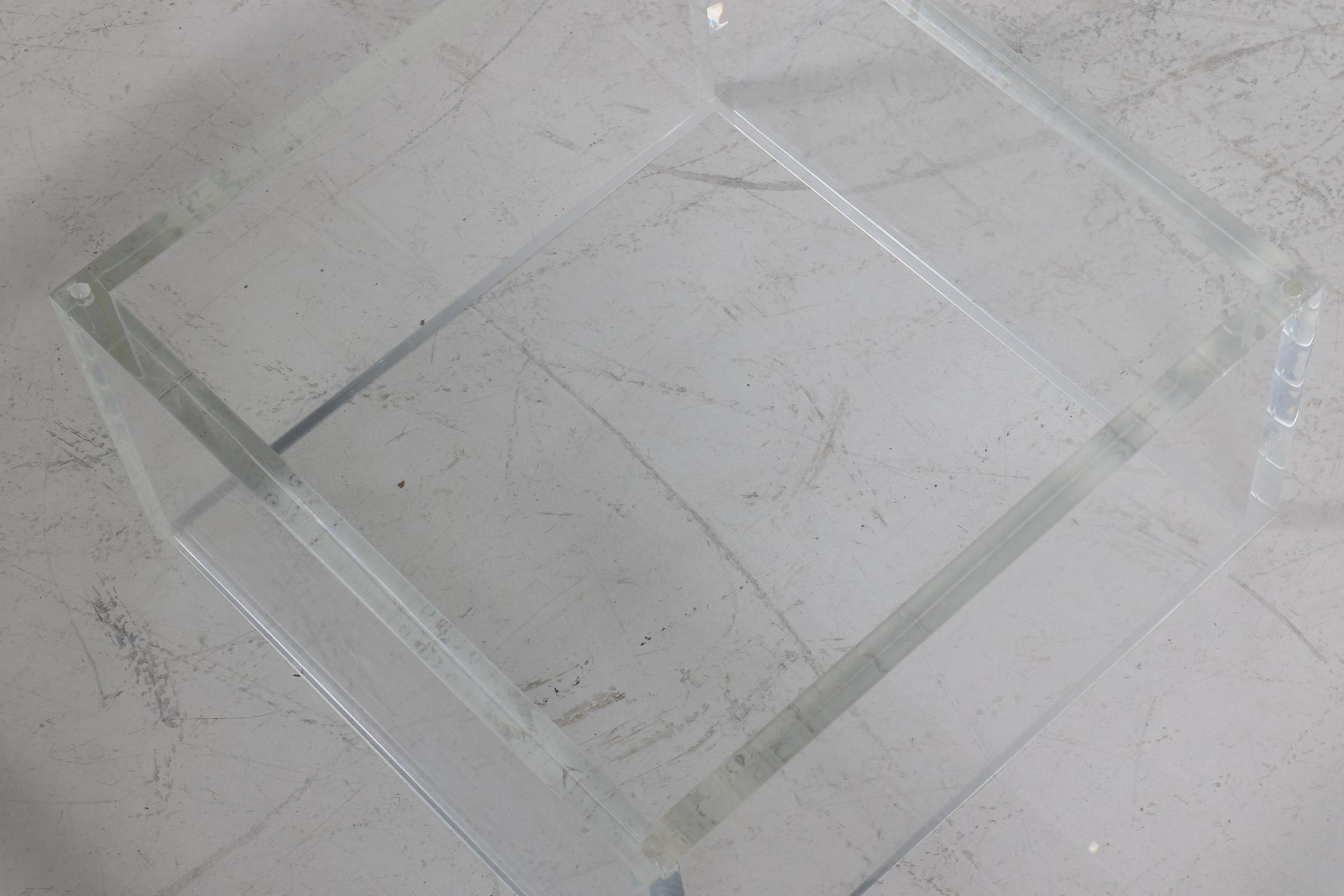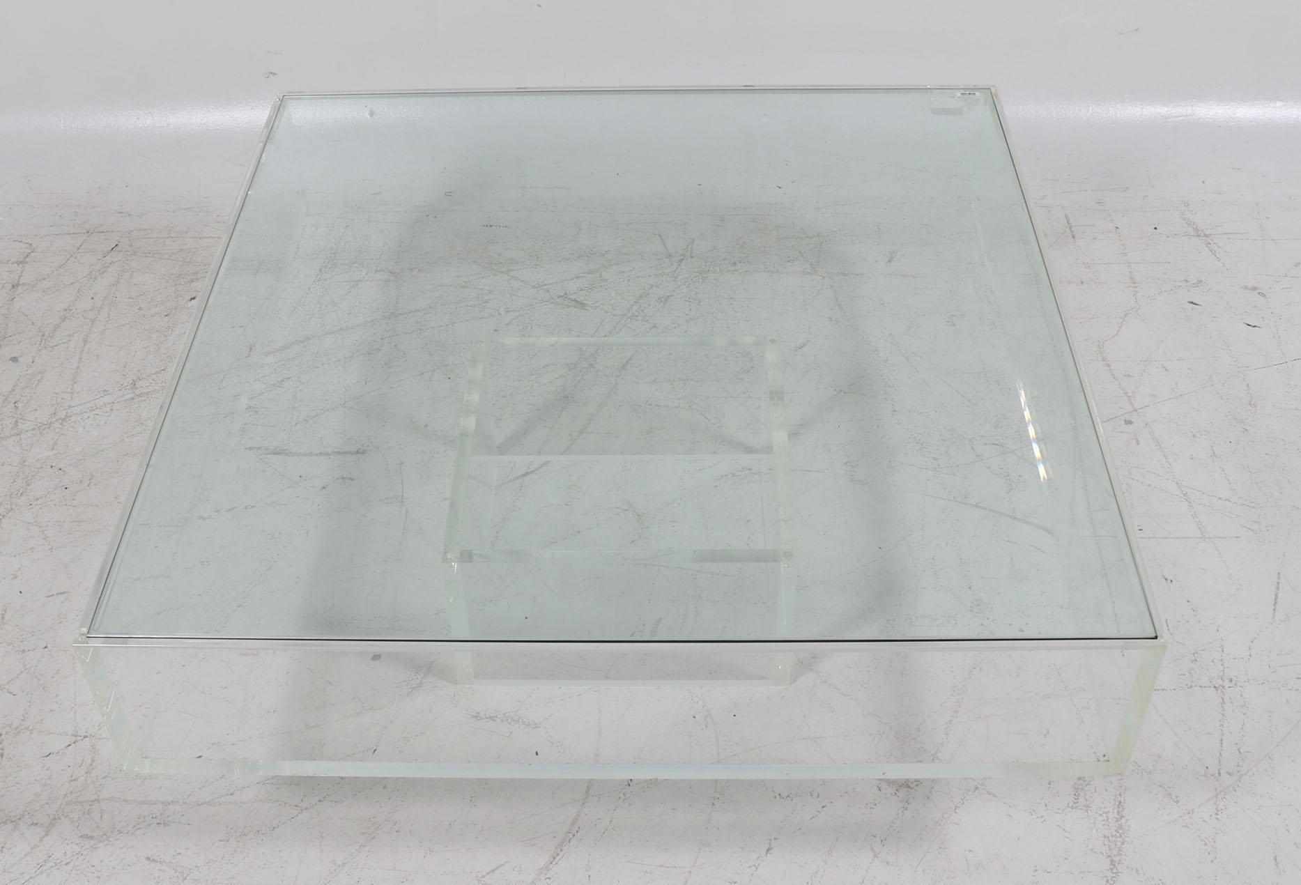 Plexiglazen salontafel met glazen blad, h.40 x b.100 x d.100 cm.