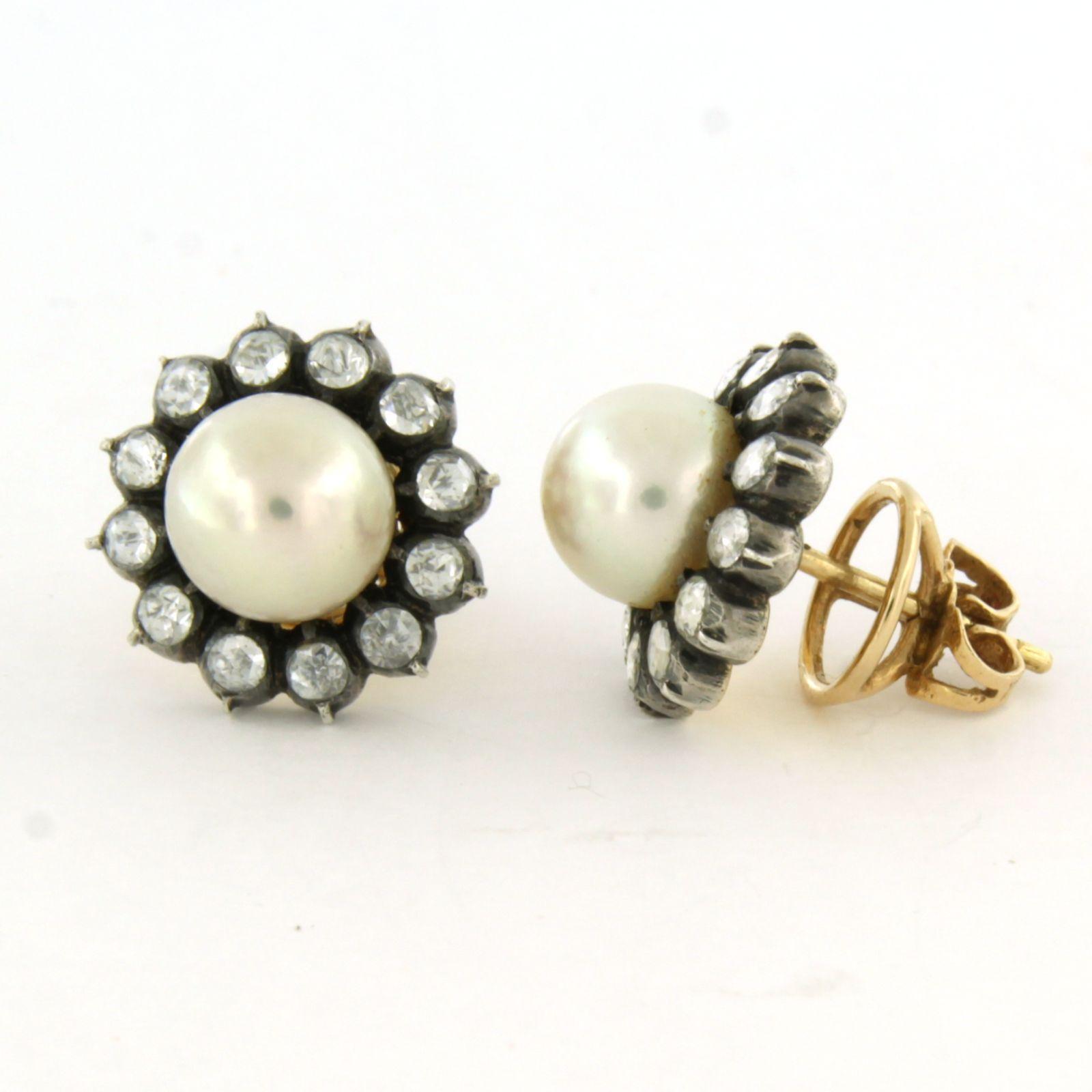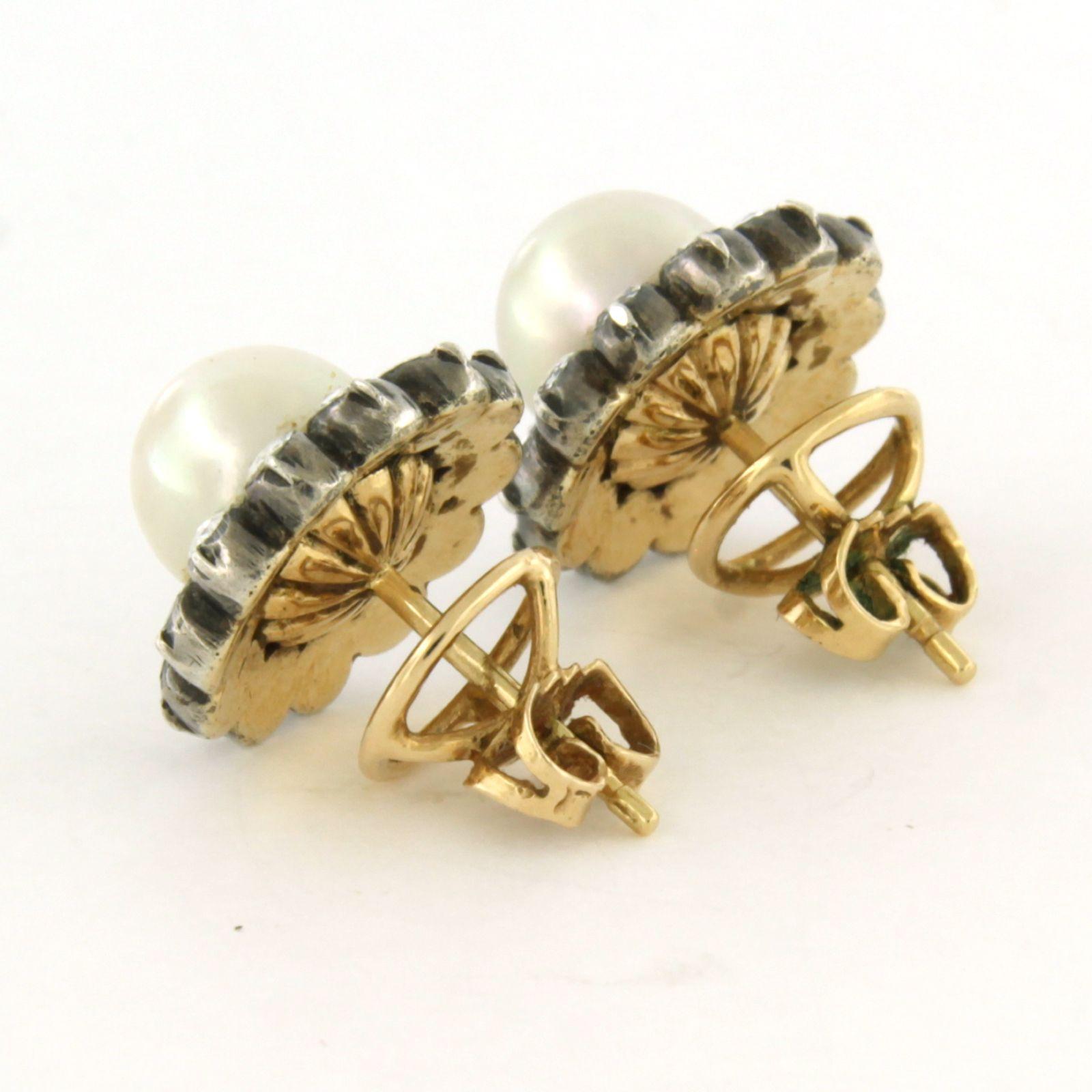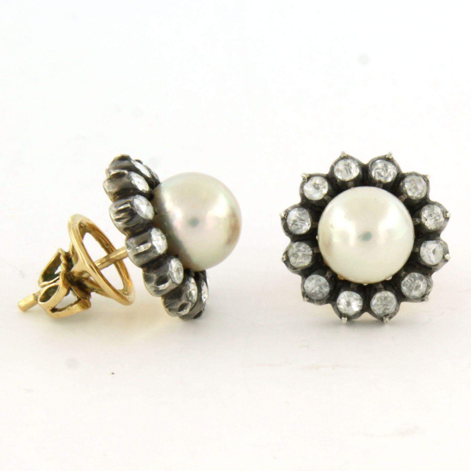 14 Kt. gouden met zilver oorknoppen bezet met parel en roosgeslepen diamant, totaal circa 1.00 ct. – G/H – SI