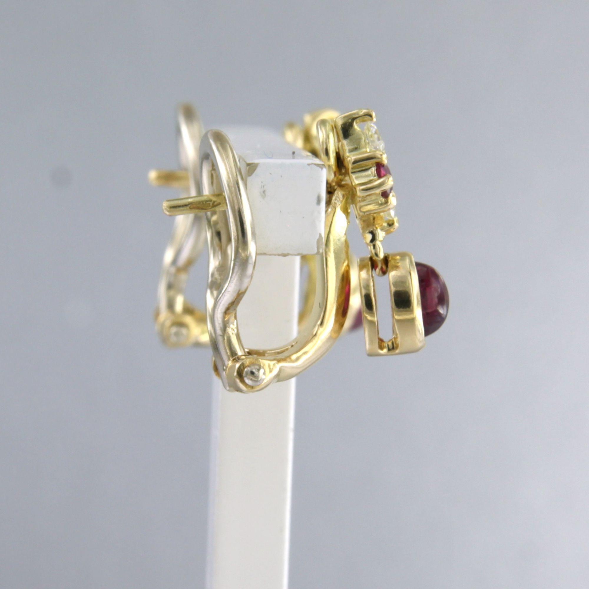 18 Kt. geelgouden oorclips bezet met robijn en briljant geslepen diamant tot. 0.10 ct.