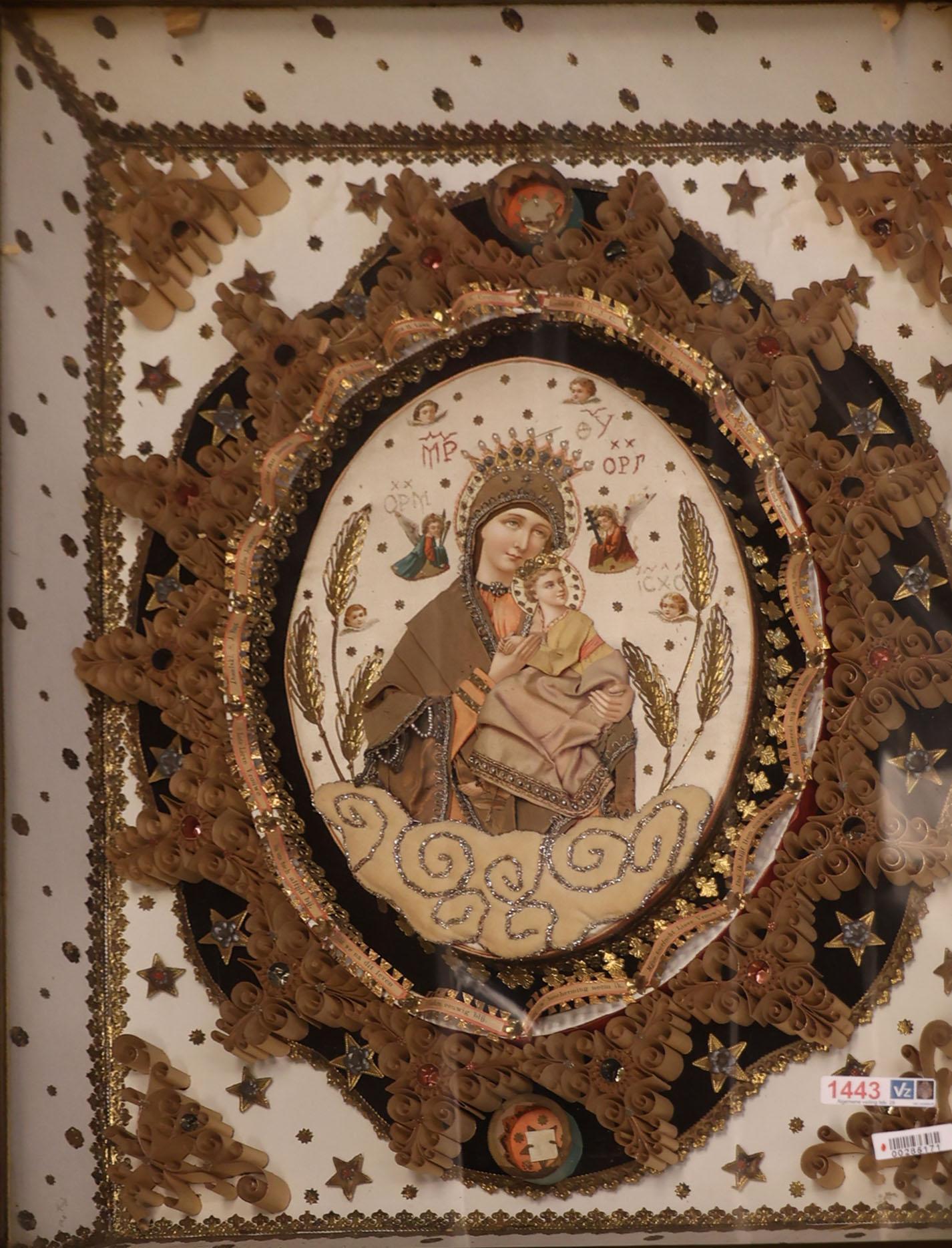 Religieus deels geborduurde relikwie-kabinetje met afbeelding van Maria, 61 x 50 x d.7 cm.