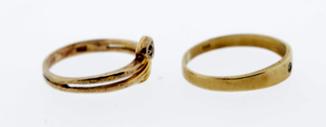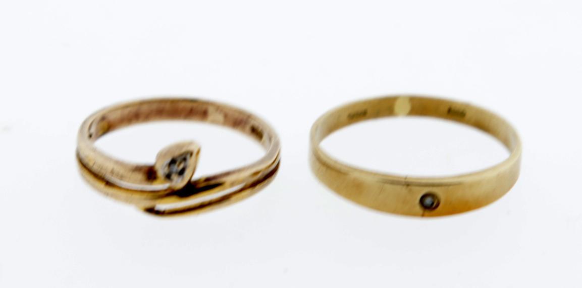 Twee diverse gouden damesringen bezet met briljant geslepen diamant