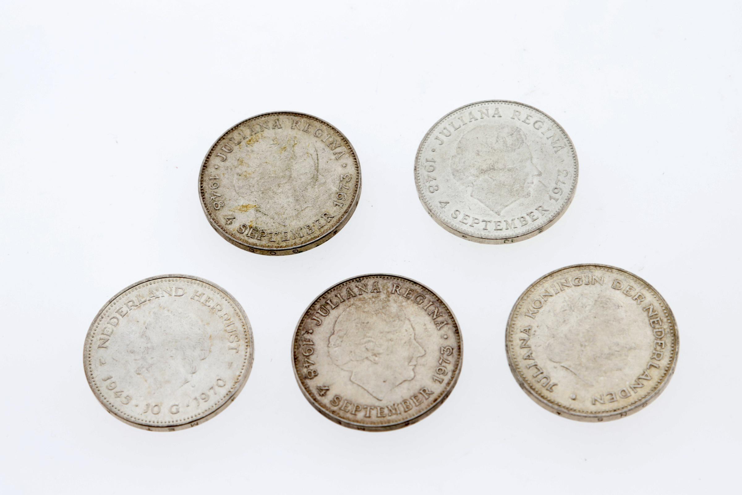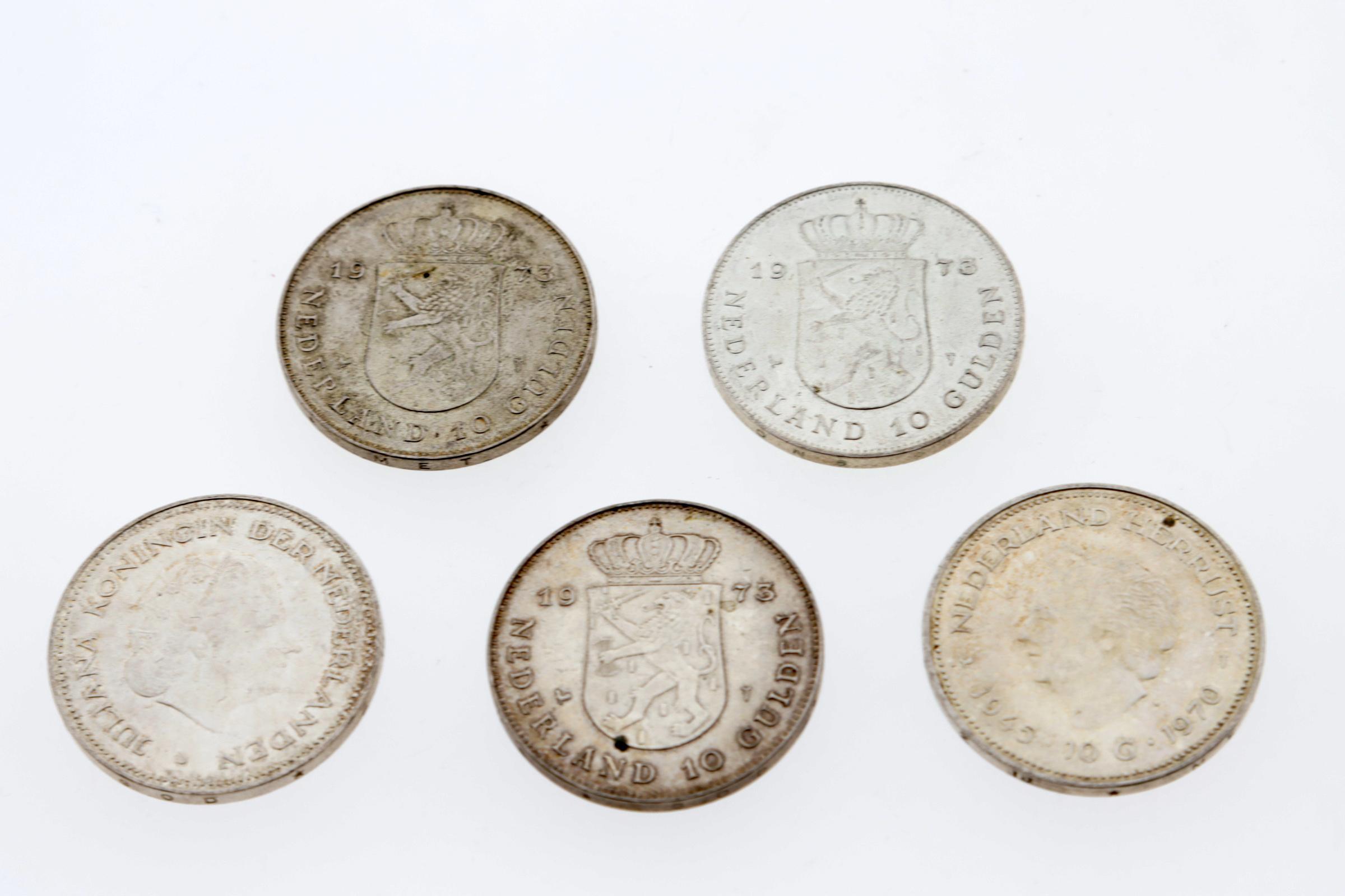 5 Zilveren 10 gulden muntstukken, Koningin Juliana-Wilhelmina, 1973, zilvergewicht 125 gram