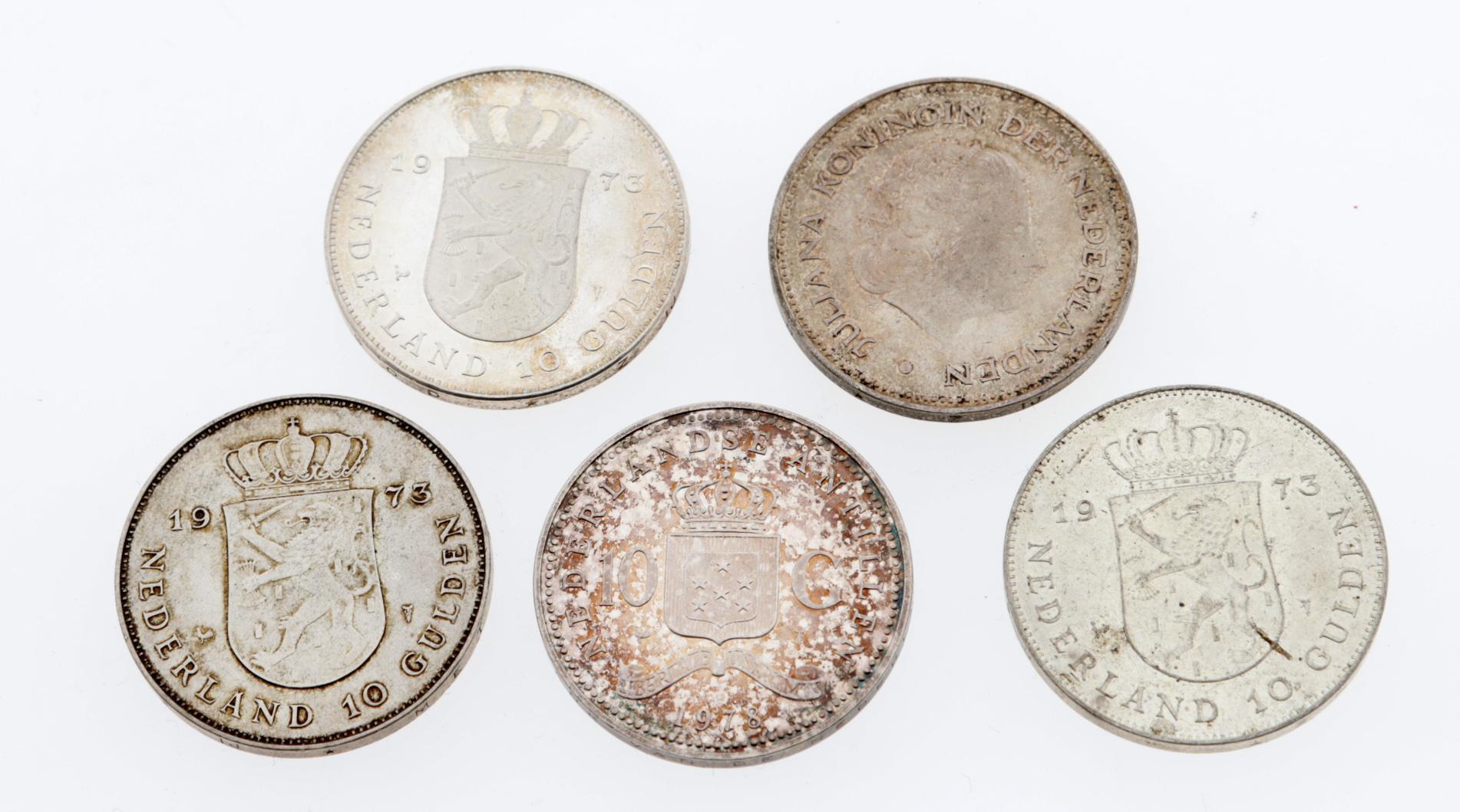 5 Zilveren 10 gulden muntstukken, Koningin Juliana-Wilhelmina, 1973, zilvergewicht 125 gram