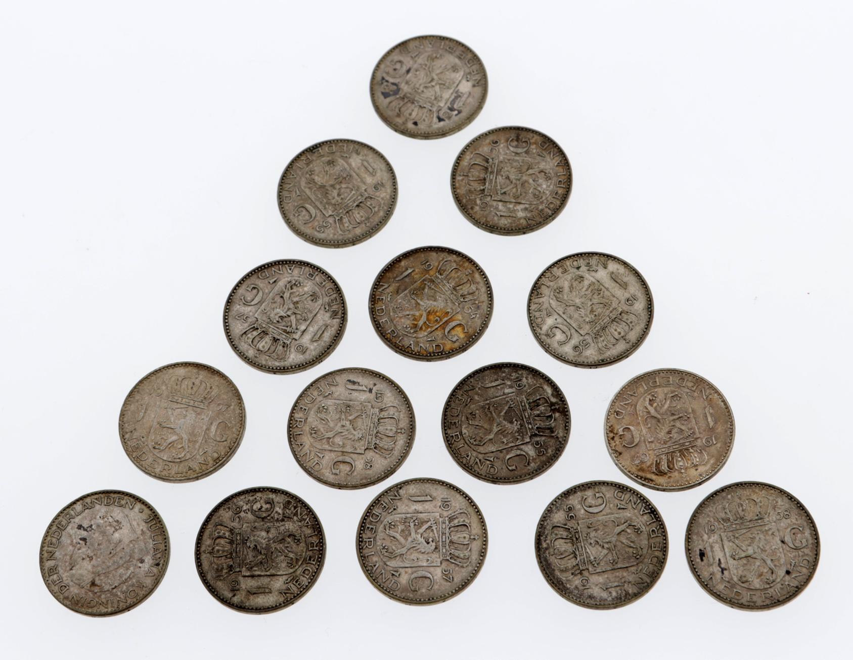 15 Zilveren gulden mutstukken, Koningin Juliana, diverse jaren, zilver gewicht 100 gram