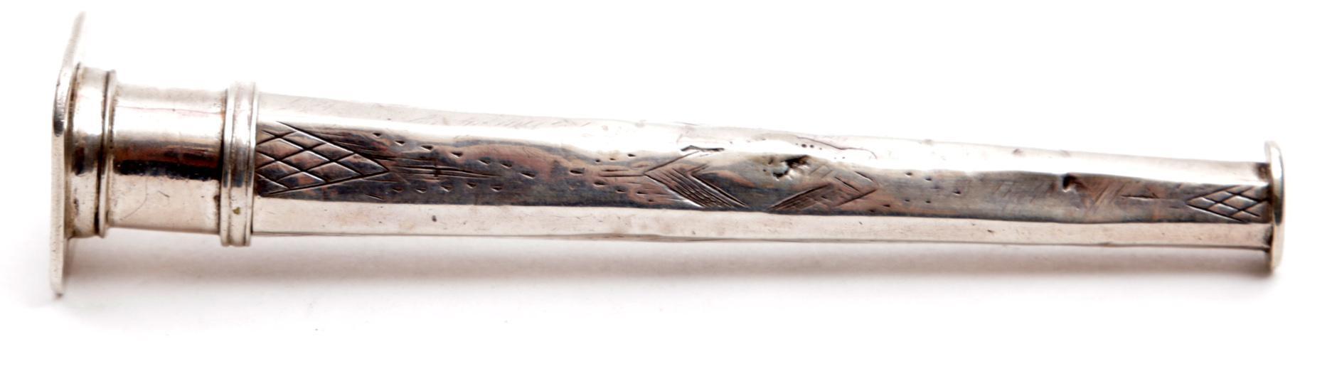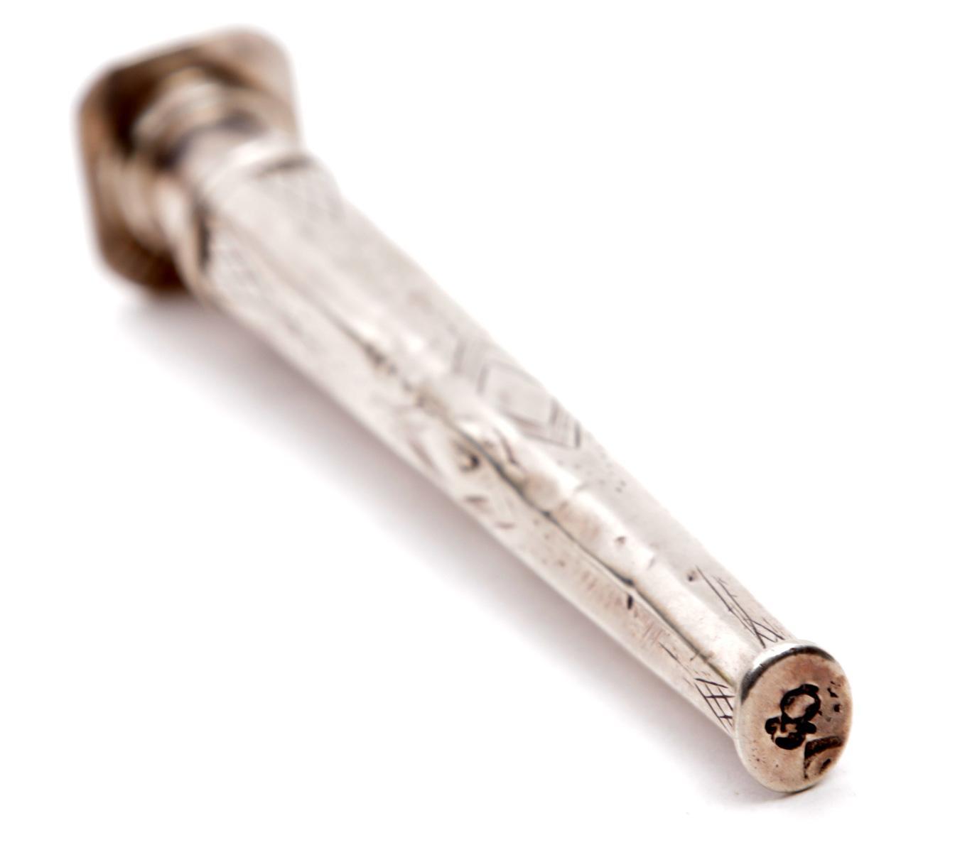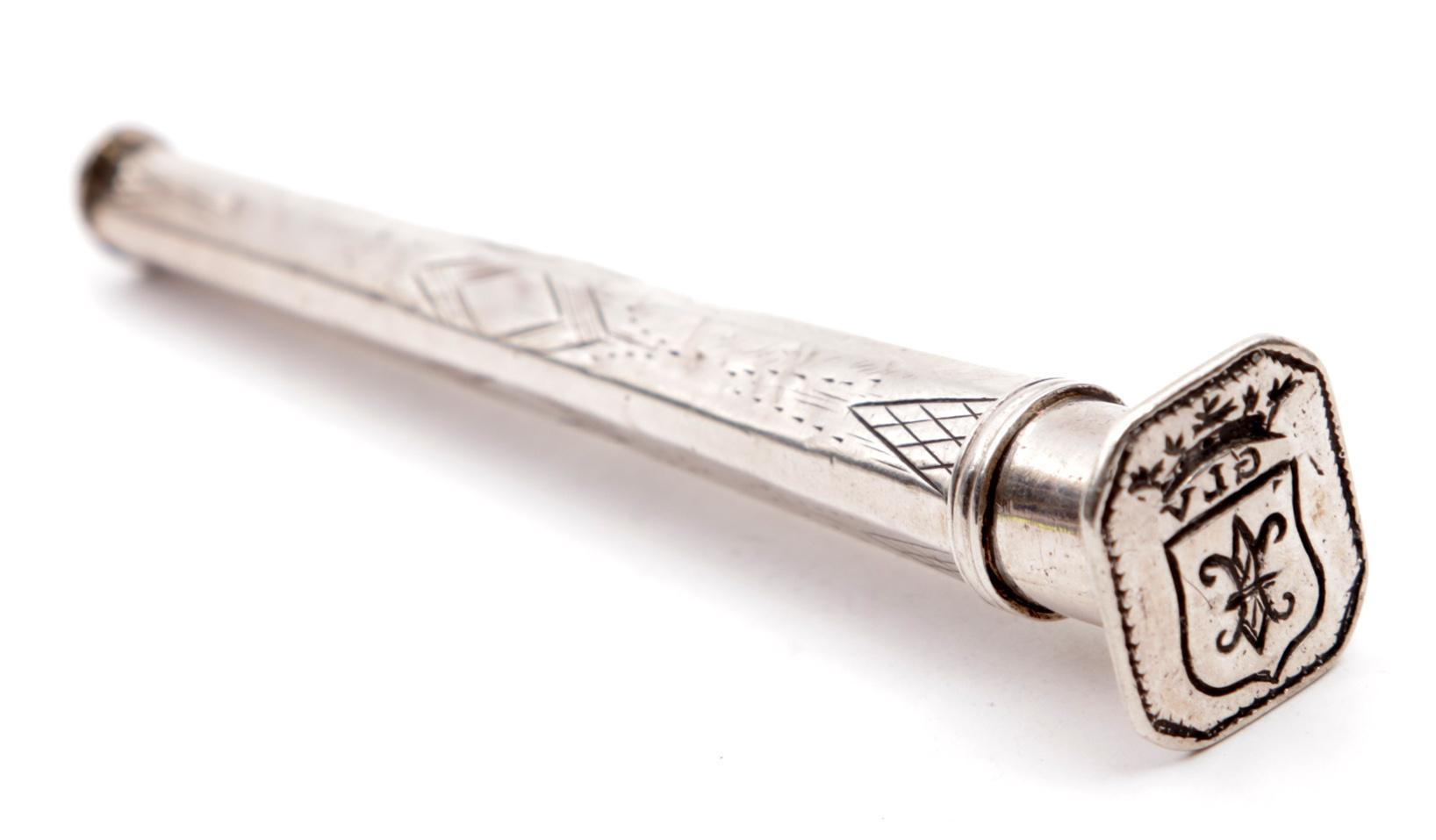 Zilveren naaldenkoker met wapen lakstempel, ca.1800, 9,5 cm.