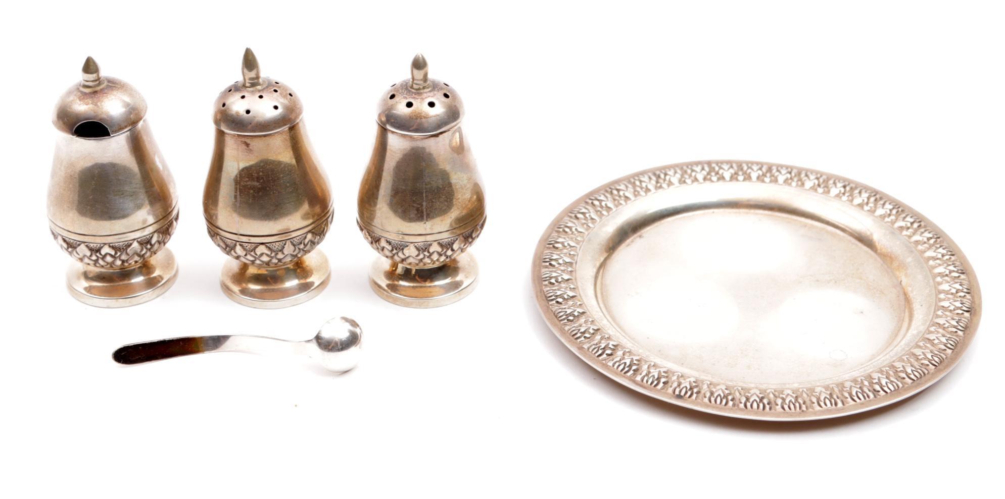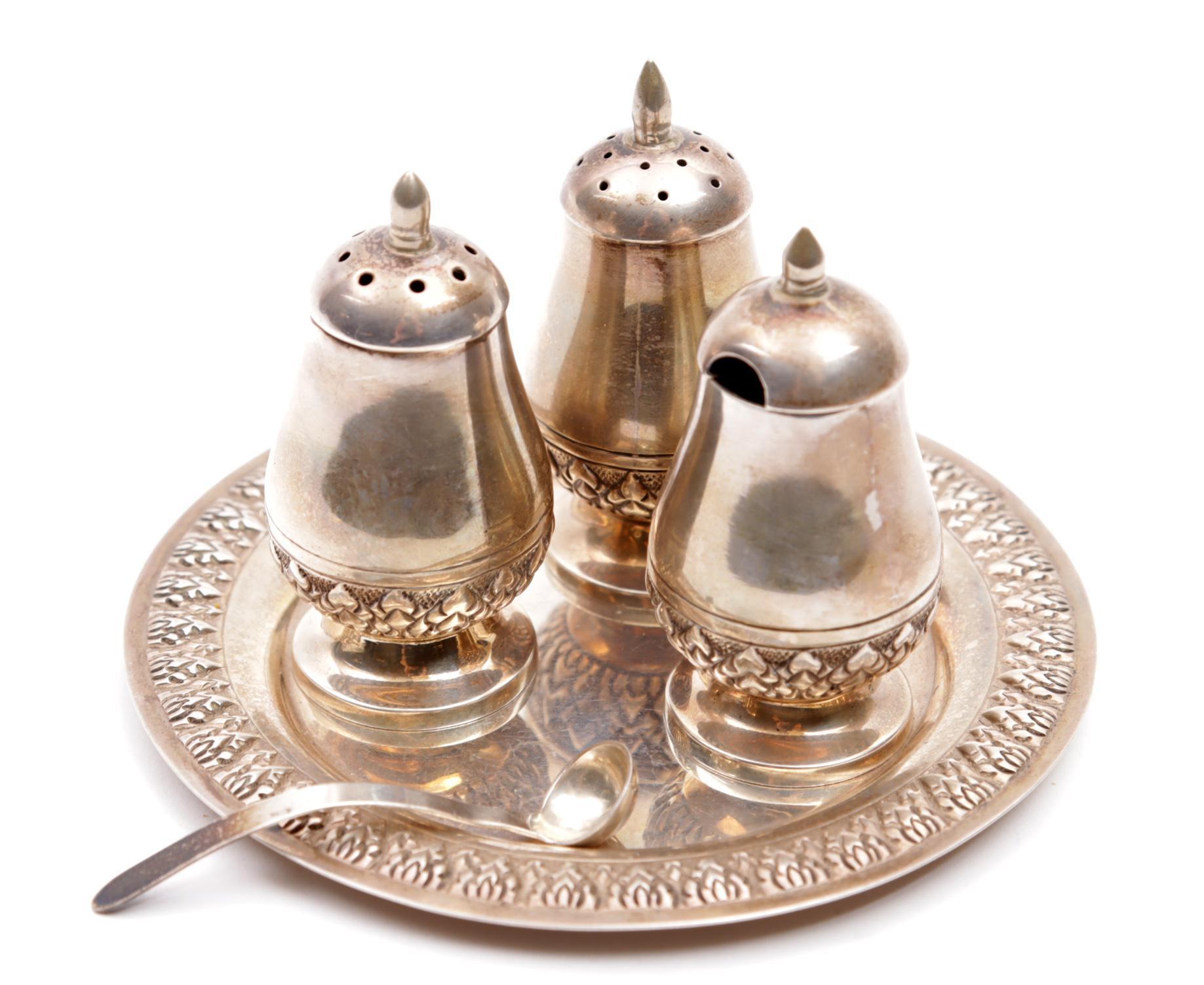 2 Zilveren strooiers en mosterdpotje met lepel op zilveren dienblaadje, 135 gram