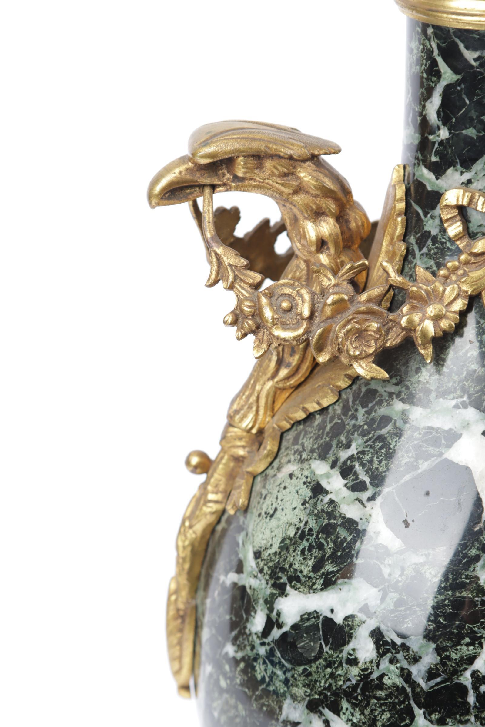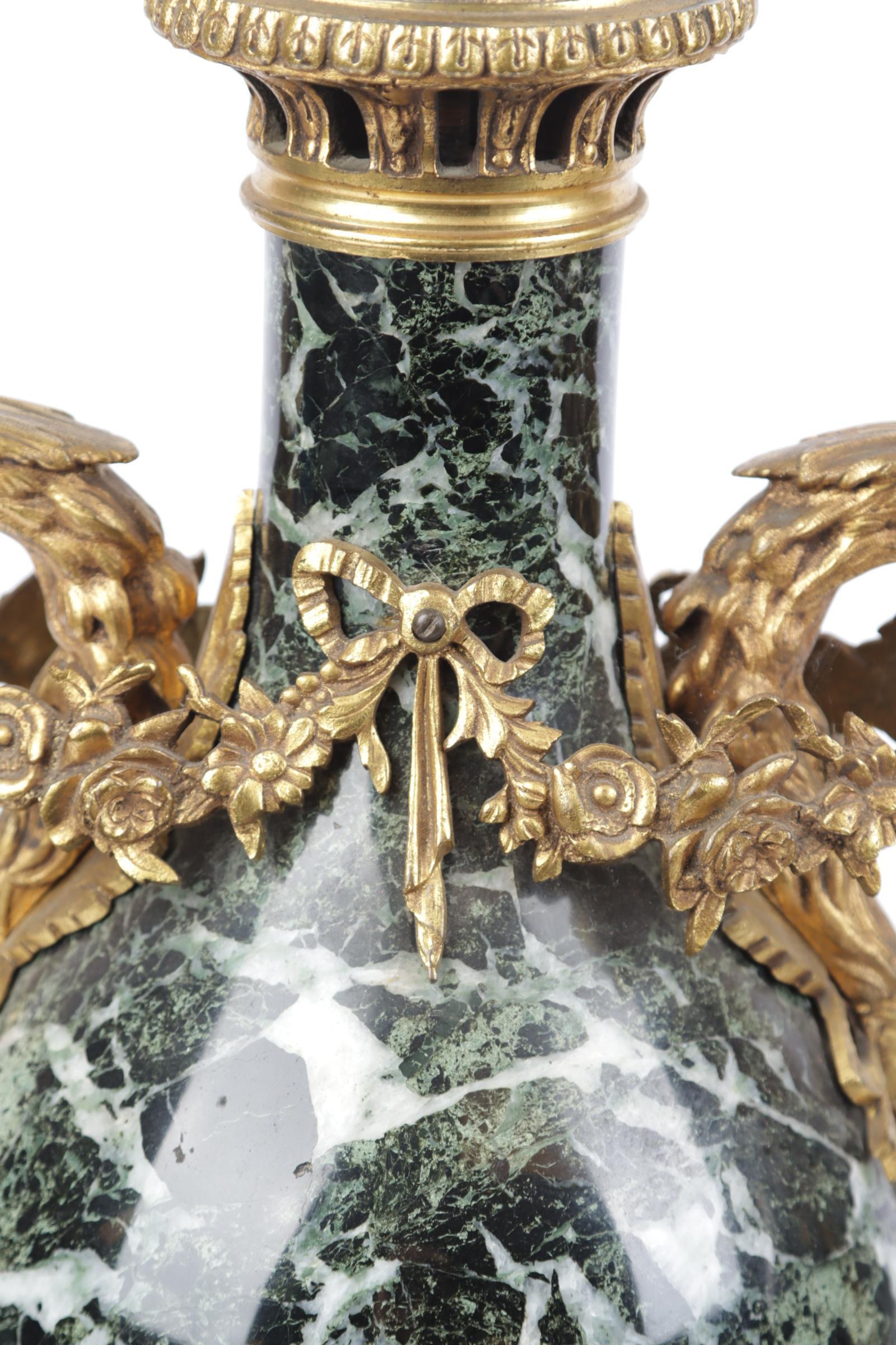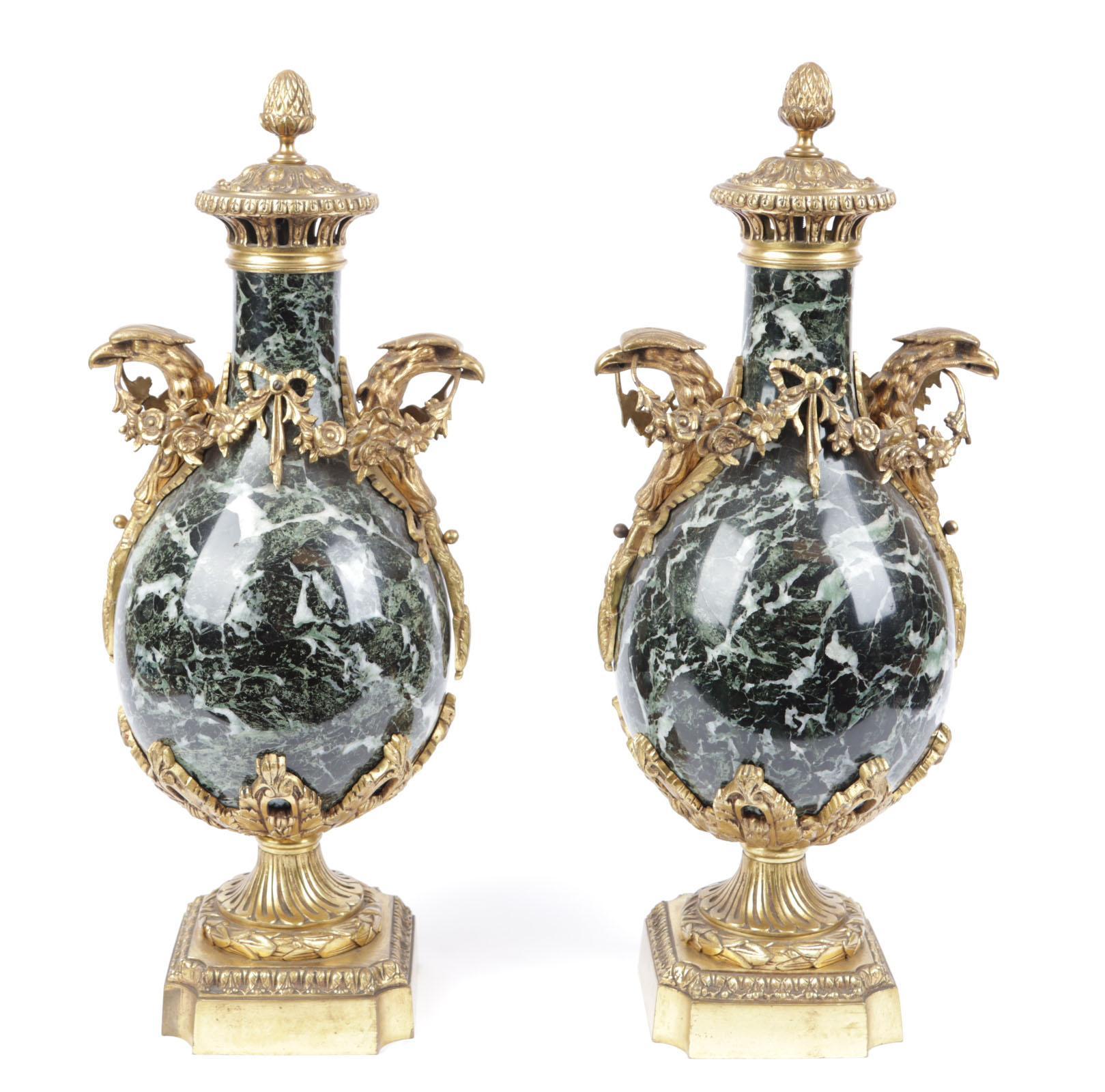 Twee groen marmeren cassolettes met brons afgezet en met gieren koppen, 19e eeuw, h.50 cm.